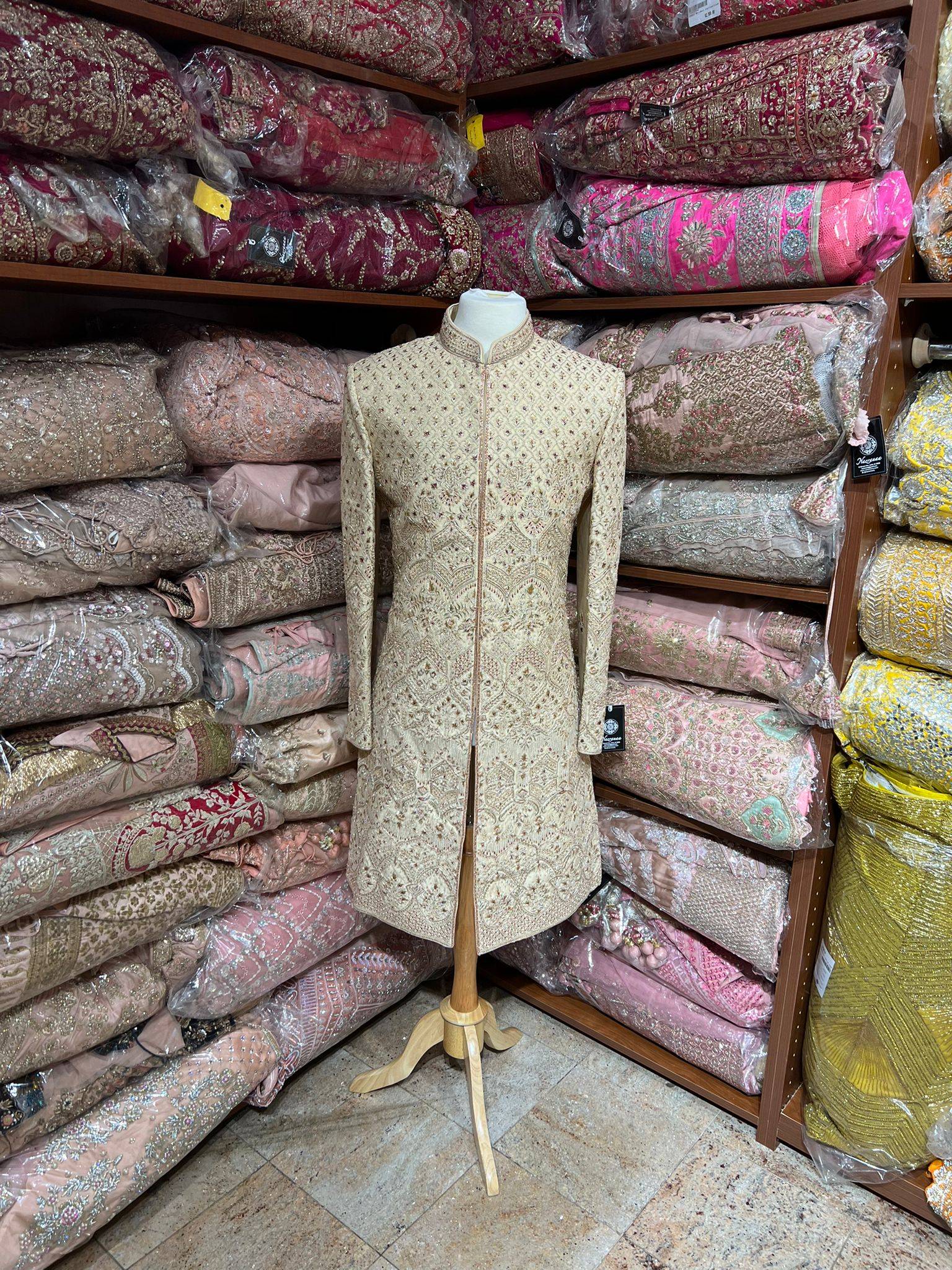 • Cream raw silk fabricated wedding sherwani which has opulent resham, sequins, bead and zari work. The outfit comprise stand collar,full sleeves, front and side slits which is matched with matching churidar pant.