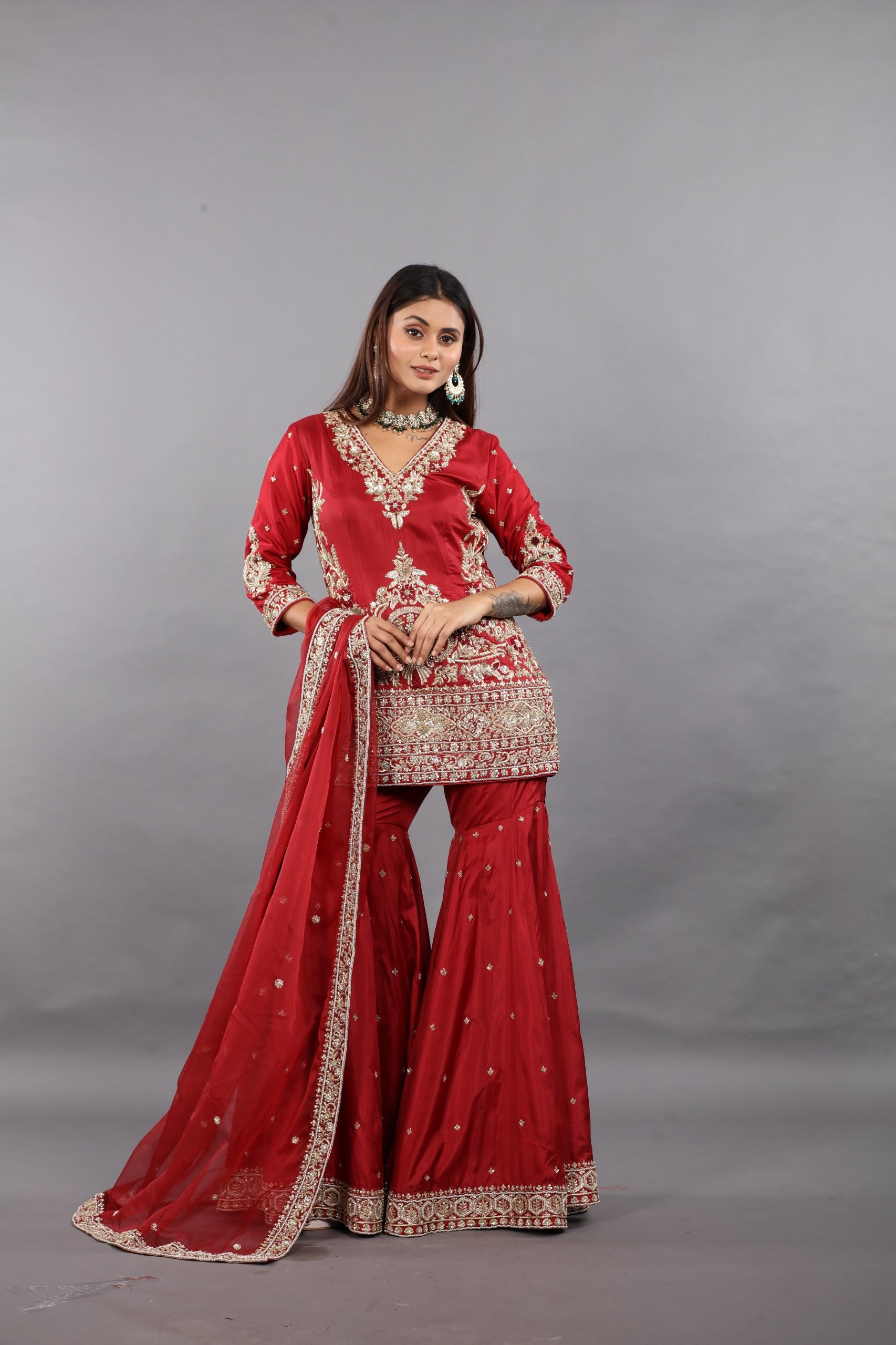 Elevate your wedding wardrobe with this stunning maroon gharara suit, featuring intricate zardozi embroidery that catches the light beautifully. The elegant 3/4 sleeves offer a refined silhouette, while the coordinating gharara with delicate border detailing completes the look. Perfect for intimate wedding celebrations, this piece combines traditional craftsmanship with timeless style for an unforgettable appearance.