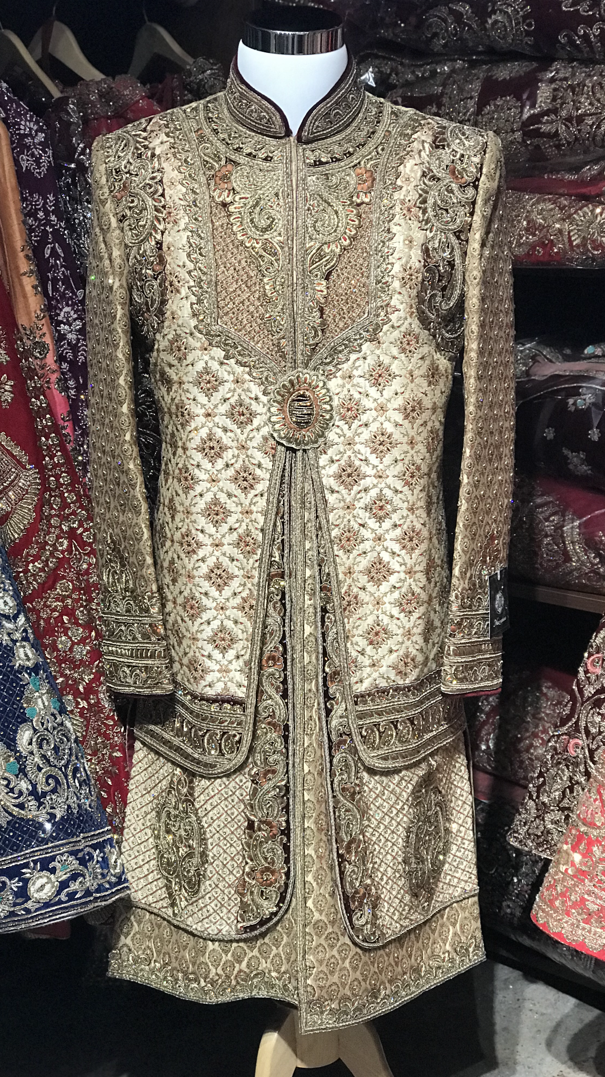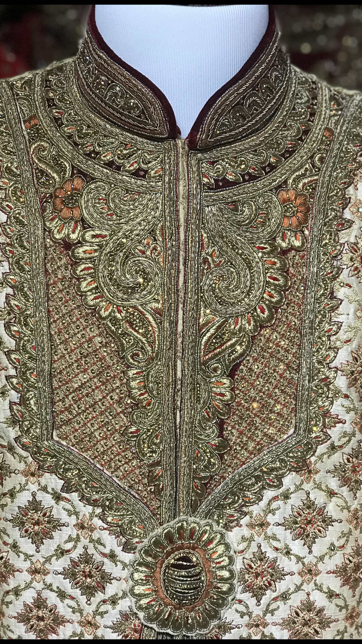 If you want to look like a king on your wedding day this is your outfit! Gold heavy embroidered sherwani with multicolor thread accent, gold stones and maroon velvet on neck & sleeves.