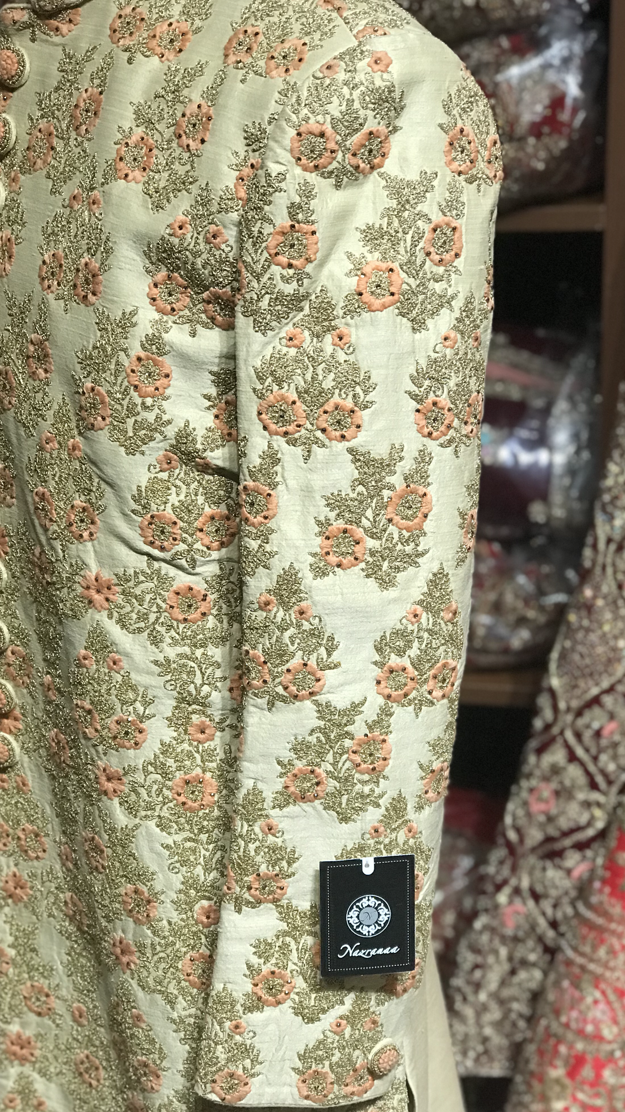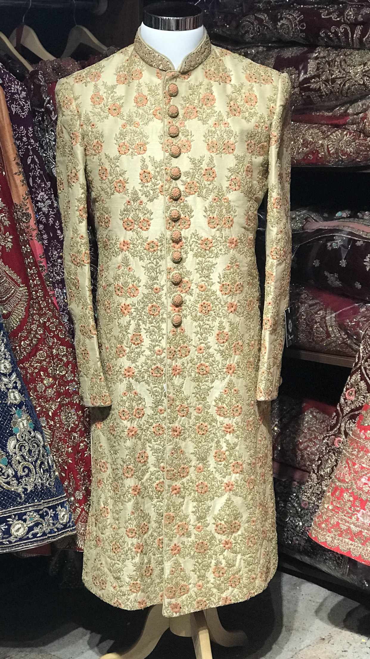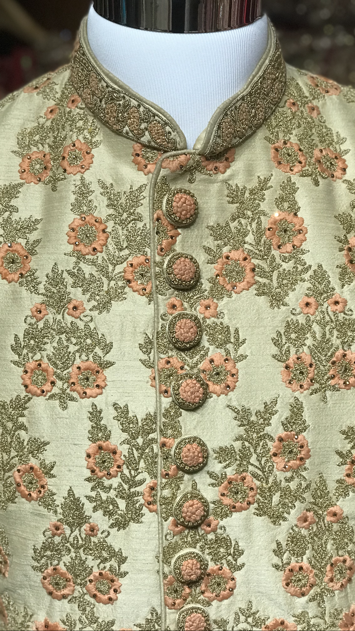 Super elegant! Gold raw silk sherwani with peach resham thread work intertwined with gold aari embroidery. Paired with a gold chudidar!