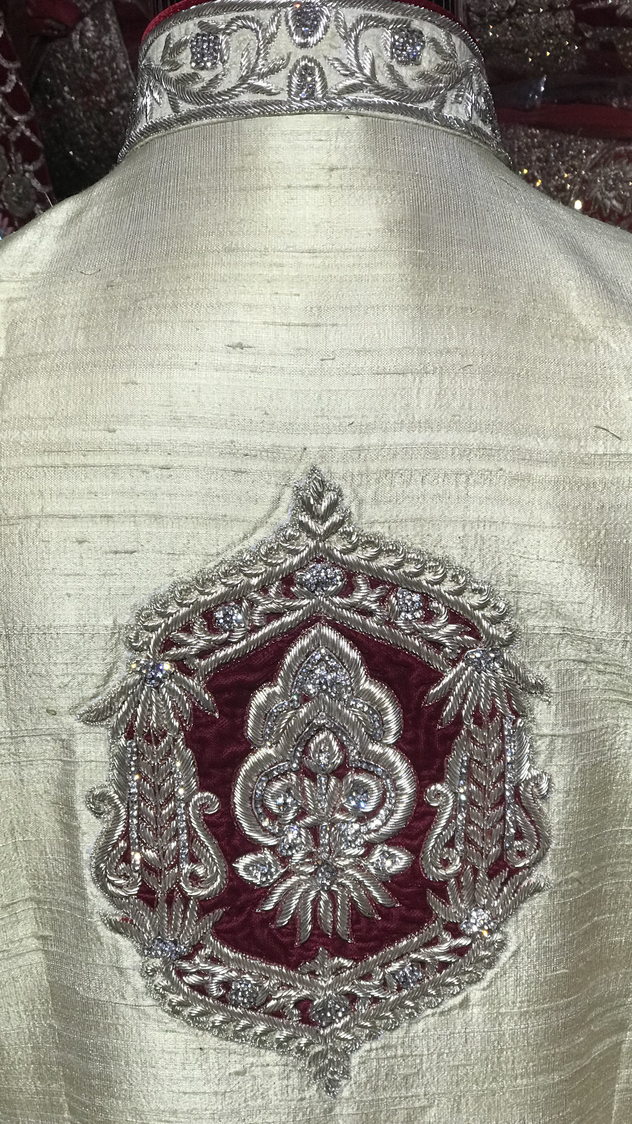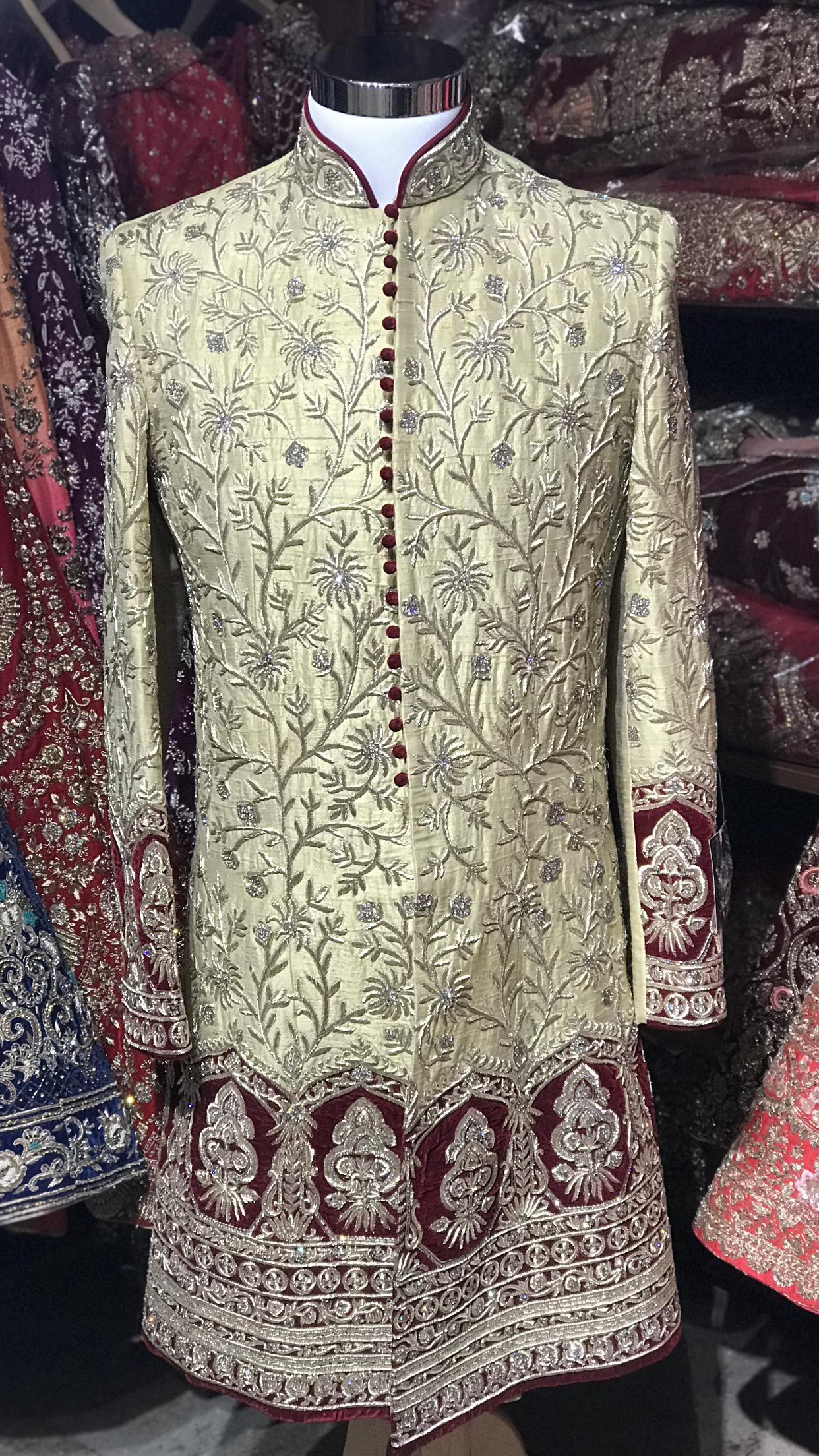 Gold raw silk sherwani with heavy zardosi embroidery. Designed with red velvet patchwork and red velvet buttons. Paired with a red chudidar