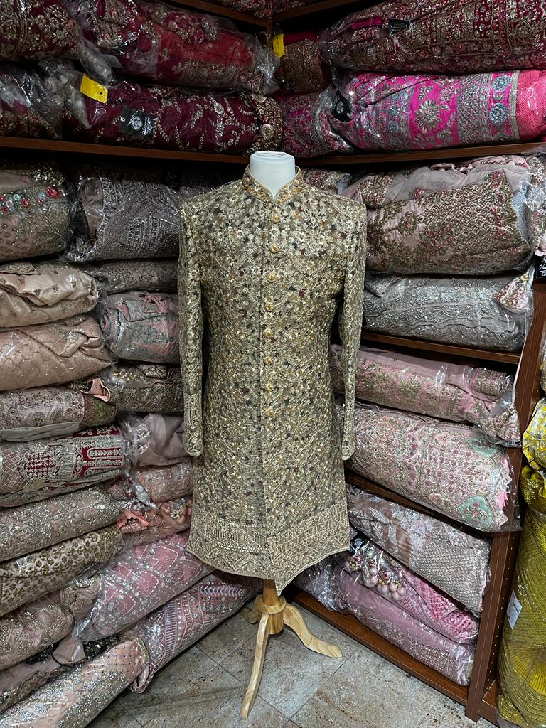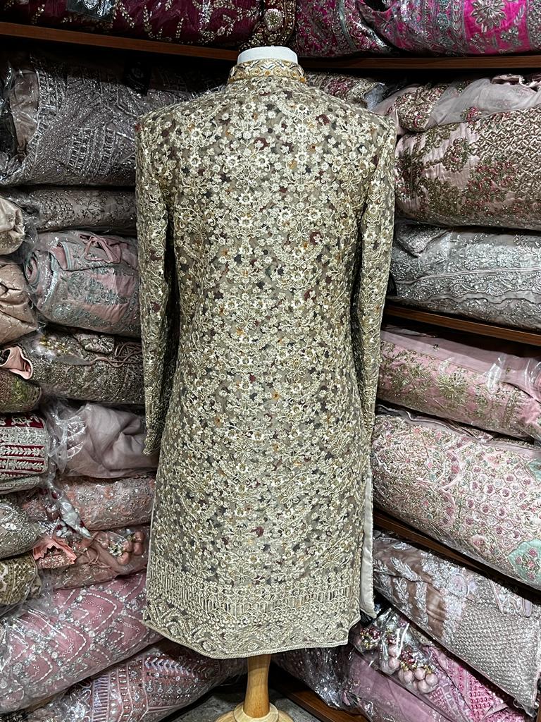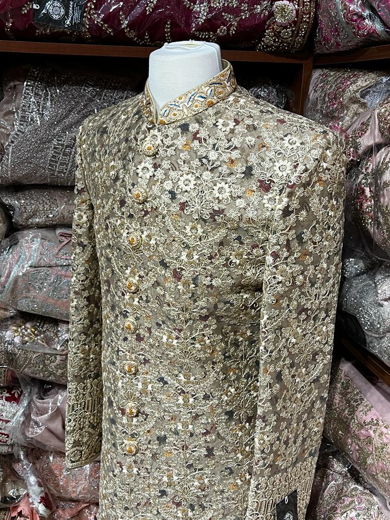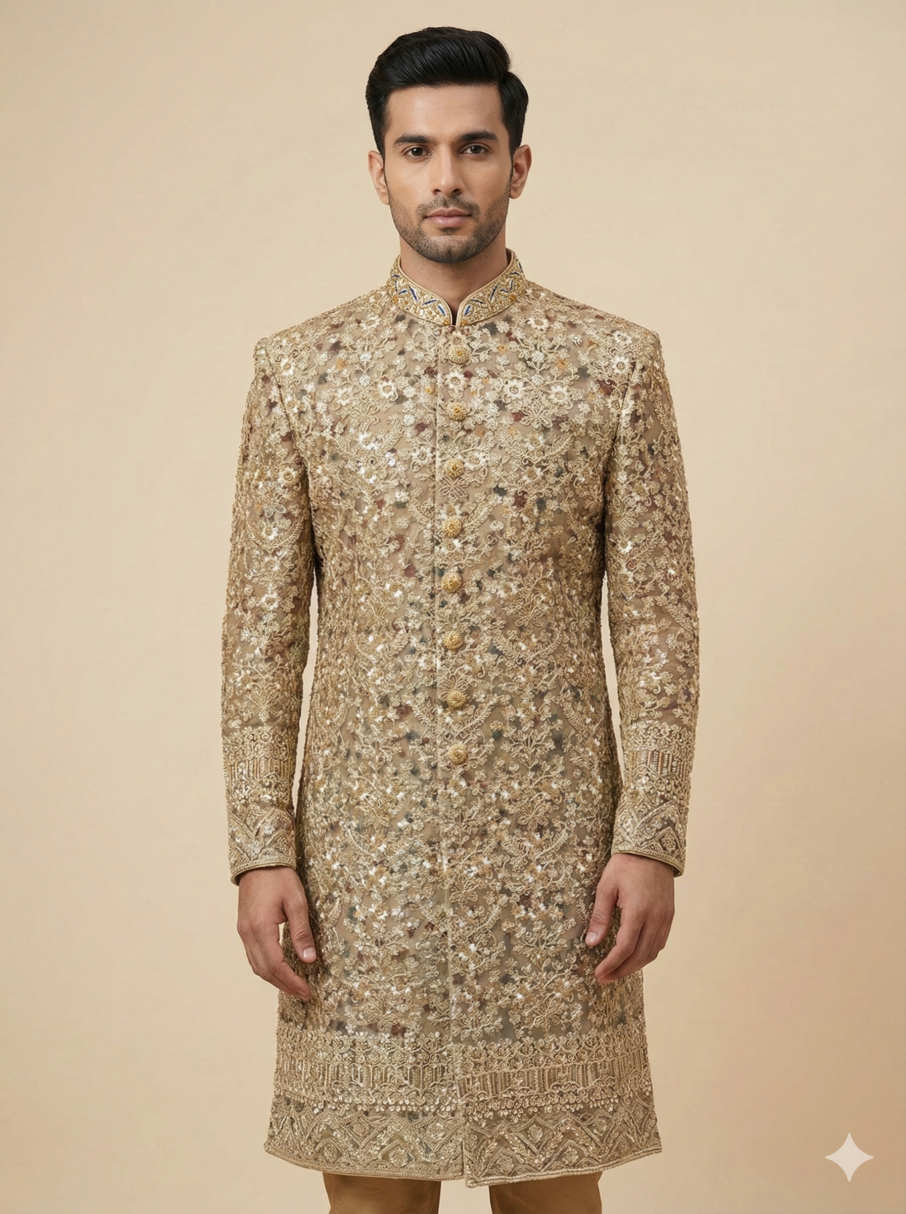 • Gold full sleeved mandarin collared sherwani has been crafted with floral digital printed designs with net on gold thread embroidery and fancy buttons.
