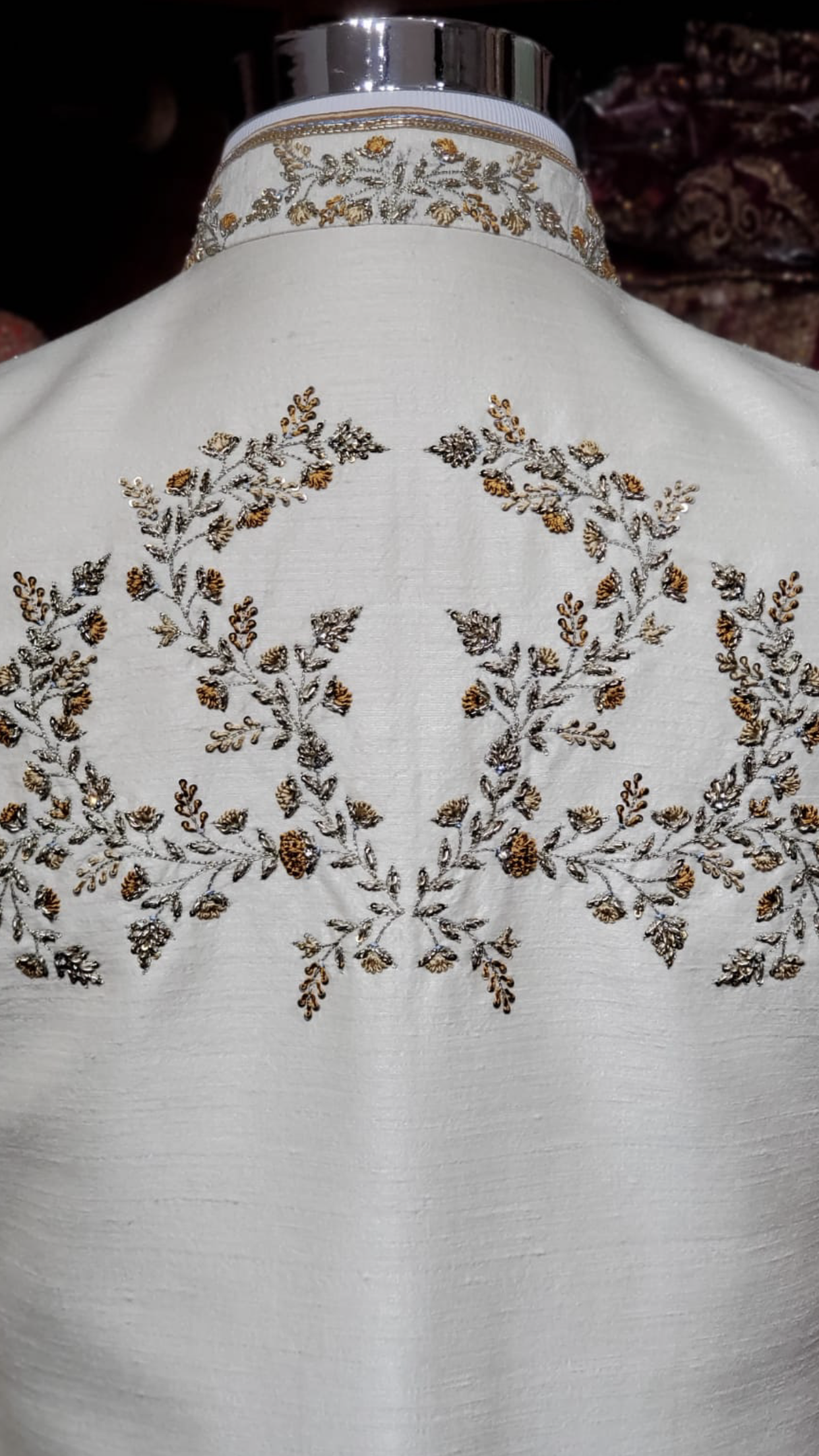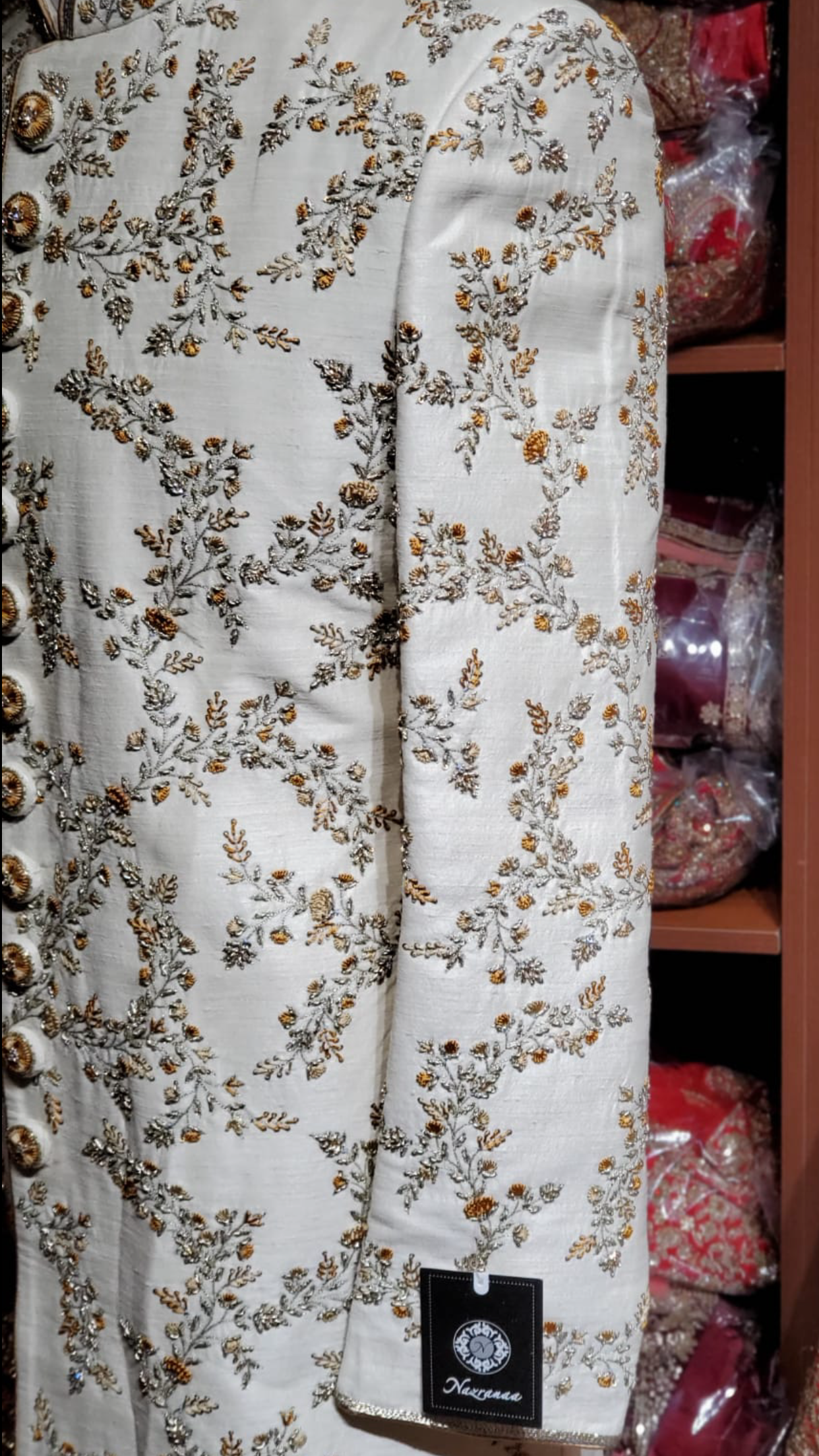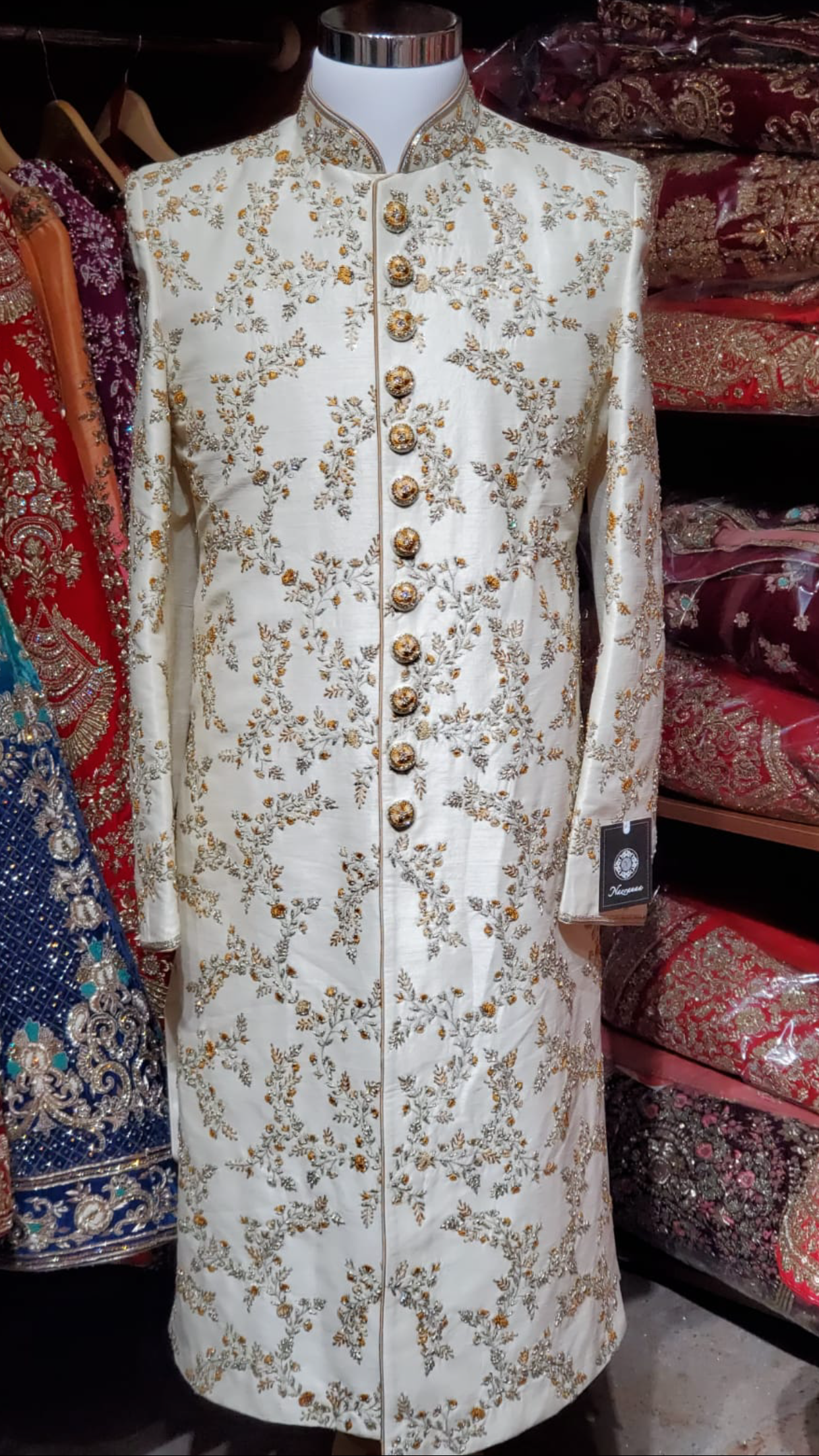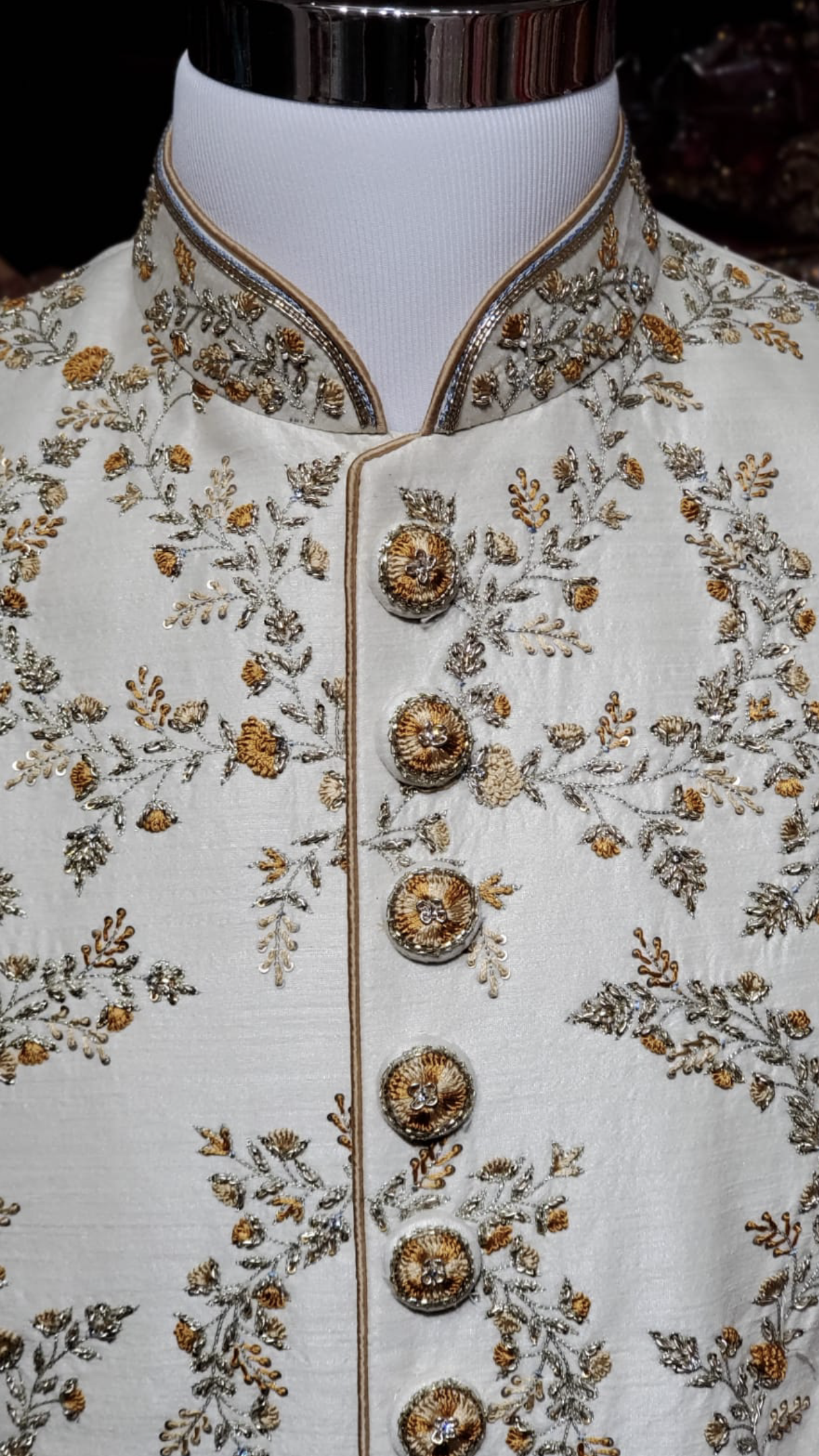 Cream sherwani with zardosi, crystal, sequins & mustard resham thread!
