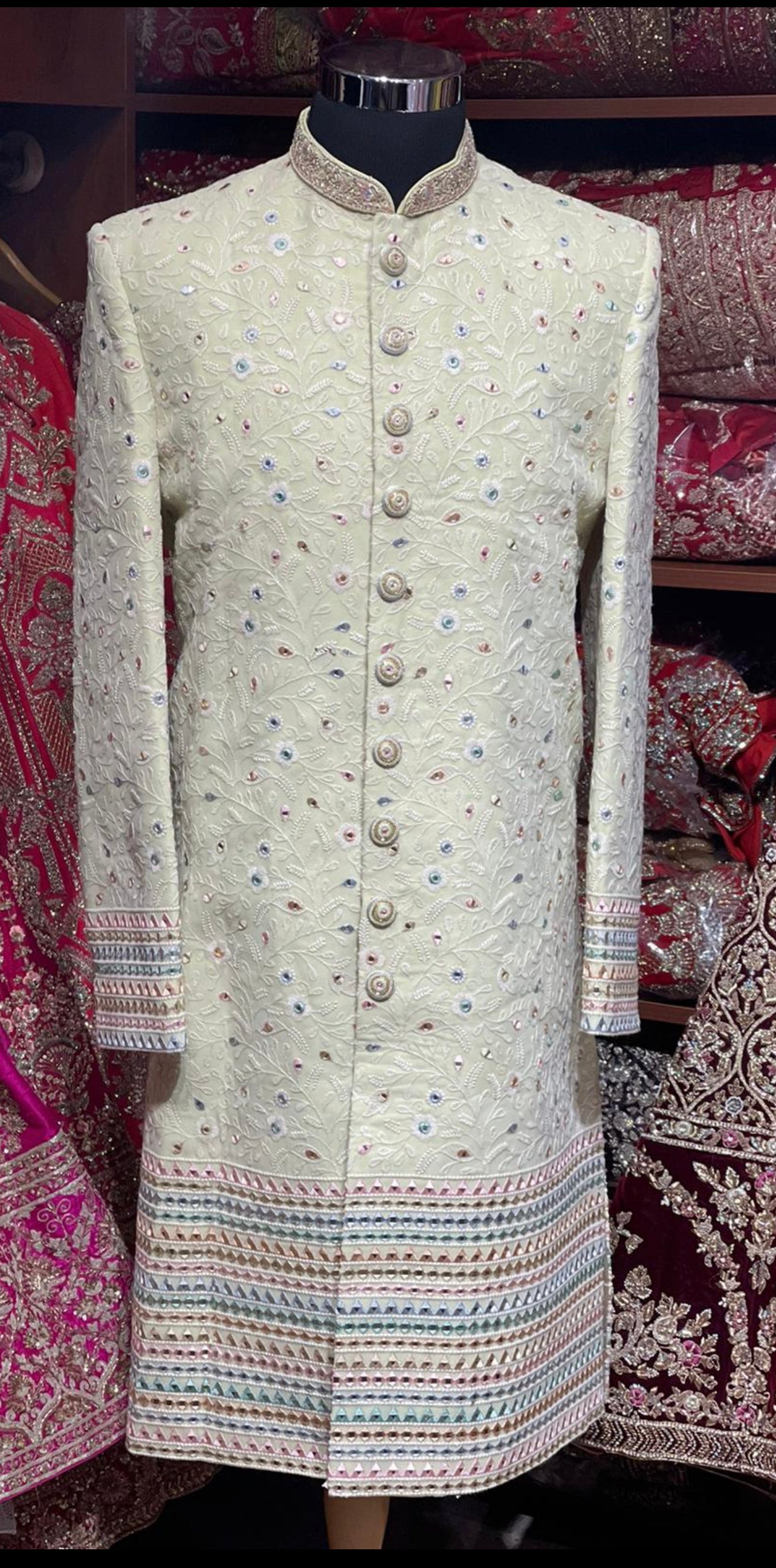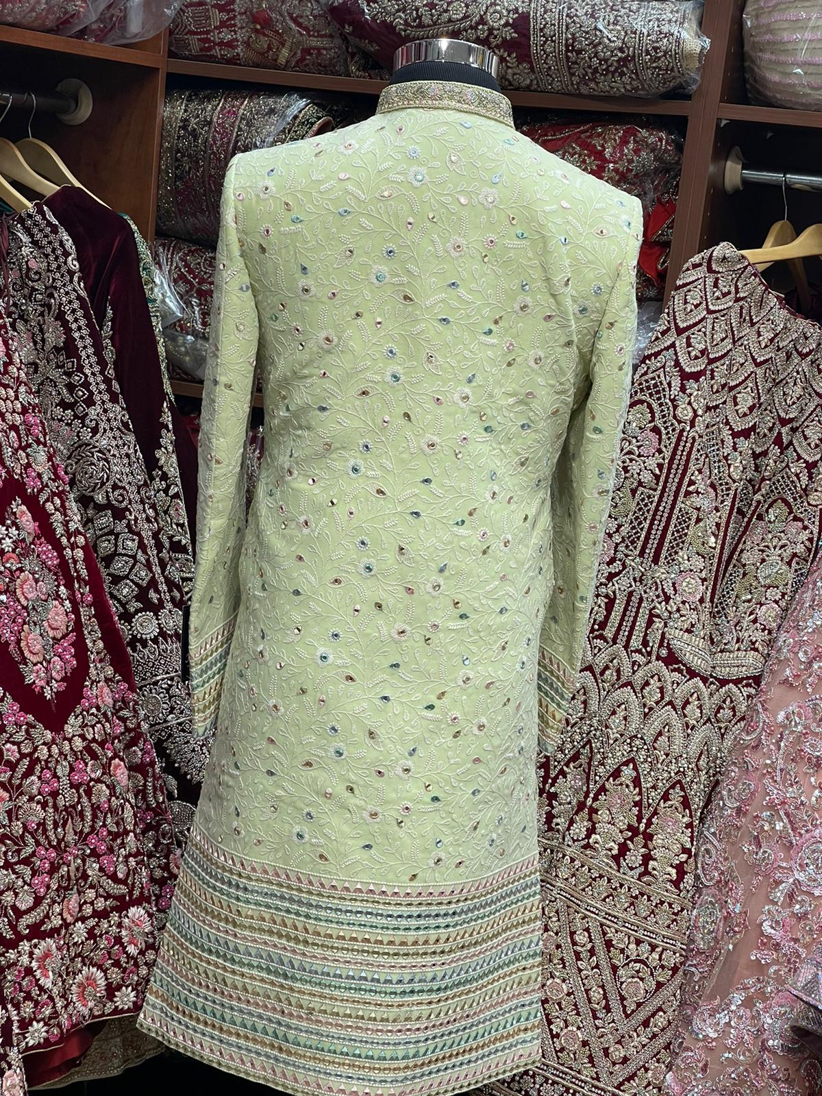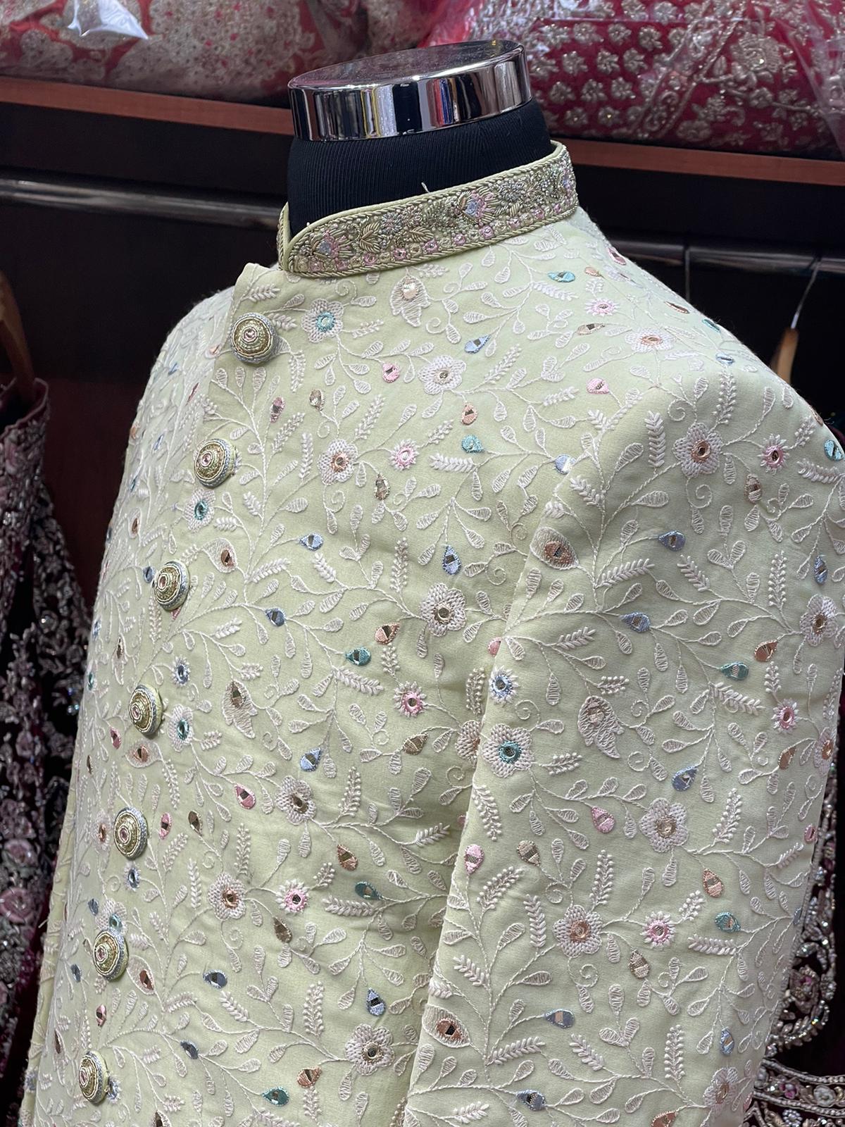 Mint green sherwani blooms with fine jaal pattern charmed with off white resham beautifies with mirror work and embroidered border and while the mandarin collar is enriched with zardosi and sequins for a marvelous finish.paired with a matching churidar pants.