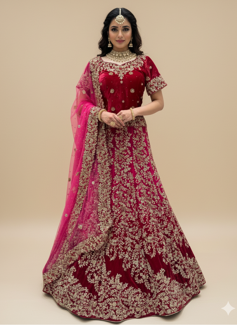 1. Featuring exquisite zardozi, crystal and sequin embroidery, this ombre-pink-maroon velvet lehenga is a stunning selection for the modern bride.