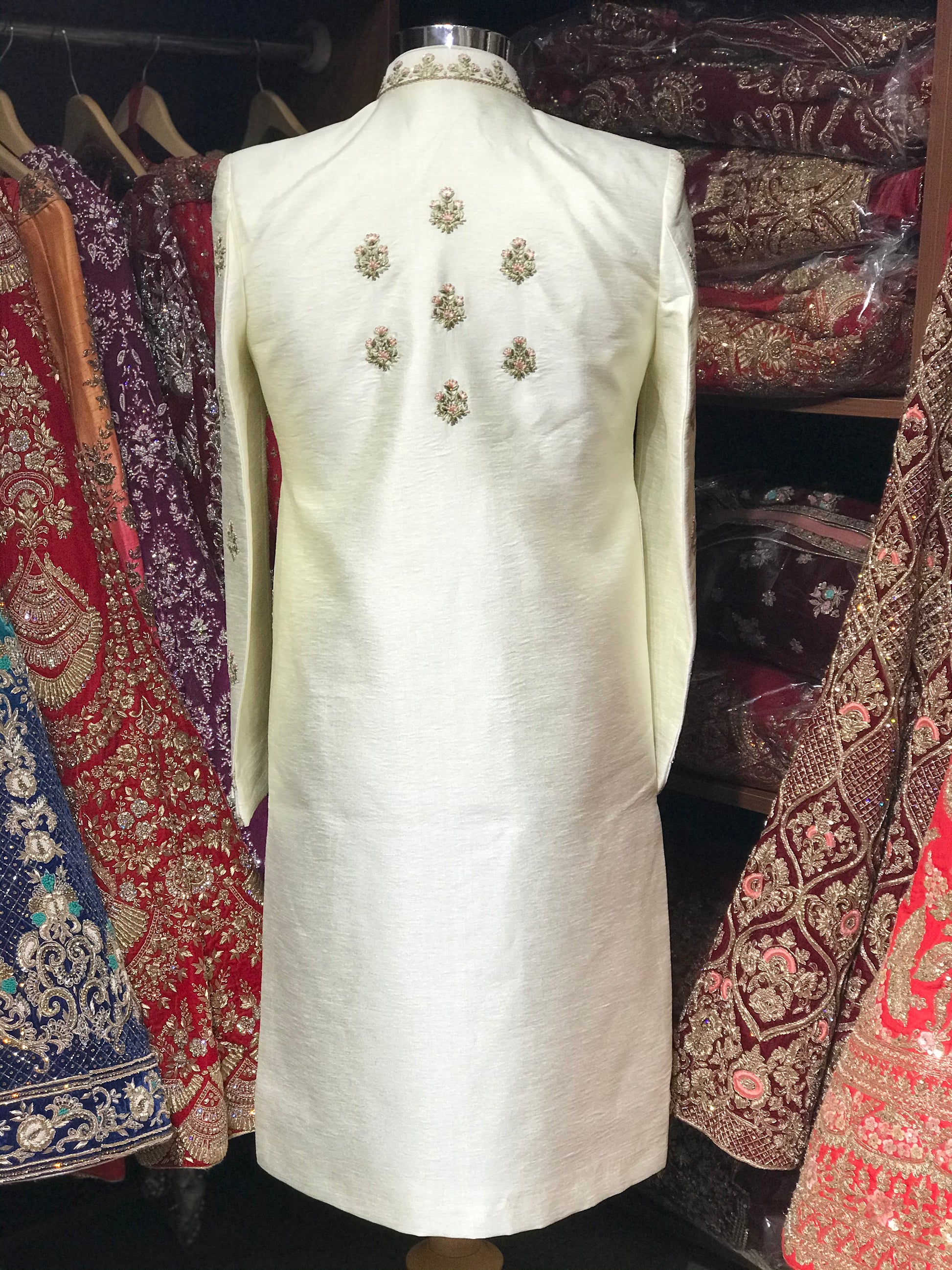 Ivory raw silk sherwani with scattered buttis. The buttis are made with blush and mint resham embroidery. Paired with an ivory chudidar.