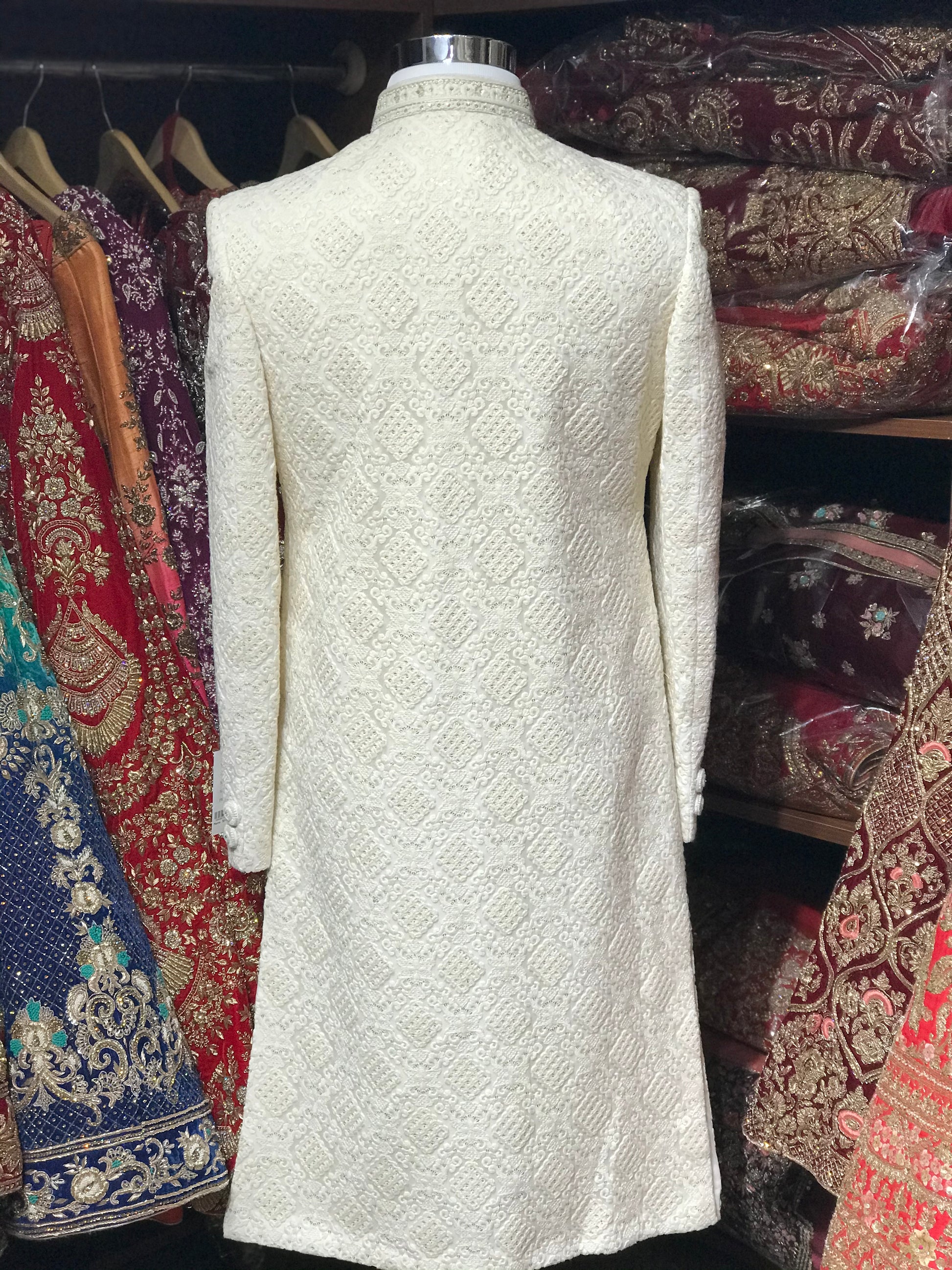 Ivory sherwani with all over chikankari embroidery. Paired with an ivory chudidar. The most elegant and classy piece for the groom!