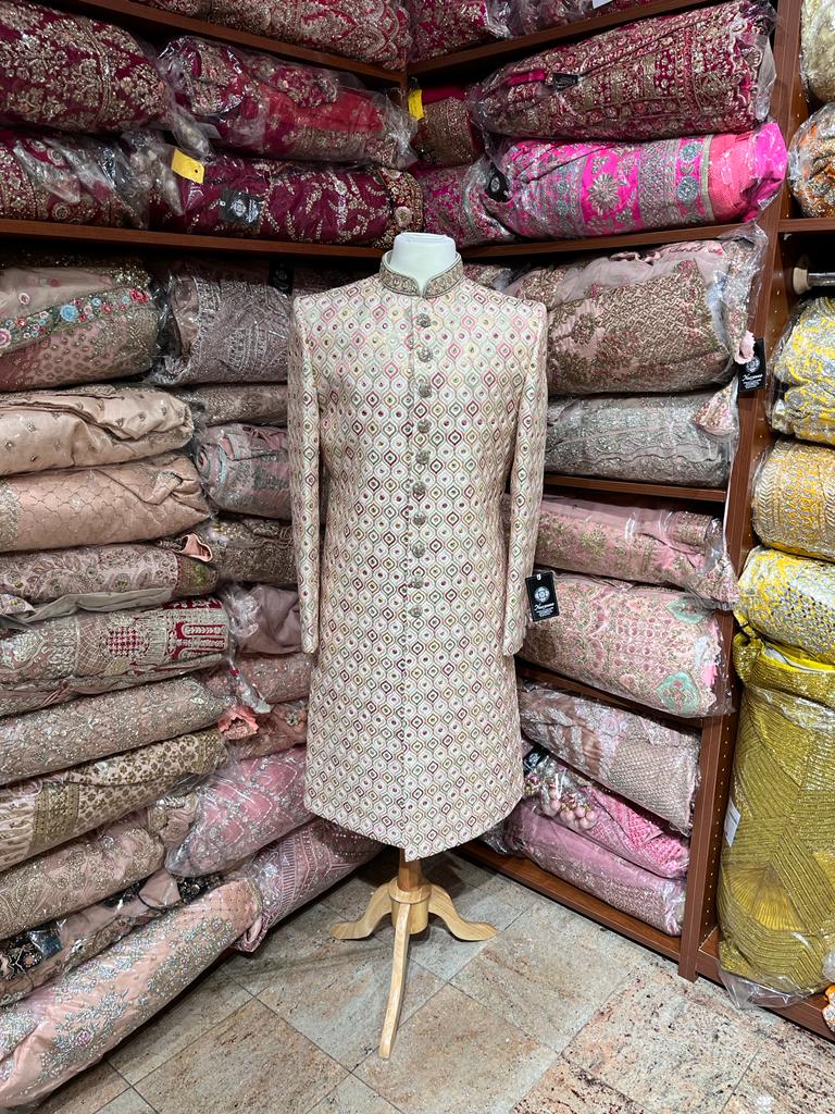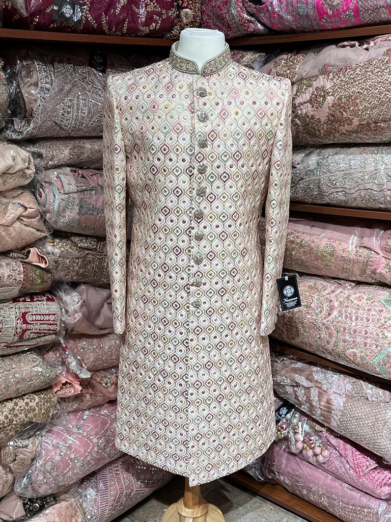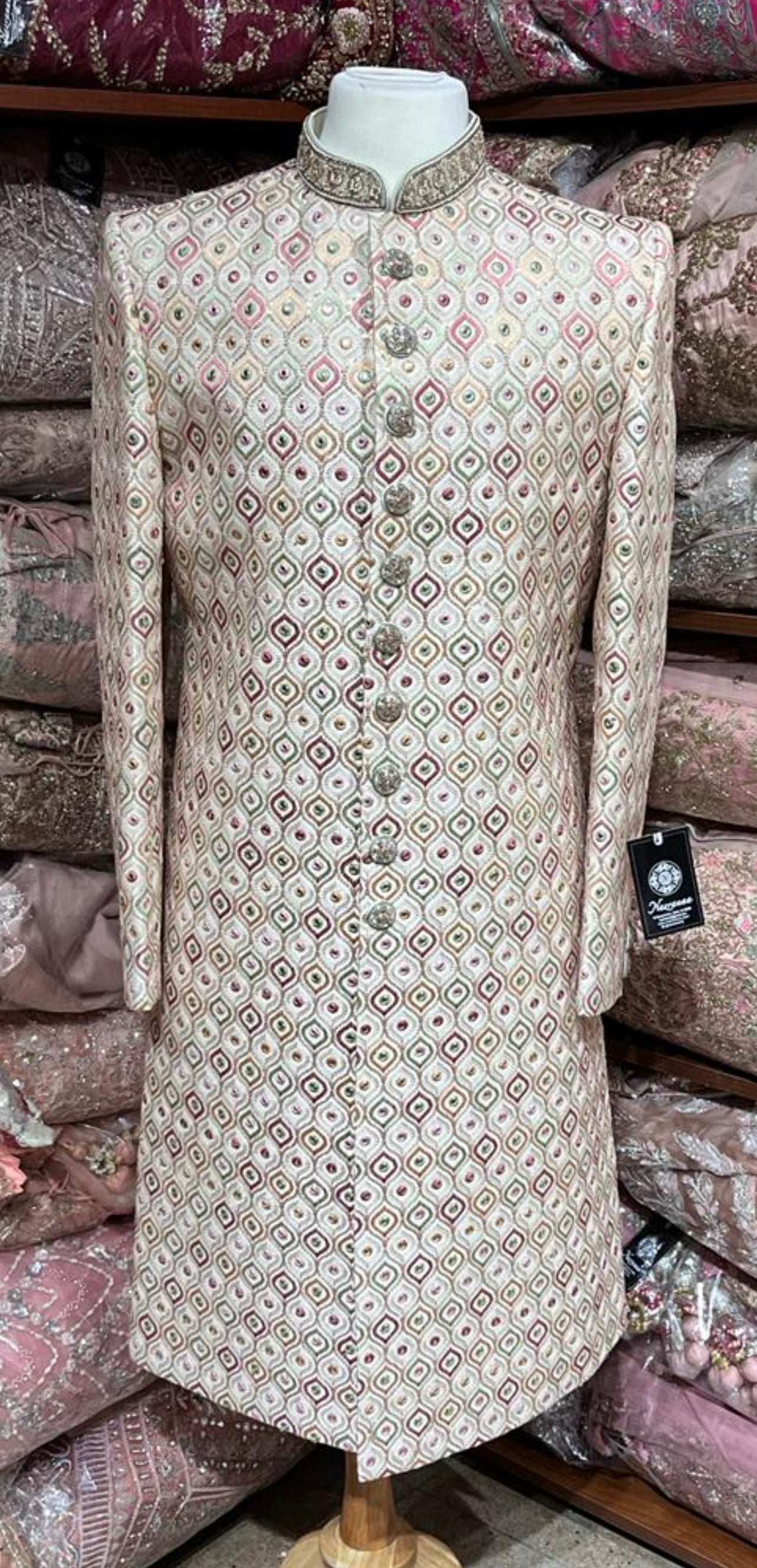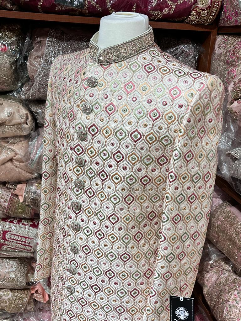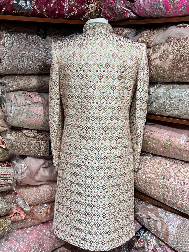 • Ivory sherwani blooms with fine jaal pattern charmed with multicolored resham beautifies with mirror work and and while the mandarin collar is enriched with zardosi and sequins for a marvelous finish.paired with a matching churidar pants.