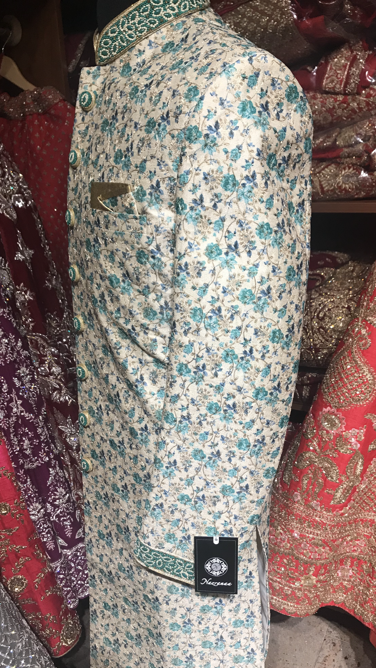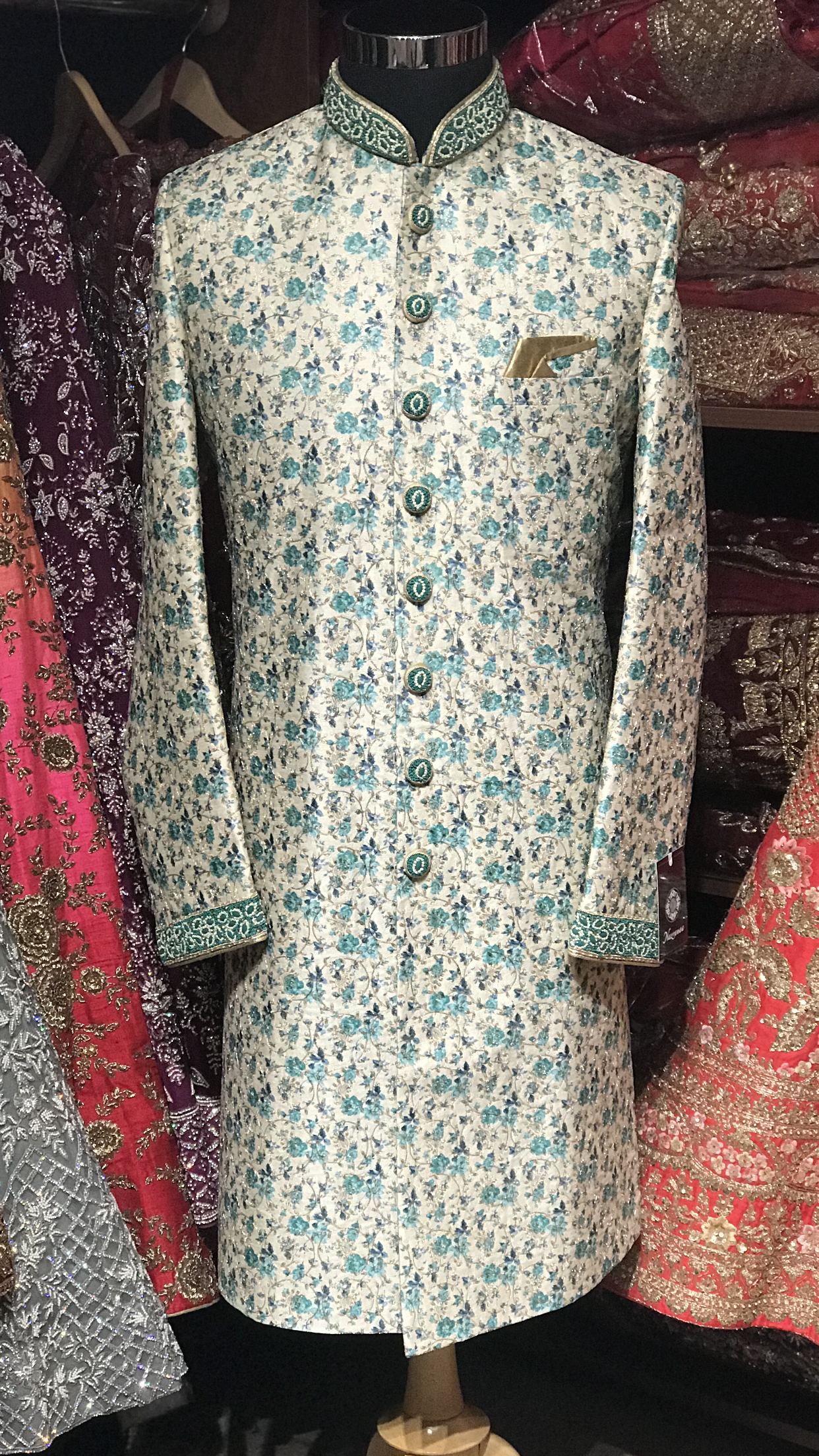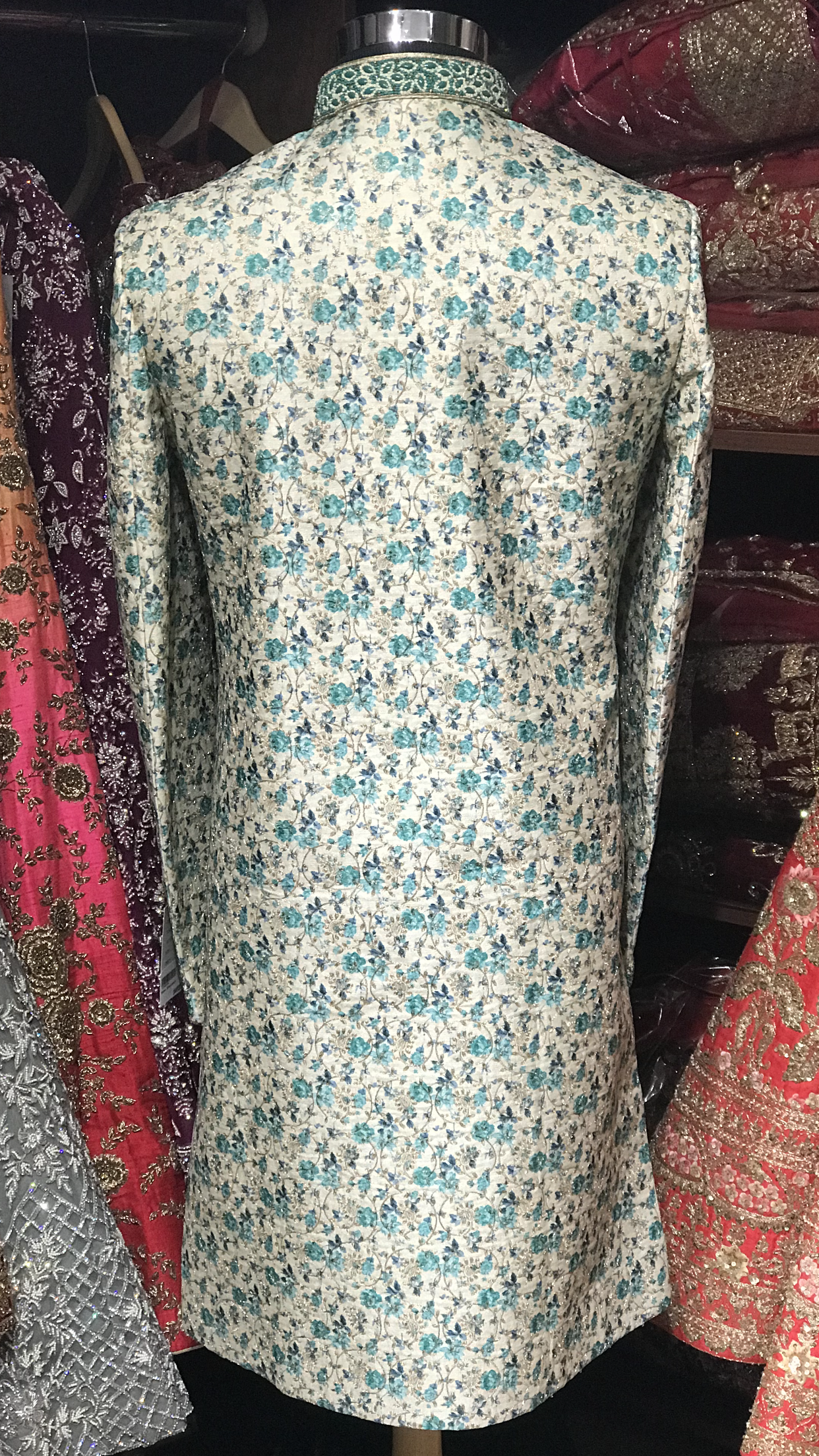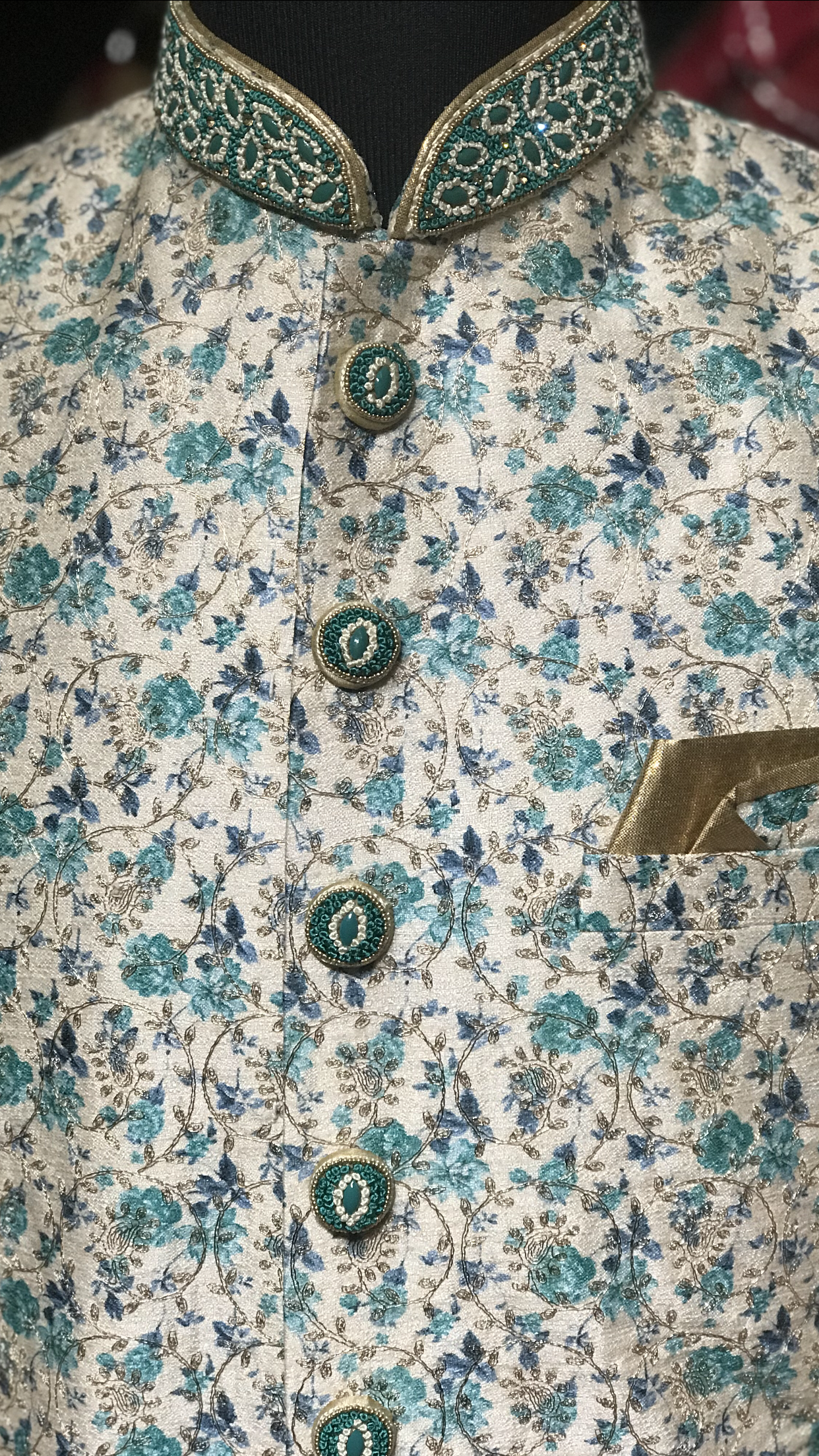 Ivory floral print sherwani consisting of shades of teal and hand embroidered collar and buttons!