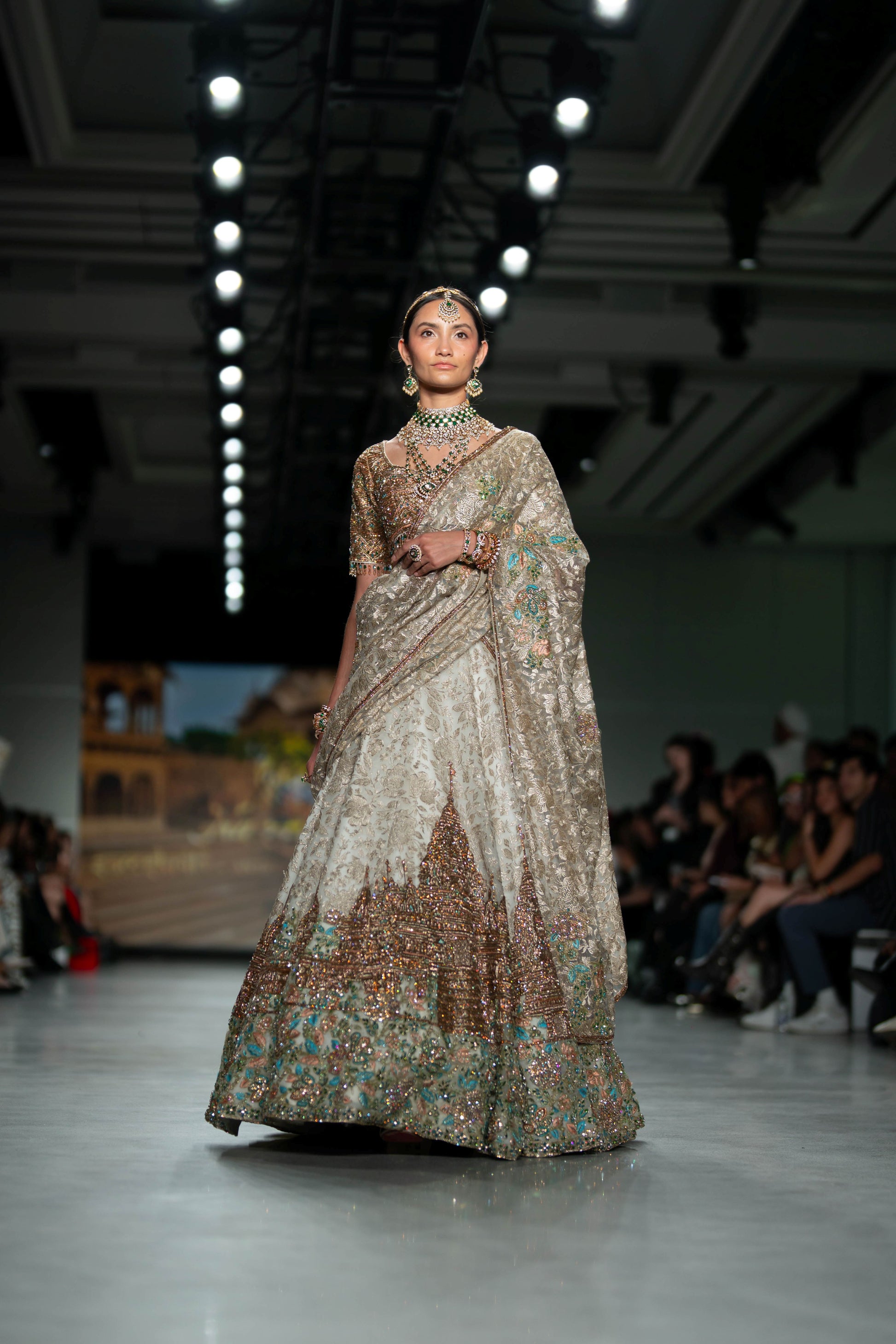 The Akshardham Temple in Robbinsville is a 21st-century architectural marvel and a vibrant spiritual space with an energy that is impossible to miss. That energy and magnificence inspired us to include it in this collection. For the lehenga, we began with a white embroidered fabric, added the temple’s architectural designs in handwork, and drew the colors from the paintings inside the temple to bring the piece to life.