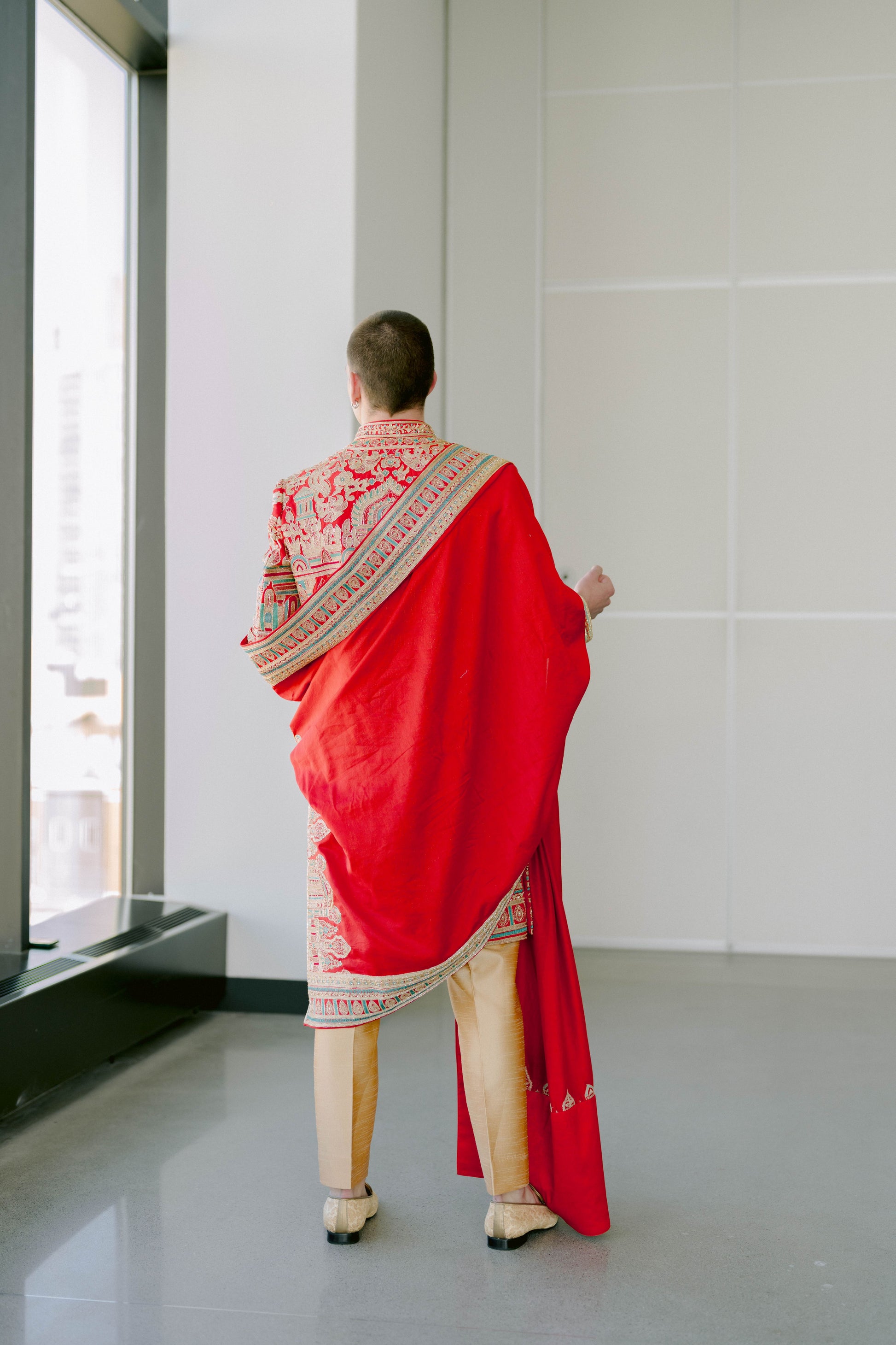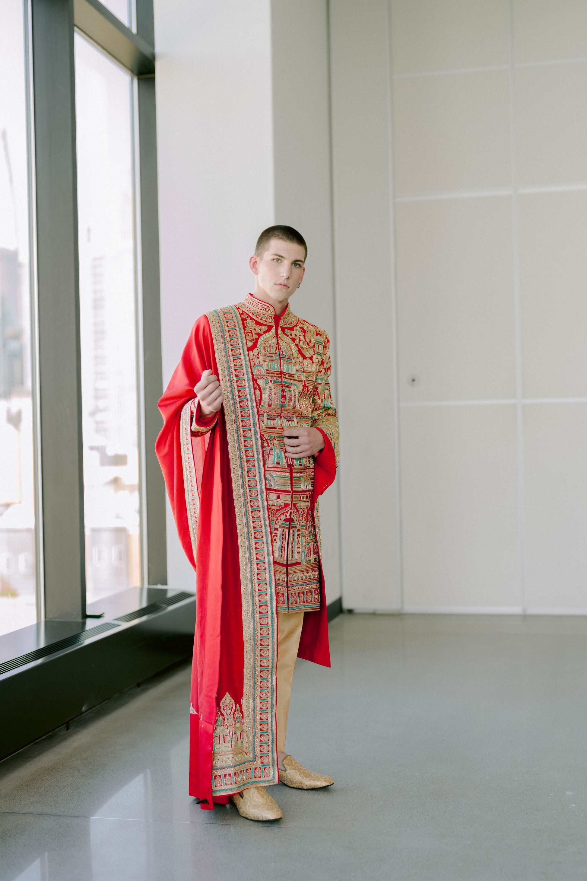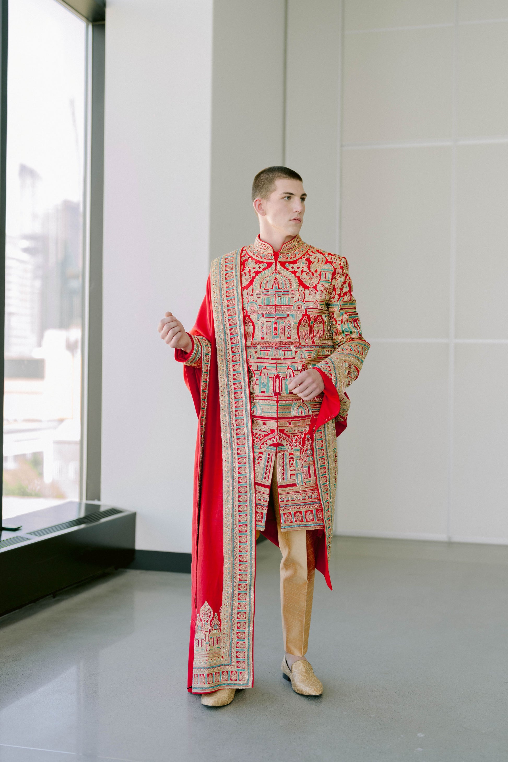 Inspired by the Meenakshi Temple in Madurai, a true architectural and artistic marvel featuring over 33,000 sculptures that depict deities and mythological tales, this sherwani brings that grandeur into couture. The embroidery reflects the temple’s vast sculptural detail, while the vibrant palette pays homage to the striking colors that define its iconic structure.