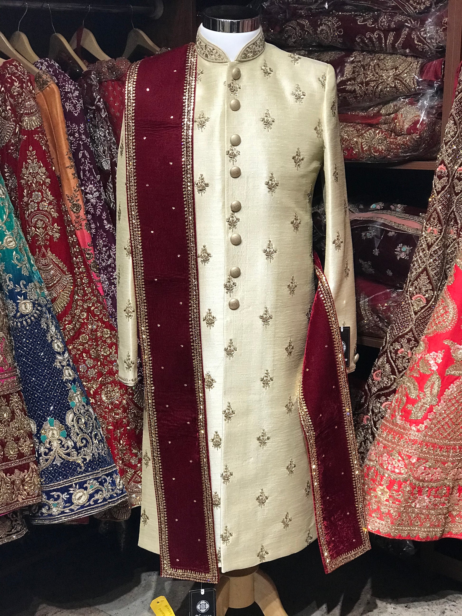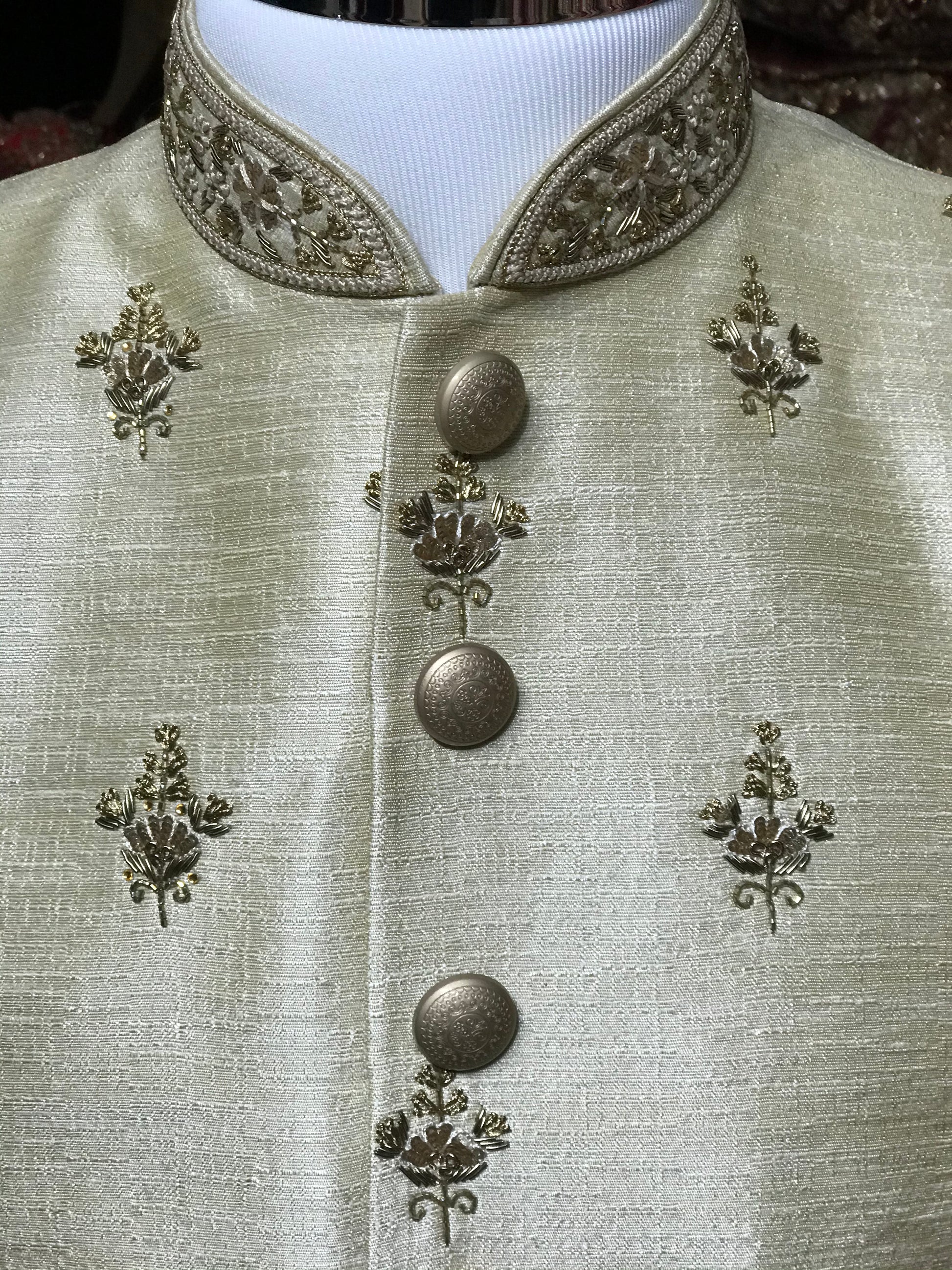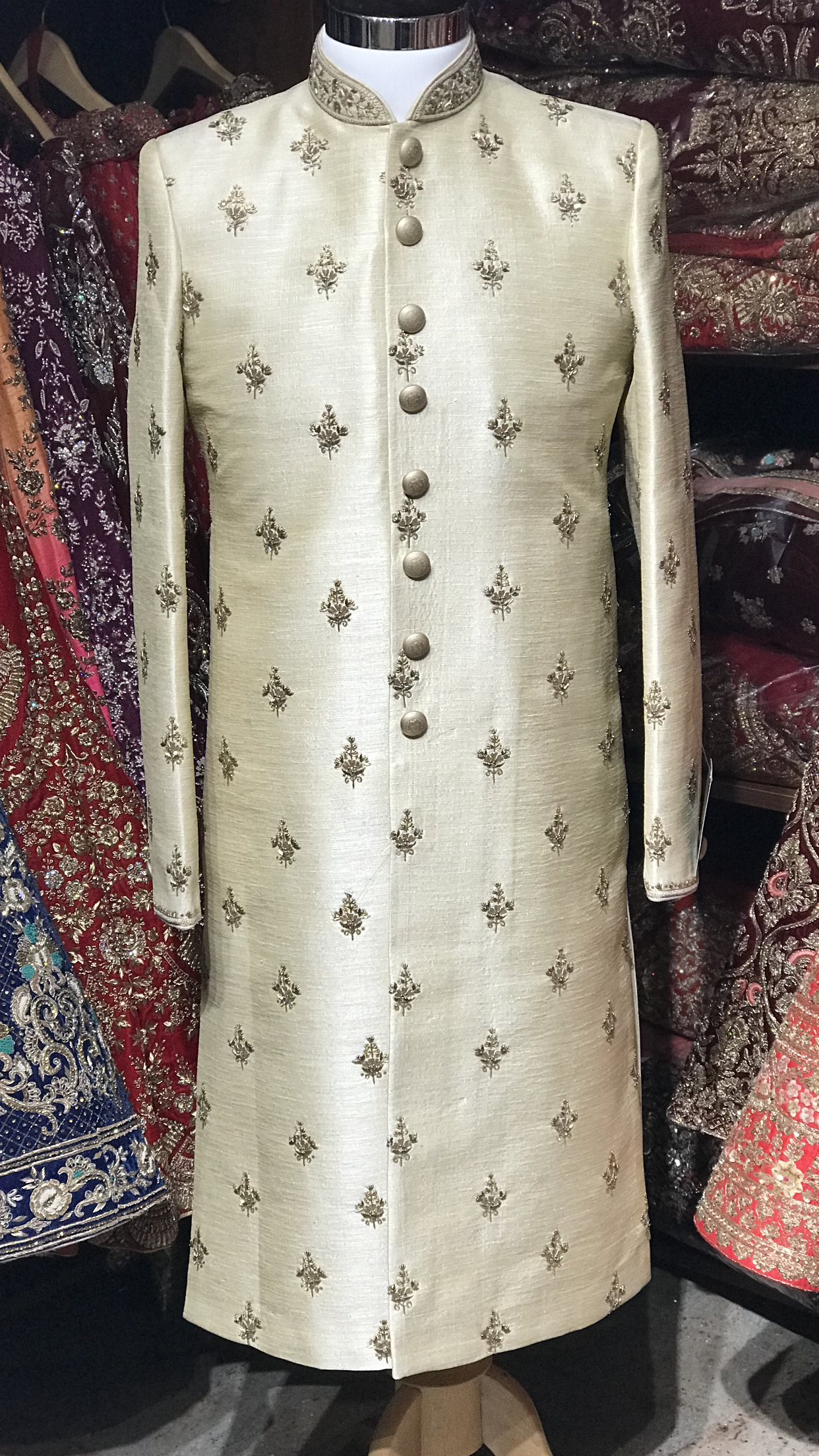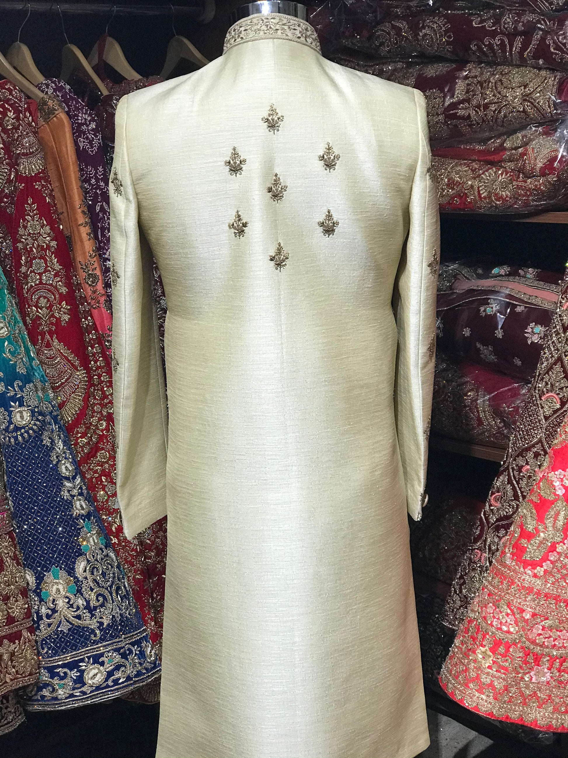 A timeless and elegant piece! This light gold raw silk sherwani has handmade all over zardosi buttis! Paired with a light gold chudidar