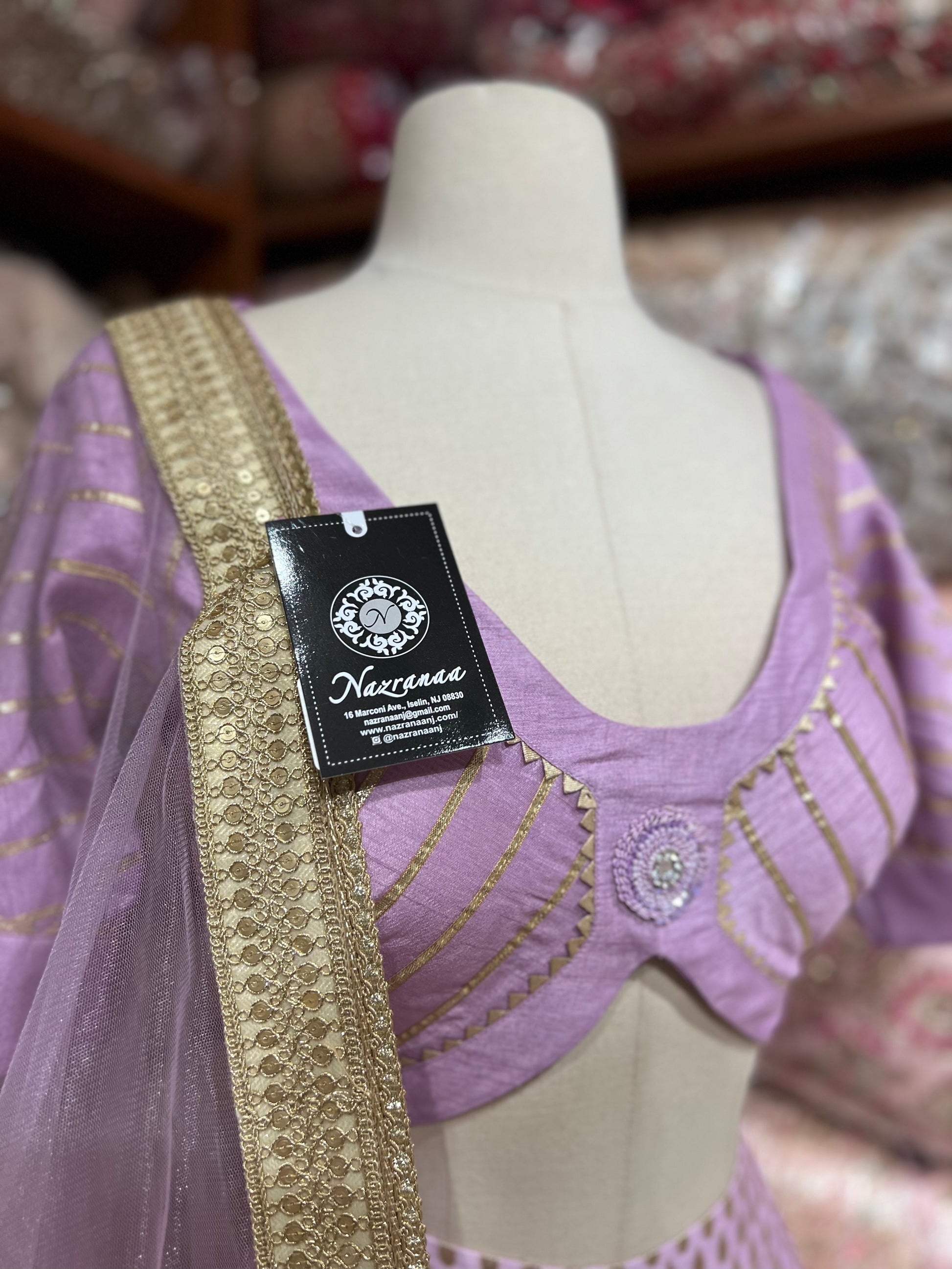 • Featuring a lilac purple designer frill lehenga with zari print embroidered with gold border lehenga. Completed look with gotta border and highlighted in Pearl and sequence work on blouse and net dupatta.