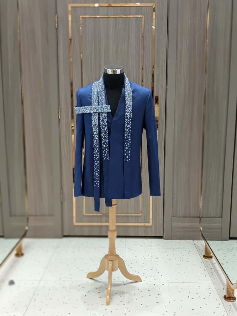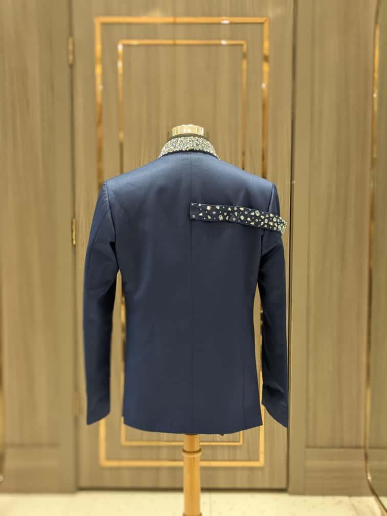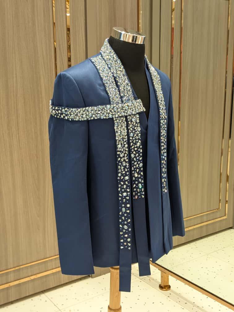 The Dhruva Collection presents Altair avant-garde menswear piece, merging clean tailoring with cosmic brilliance. The refined cut of the jacket is elevated by shimmering embellishments that run vertically and across the shoulder in a cross-body design, making this a couture-level statement for grooms and fashion-forward men.