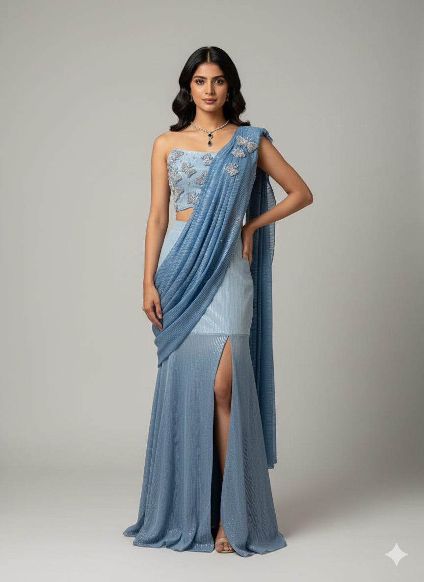 The Dhruva Collection presents a couture masterpiece in powder blue. Intricate crystal butterflies embellish the structured blouse, while the fluid drape adds timeless poise. Paired with a fitted slit skirt, this ensemble captures the balance of bold femininity and celestial romance.
