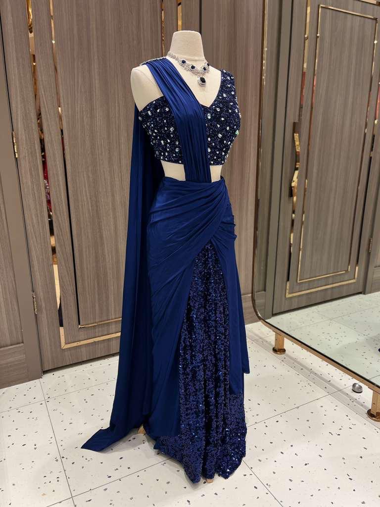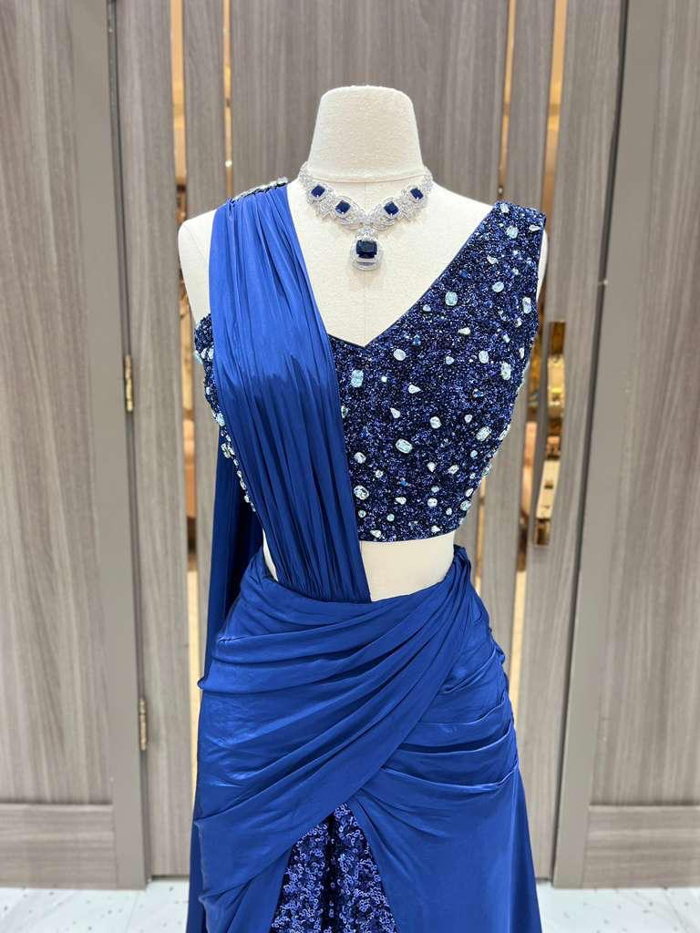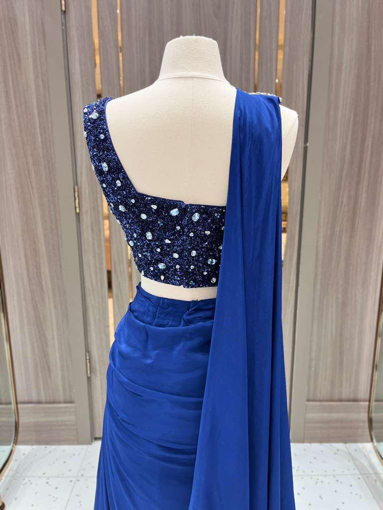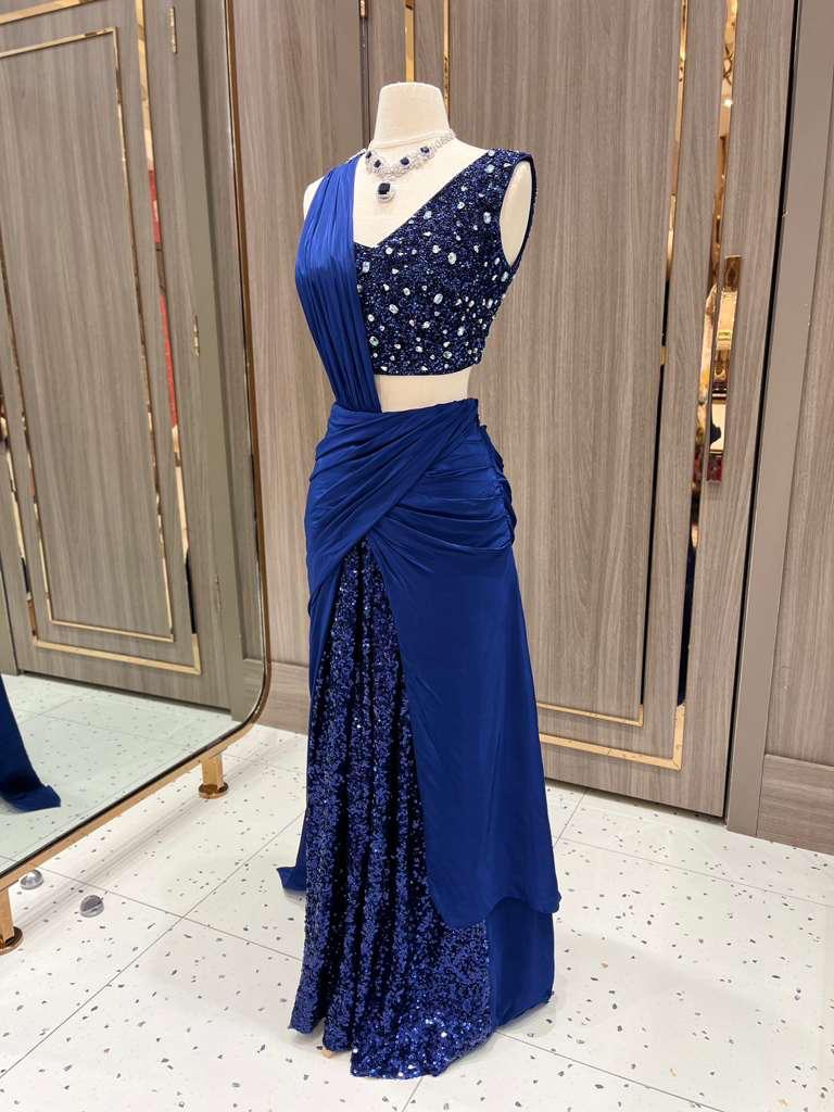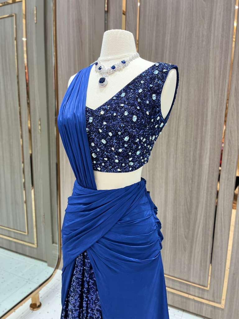 Part of the Dhruva Collection, this midnight blue lehenga gown dazzles with crystal-embellished blouse, ruched draping, and a sequin-splashed skirt. Designed to shine under the spotlight. A modern masterpiece that redefines evening glamour.