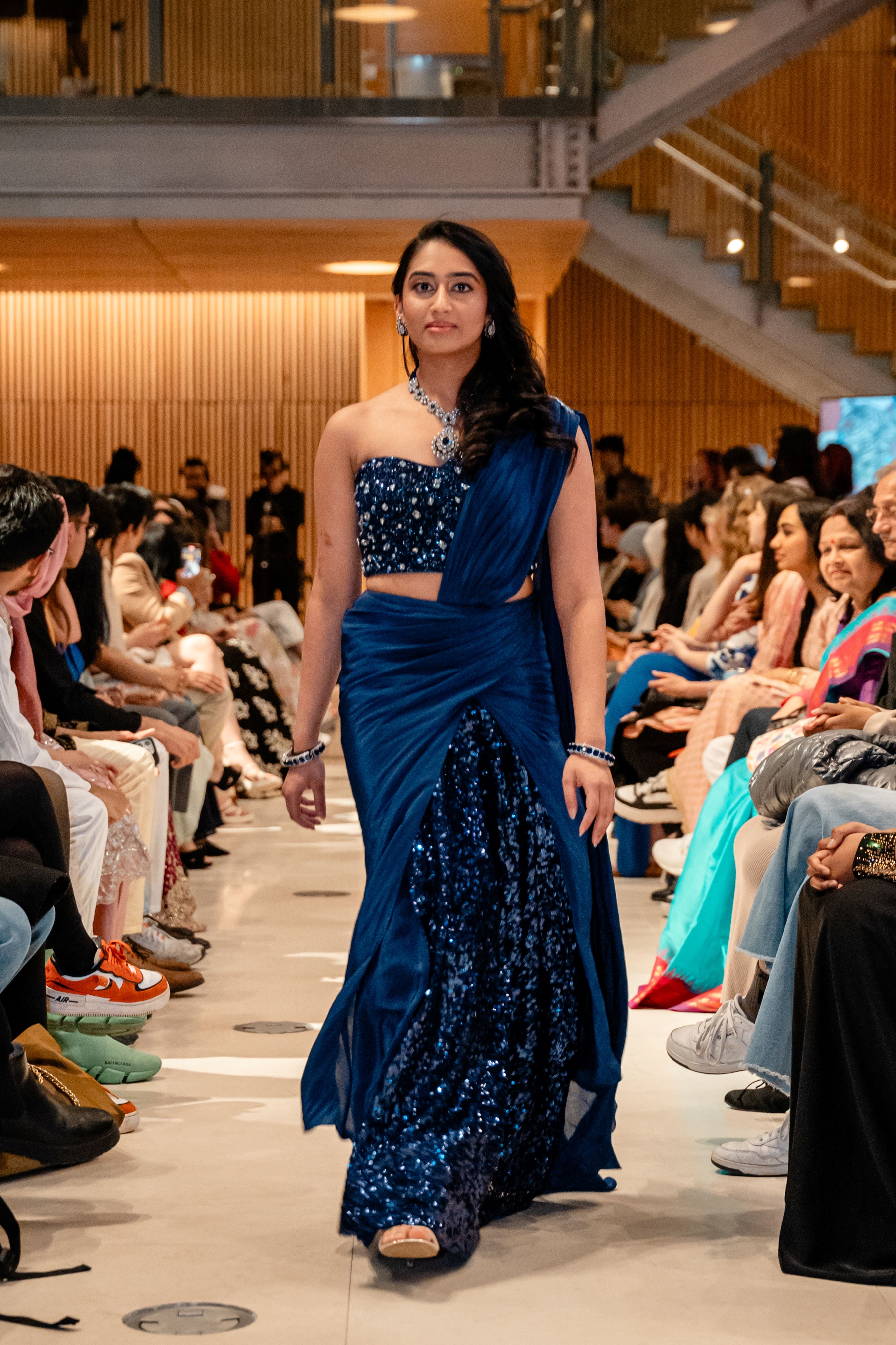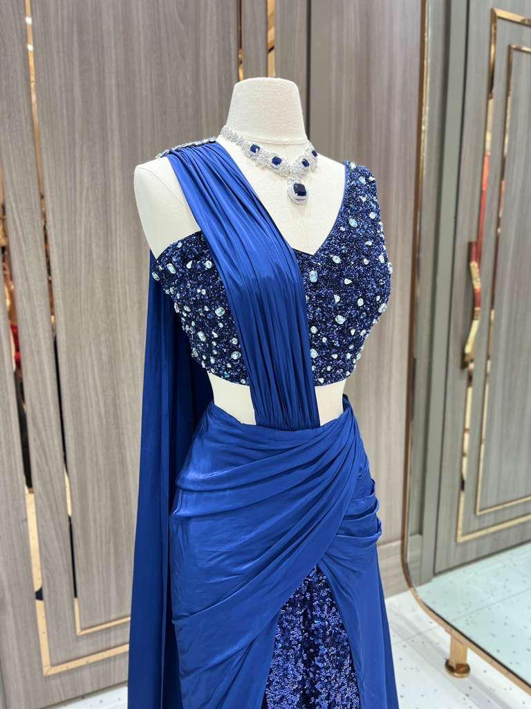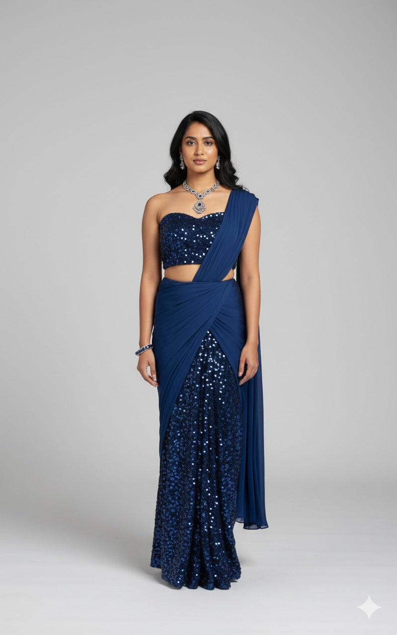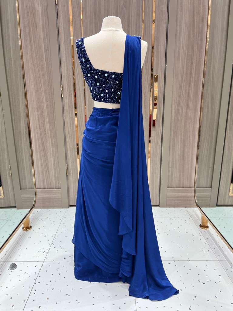 Part of the Dhruva Collection, this midnight blue lehenga gown dazzles with crystal-embellished blouse, ruched draping, and a sequin-splashed skirt. Designed to shine under the spotlight. A modern masterpiece that redefines evening glamour.