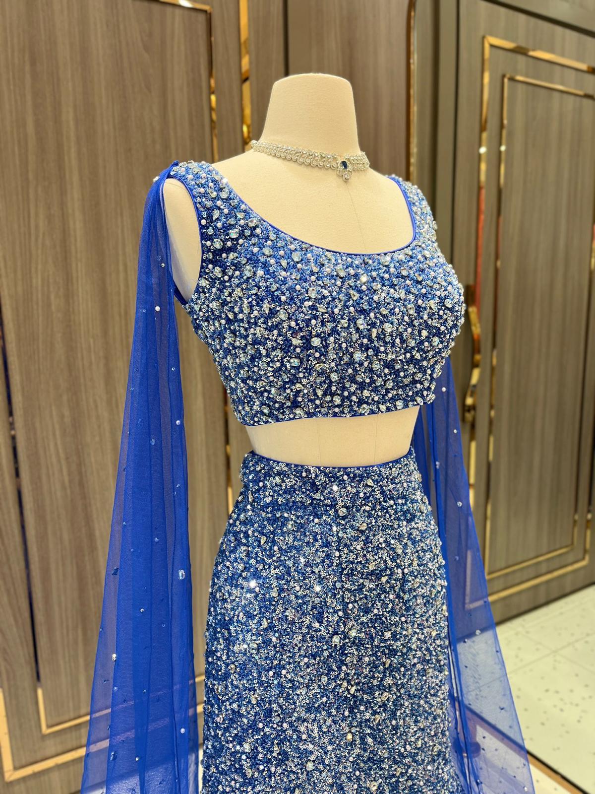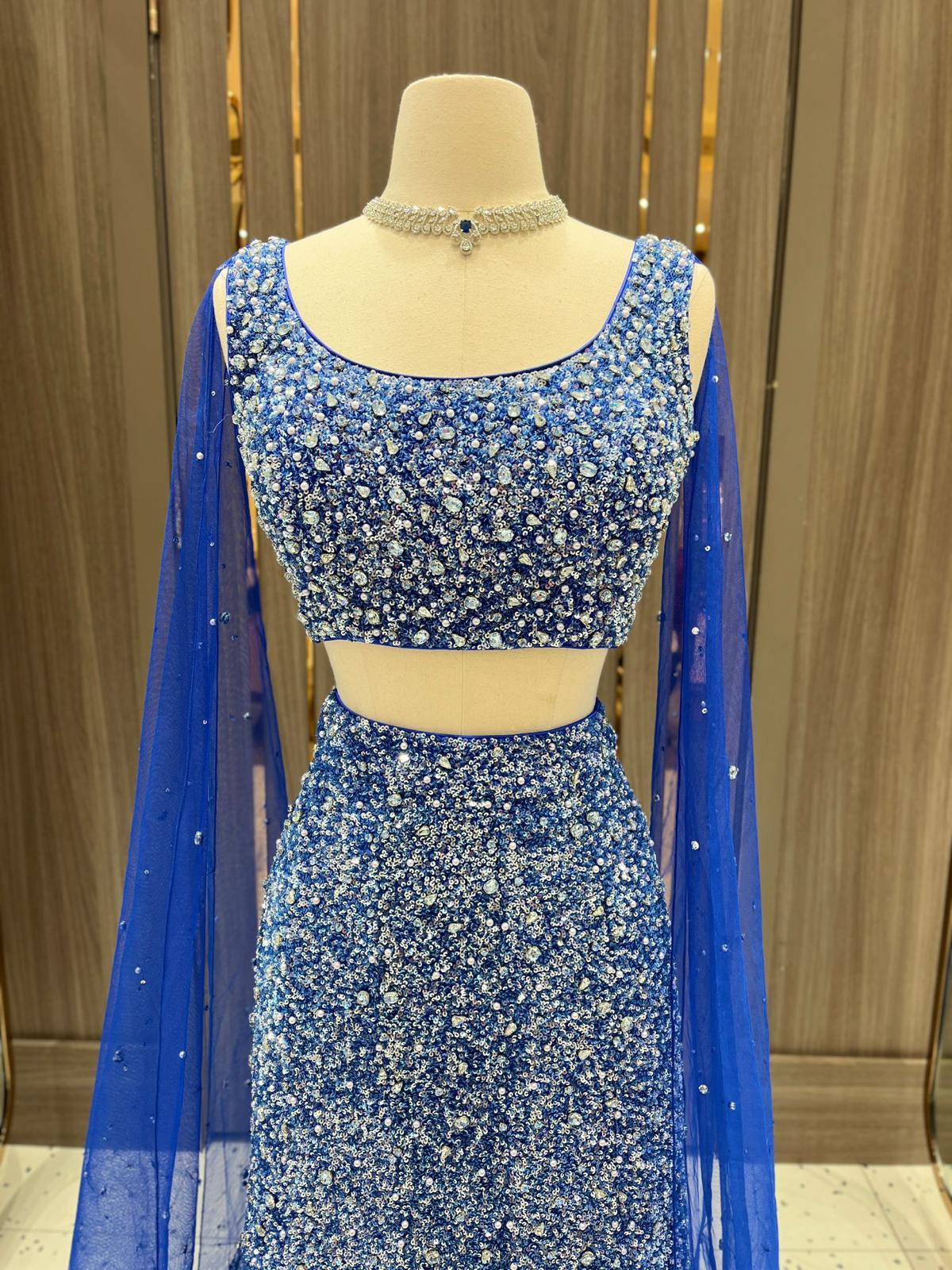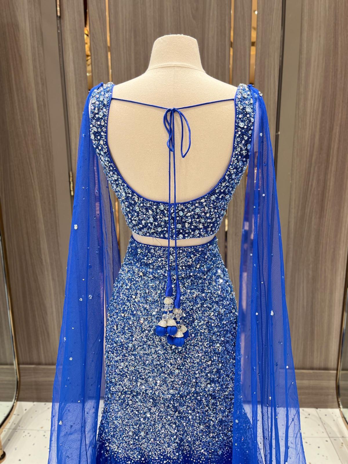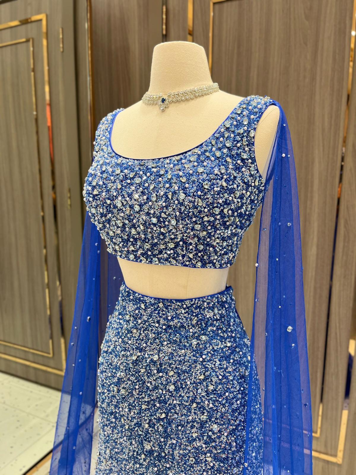 This cobalt blue lehenga is a radiant jewel of the Dhruva Collection. Its blouse and skirt glisten with thousands of sequins and crystals, resembling galaxies scattered across the night sky. A lightweight dupatta adds an airy finish to this couture constellation.