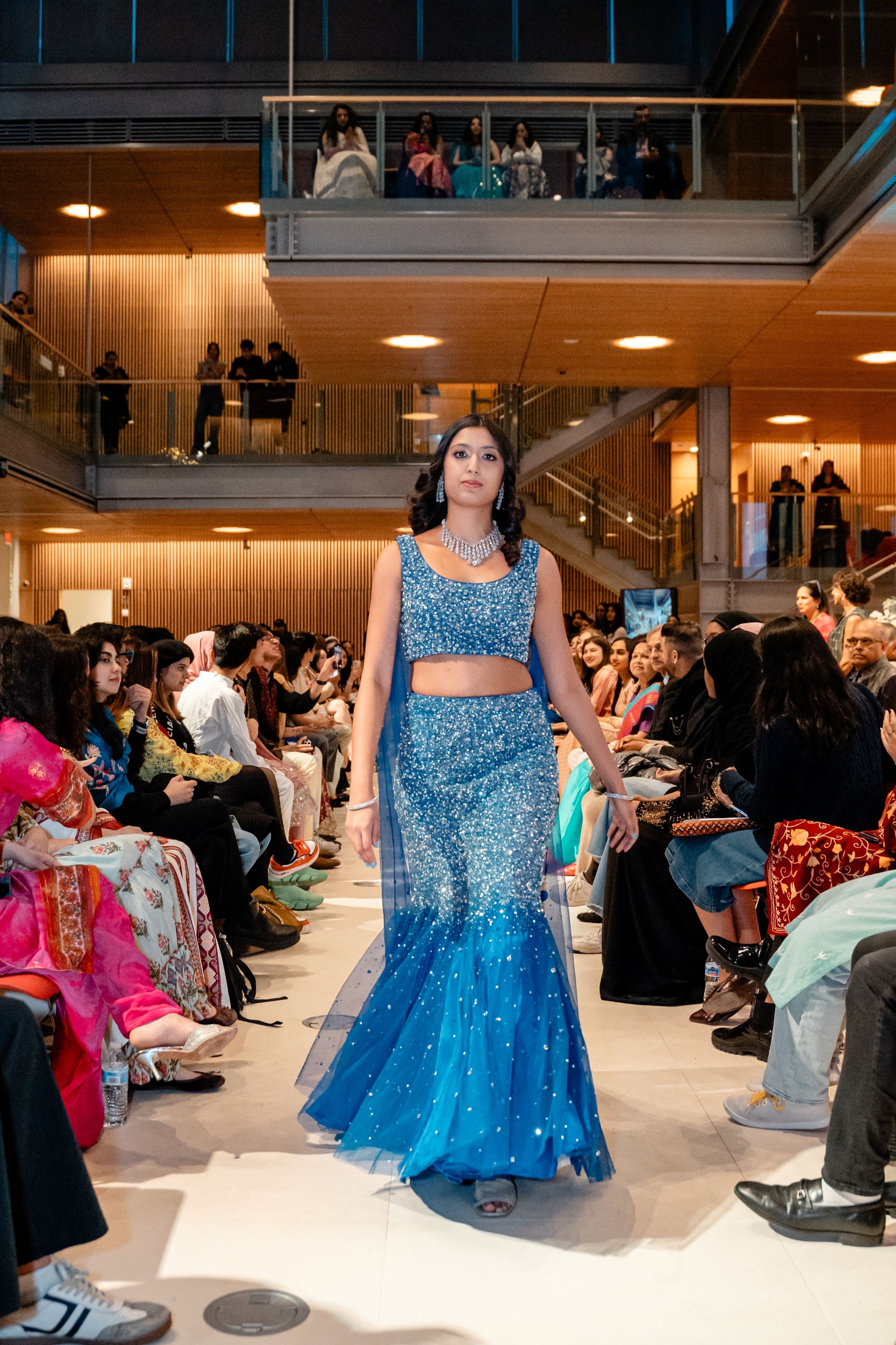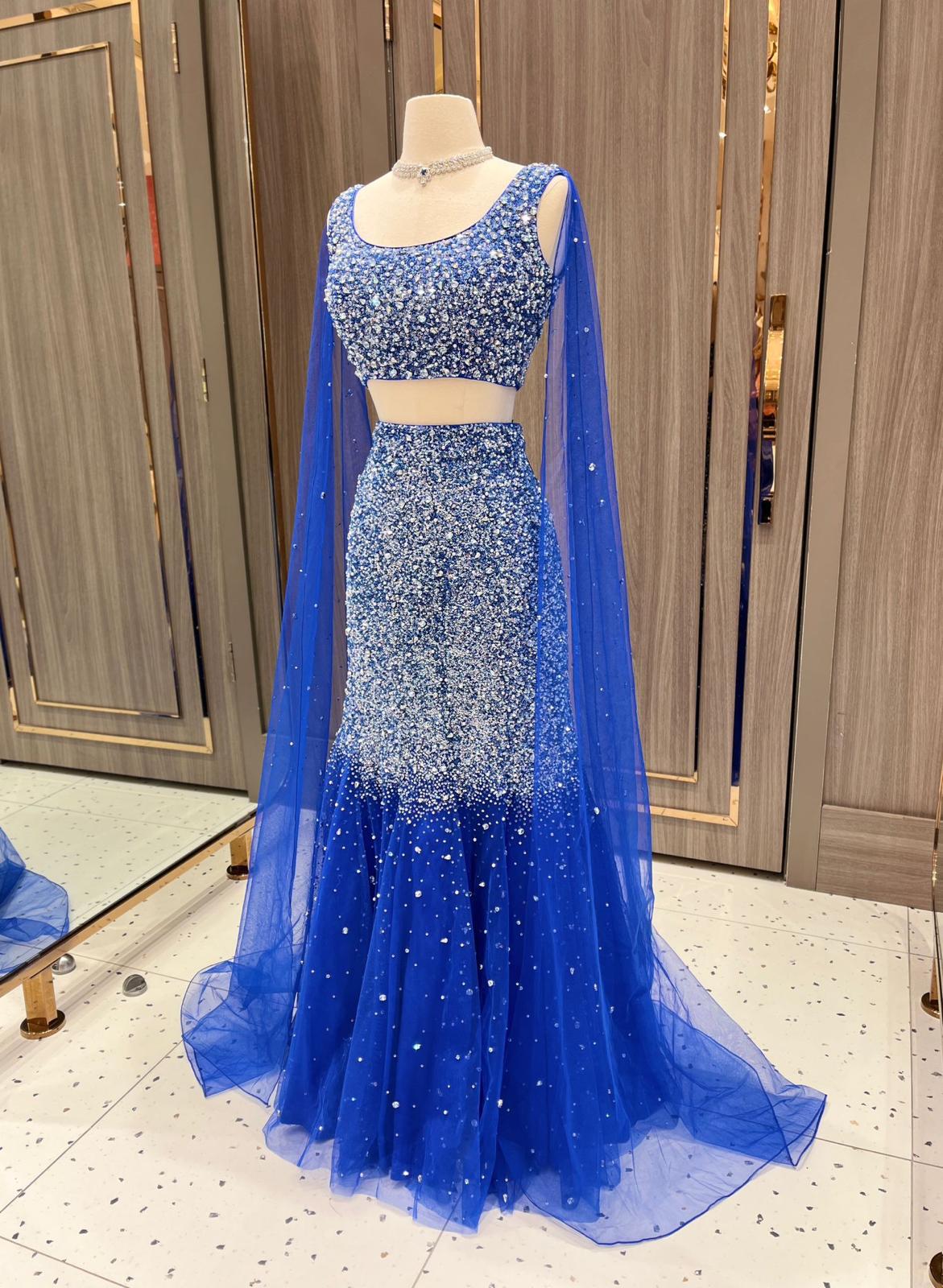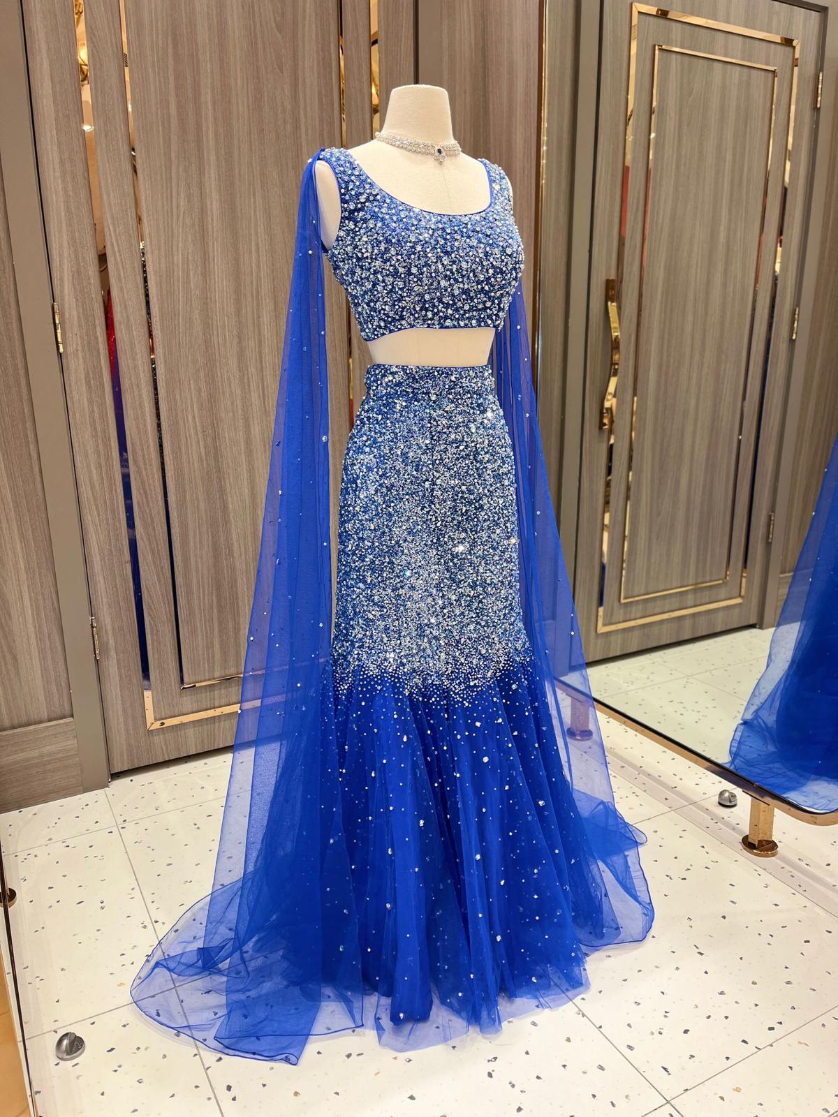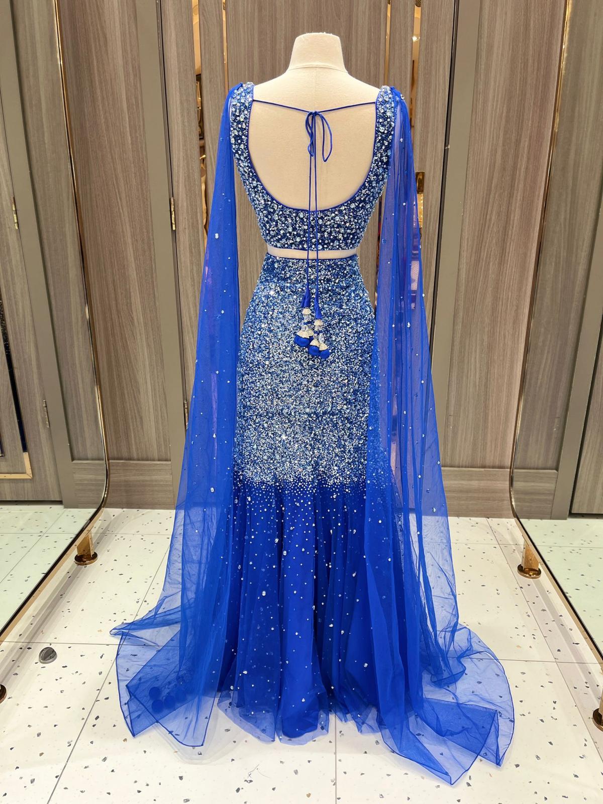 This cobalt blue lehenga is a radiant jewel of the Dhruva Collection. Its blouse and skirt glisten with thousands of sequins and crystals, resembling galaxies scattered across the night sky. A lightweight dupatta adds an airy finish to this couture constellation.