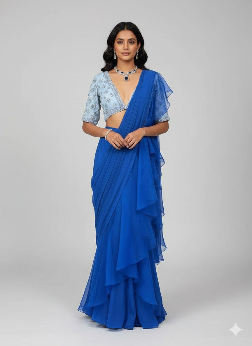 Ethereal and modern, this Dhruva Collection pre-draped saree brings a playful twist to classic draping. With its floral crystal and pearl blouse, it’s a ready-to-wear vision of celestial elegance.