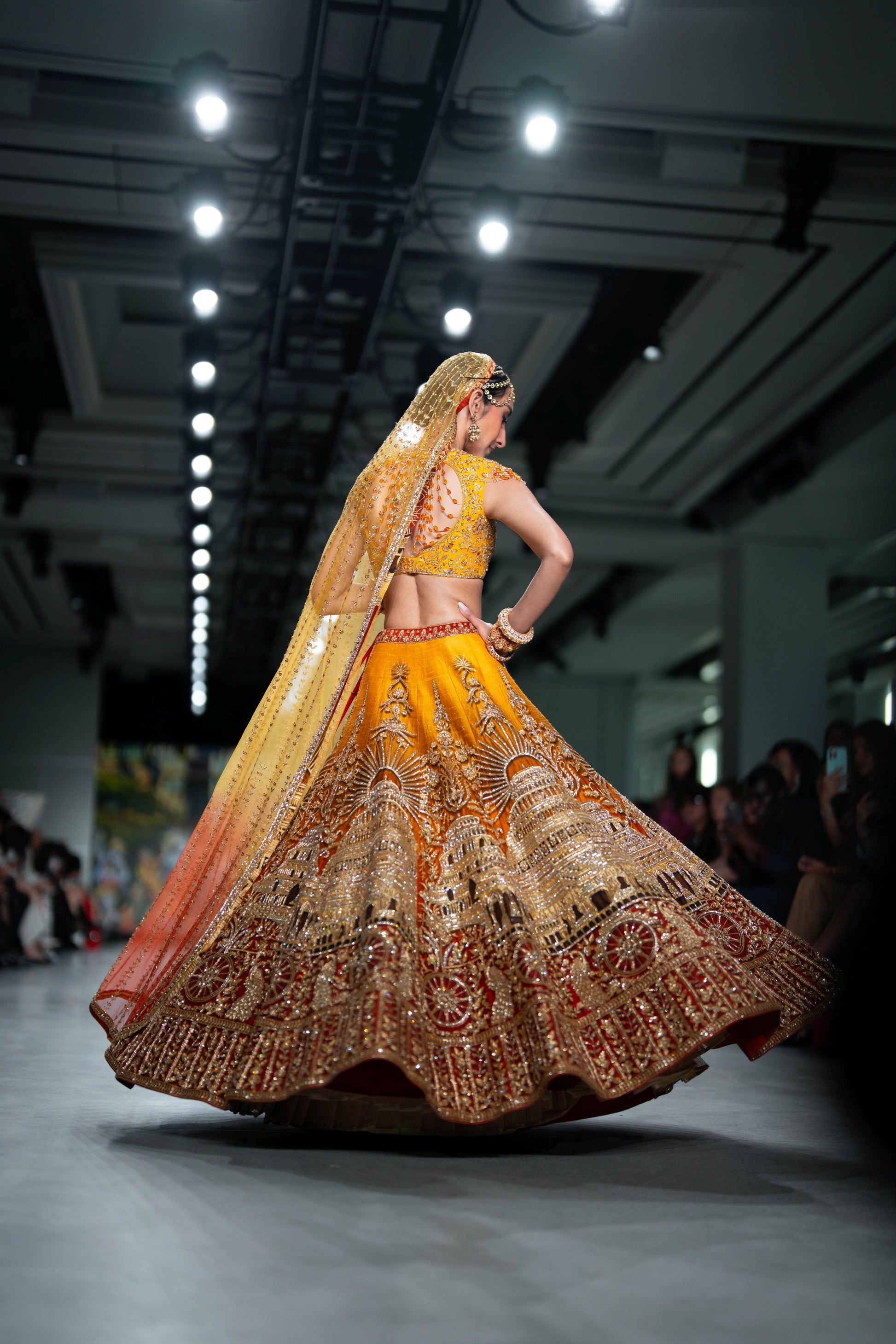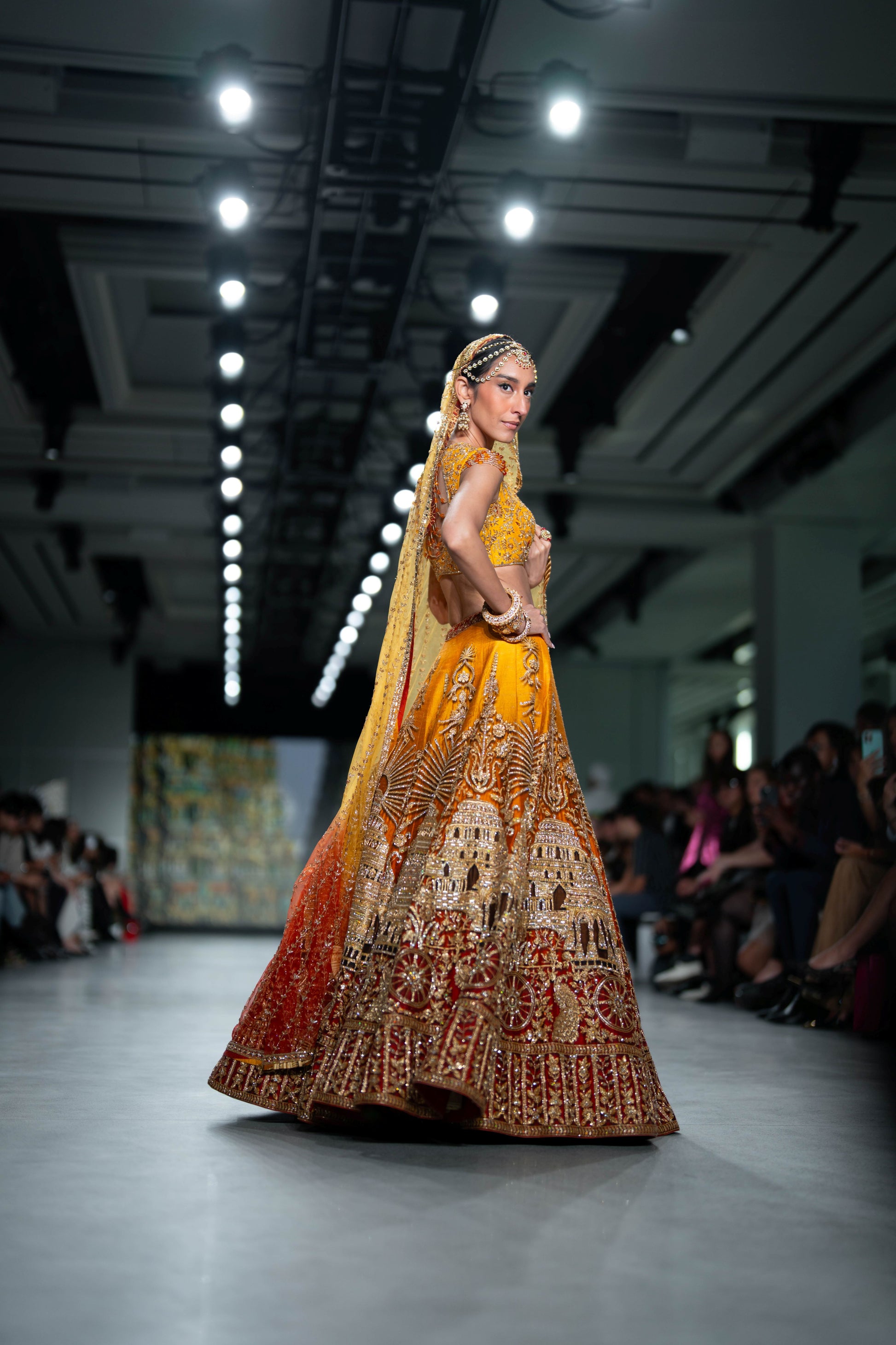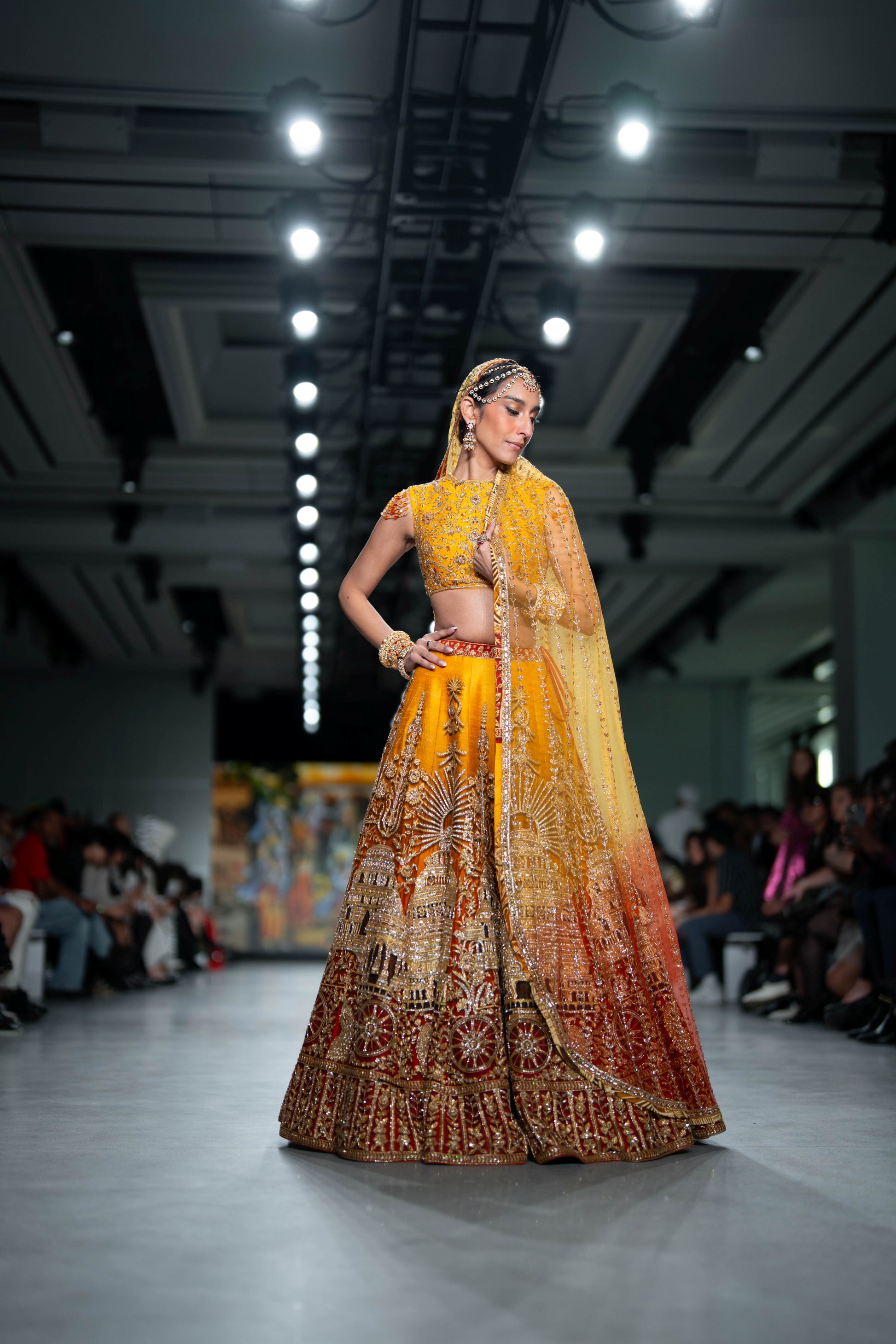 The Sun Temple of Konark was built in the 13th century as a chariot for the Sun God with 24 wheels and seven horses, symbolizing time, movement, and cosmic energy. We translated that into a lehenga by digitally printing elements of the temple design on the lehenga panel and then finished it with intricate handwork to highlight and elevate the design.