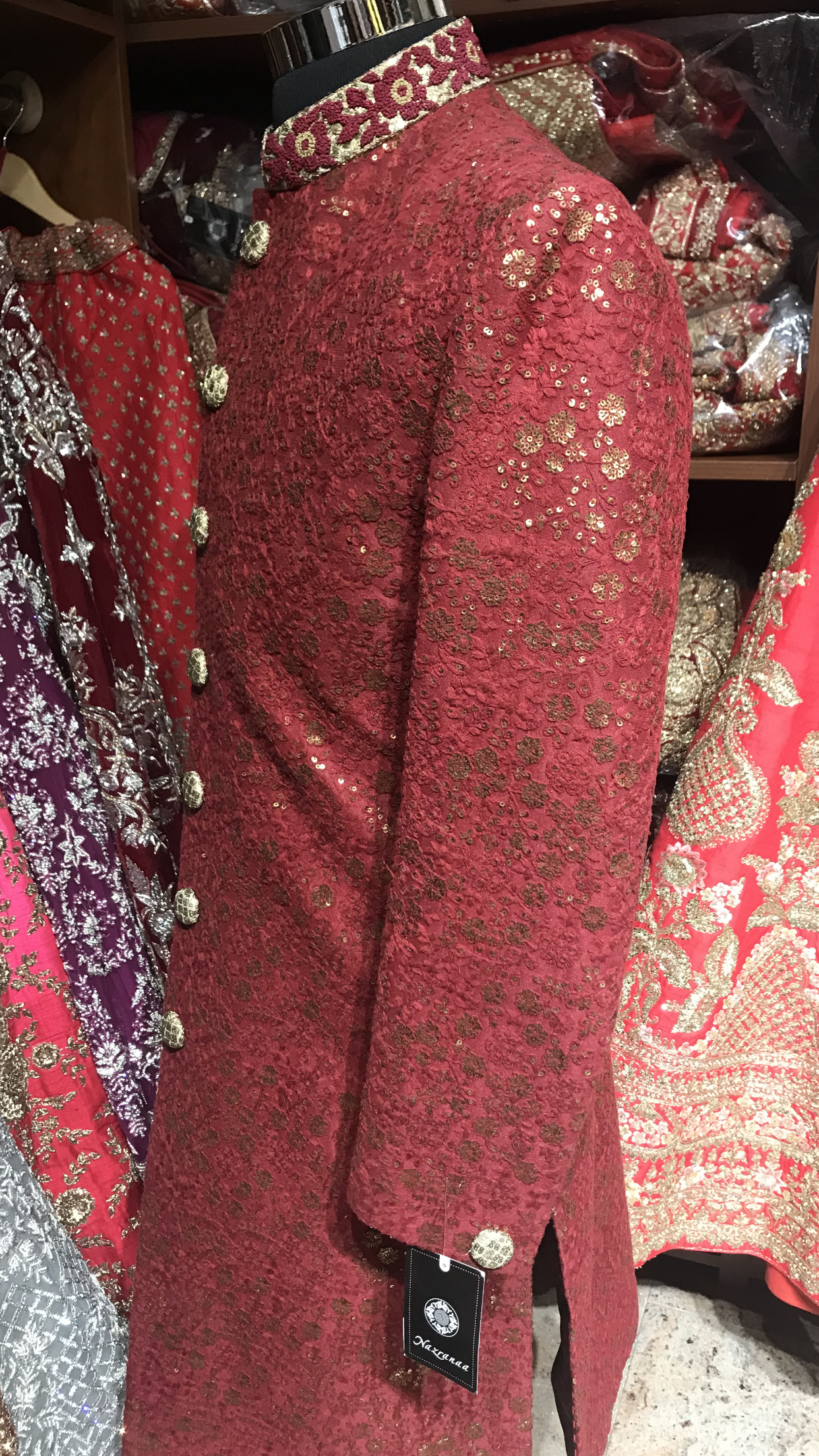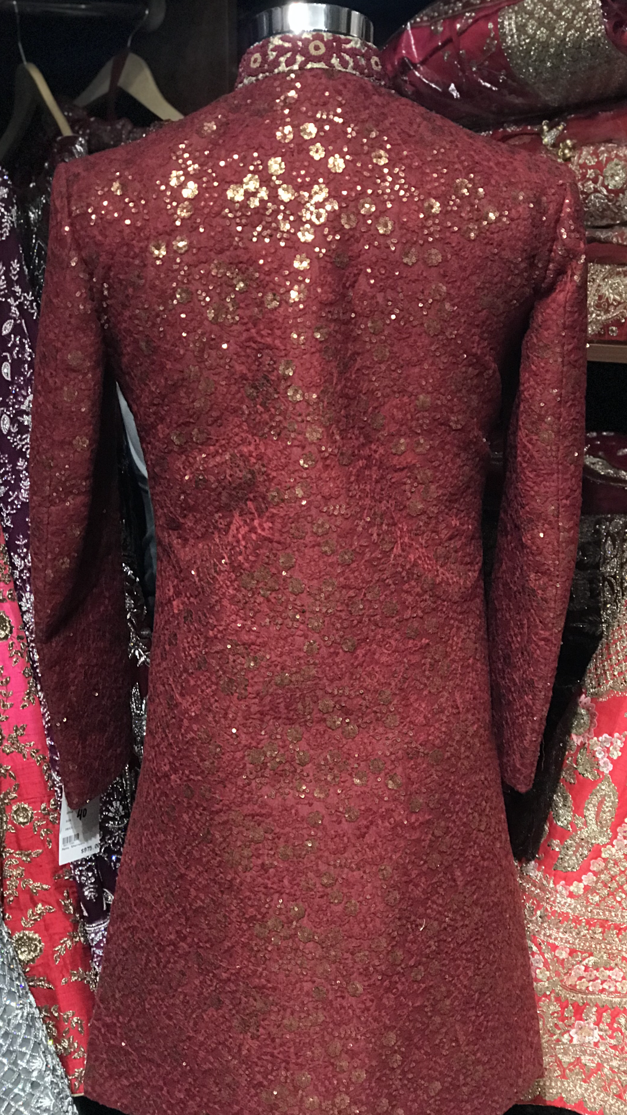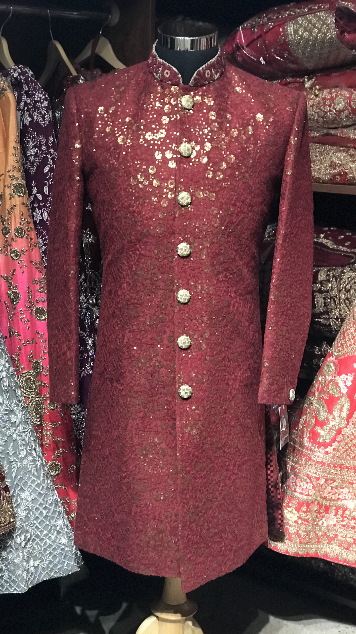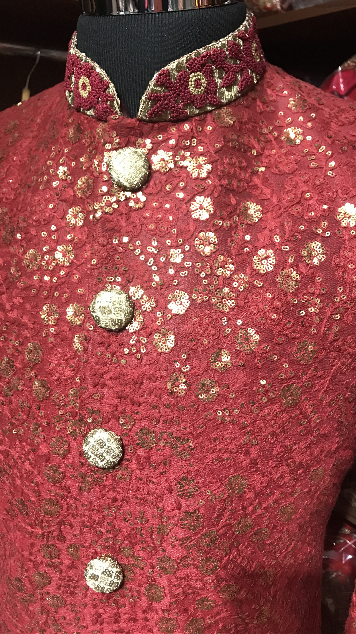 Maroon raw silk sherwani with exquisite tonal embroidery and highlighted sequin embroidery! Paired with a gold chudidar!