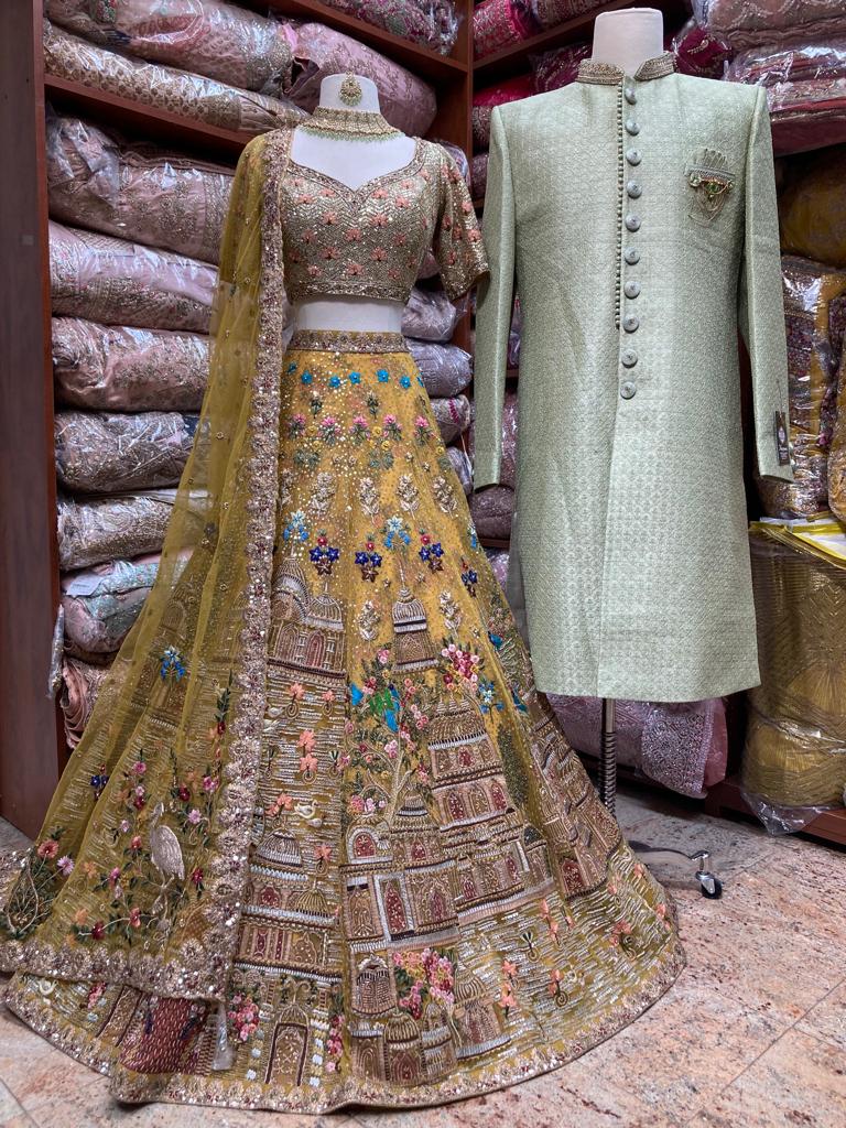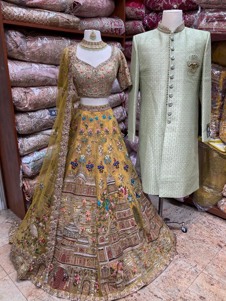 Womens Lehenga: Lemonade Yellow manifesting beautiful jaal of flowers, temple and figurines motifs enriched with intricate embroidery of sequins, thread, pearl, cutdana & stone work enchants royalness. Teamed with similarly embroidered blouse and net dupatta with embroidered borders.
