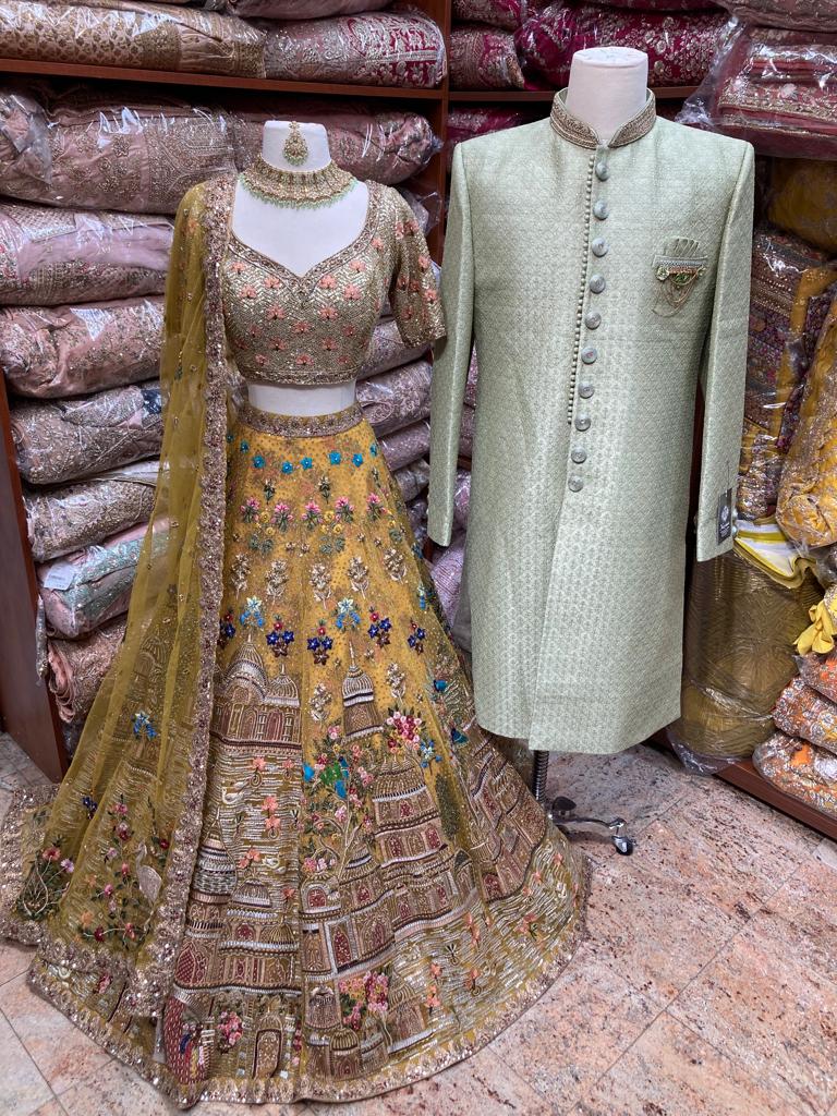Mens Sherwani: sage green brocade sherwani with embroidered buttons and with a broach.