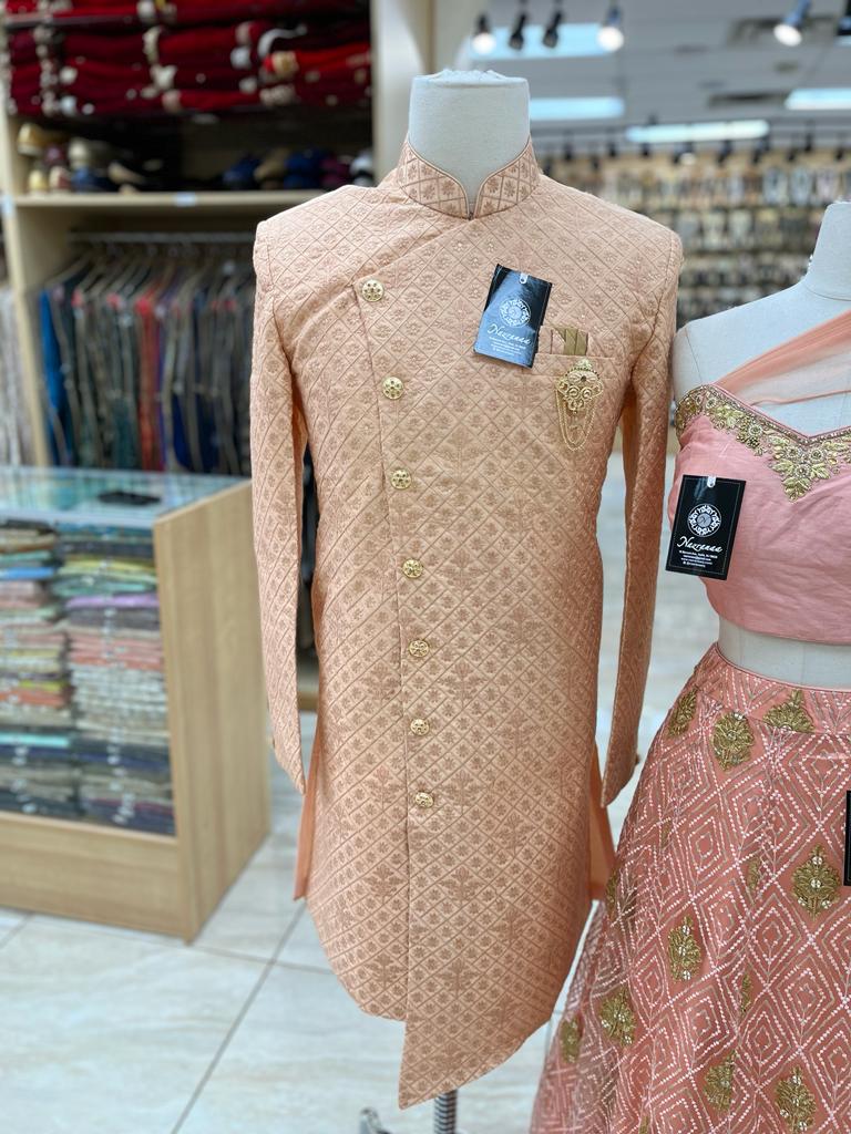 • Thread embroidery Brocade Indo Western with matching gold pants.
