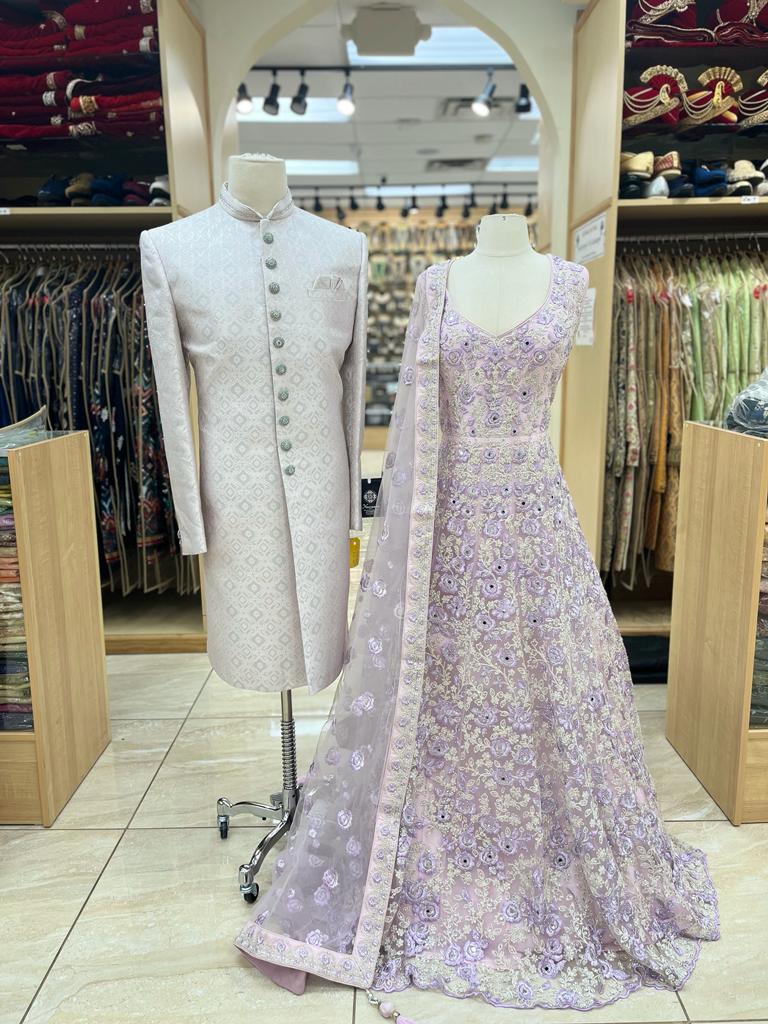 • Lilac Anarkali embroidery with thread and crystal work with net dupatta.