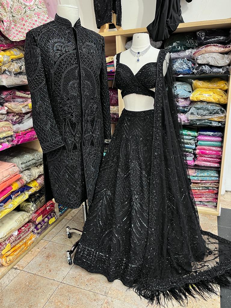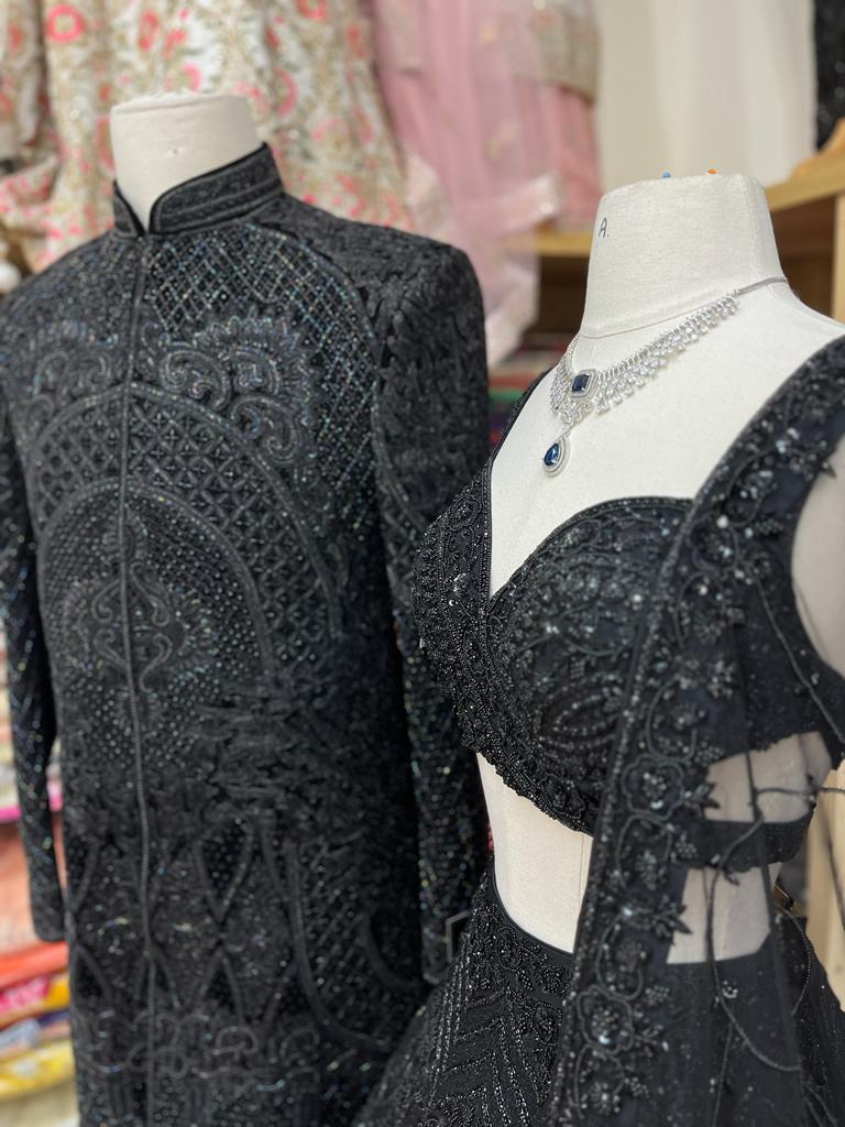 • Pure Balck Velvet sherwani with self resham embroidery. Silver zardosi and crystal work. Paired with a white chudidar