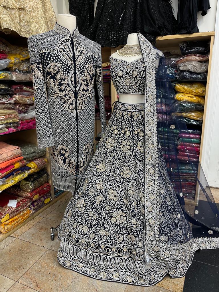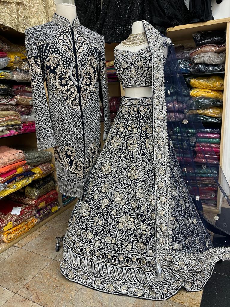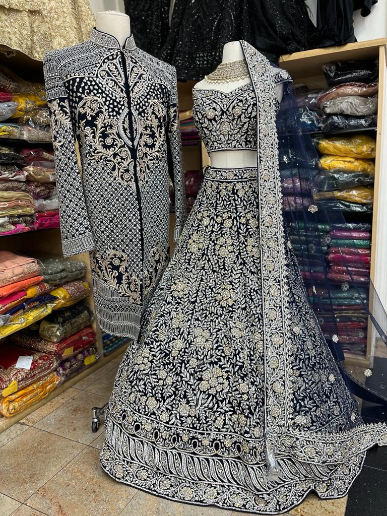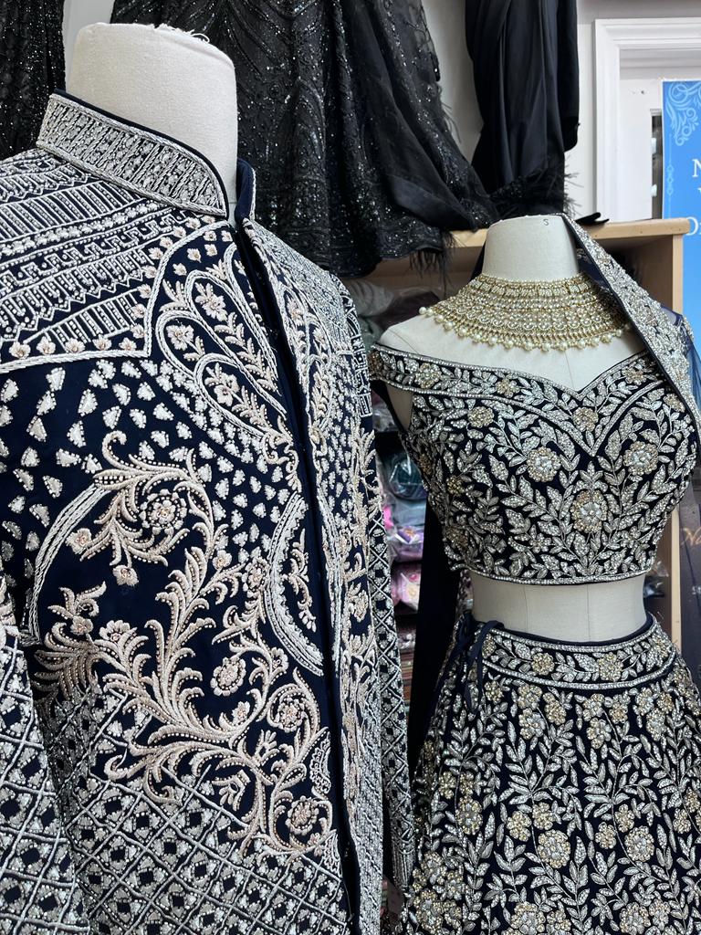 - Oxford blue hand embroidered on velvet in a combination of zardozi, resham ,sequins and pearl embroidery highlighted in stonework and floral embellishment lehenga teamed with similarly embroidered blouse and includes net dupatta.