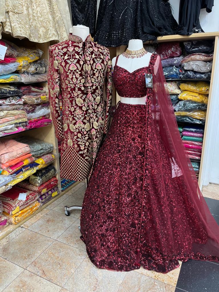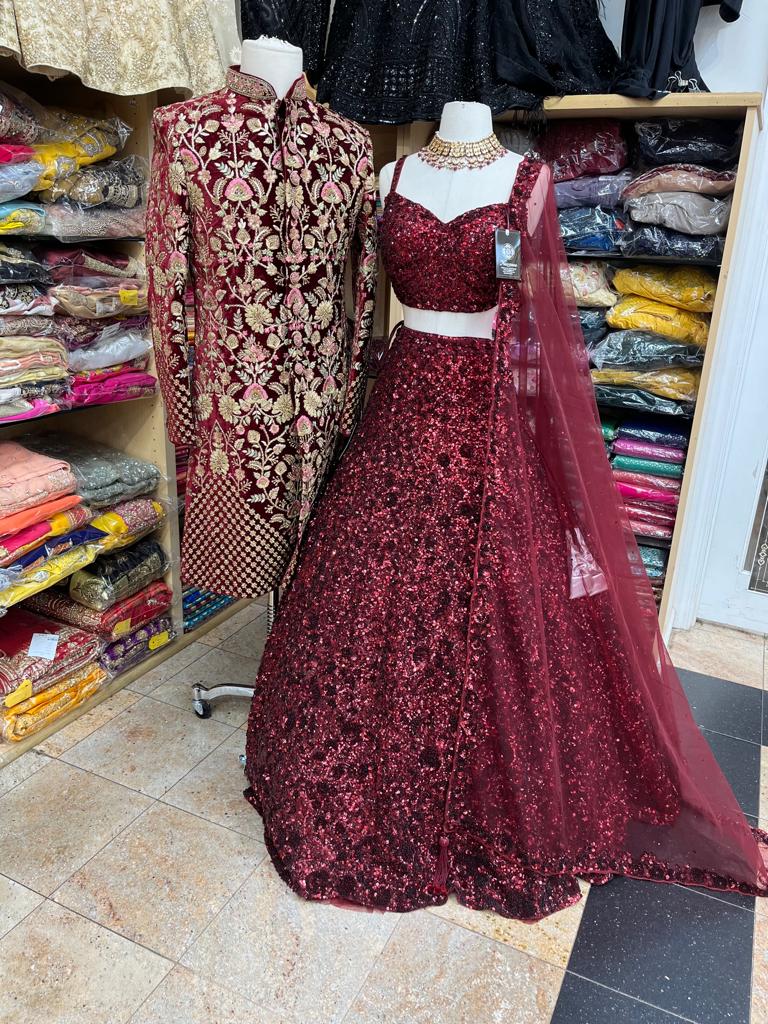 • The maroon lehenga embroidered with sequins all over the lehenga and comes with same work on the blouse and net dupatta