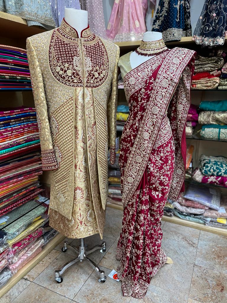 • A satin silk bridal saree with gold embroidery and a matching blouse piece and bridal dupatta.