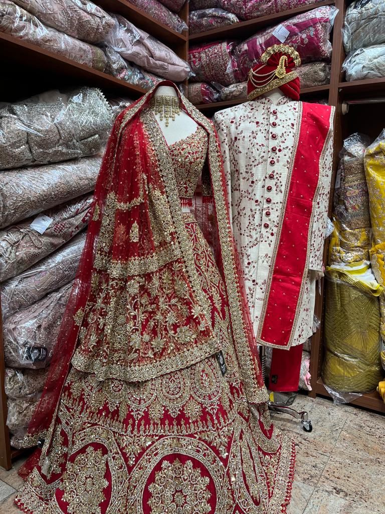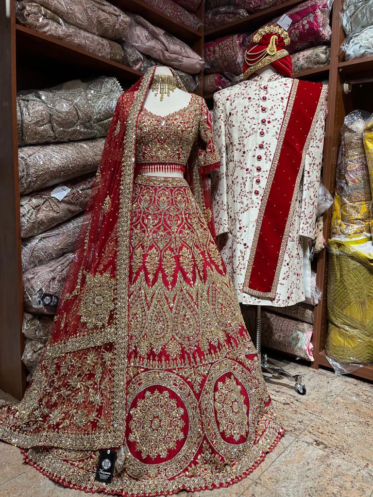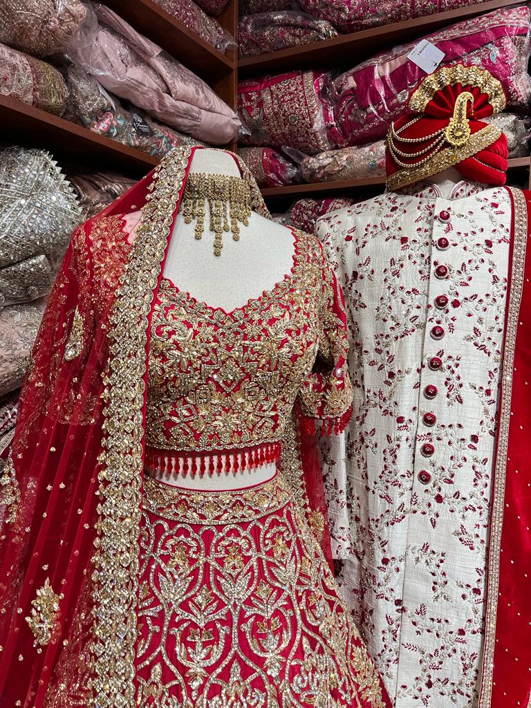 • Red color lehenga intricate with fully sequence, studs motifs thread embroidery and crystal stone flared lehenga. Styled with a matching blouse and net dupatta.