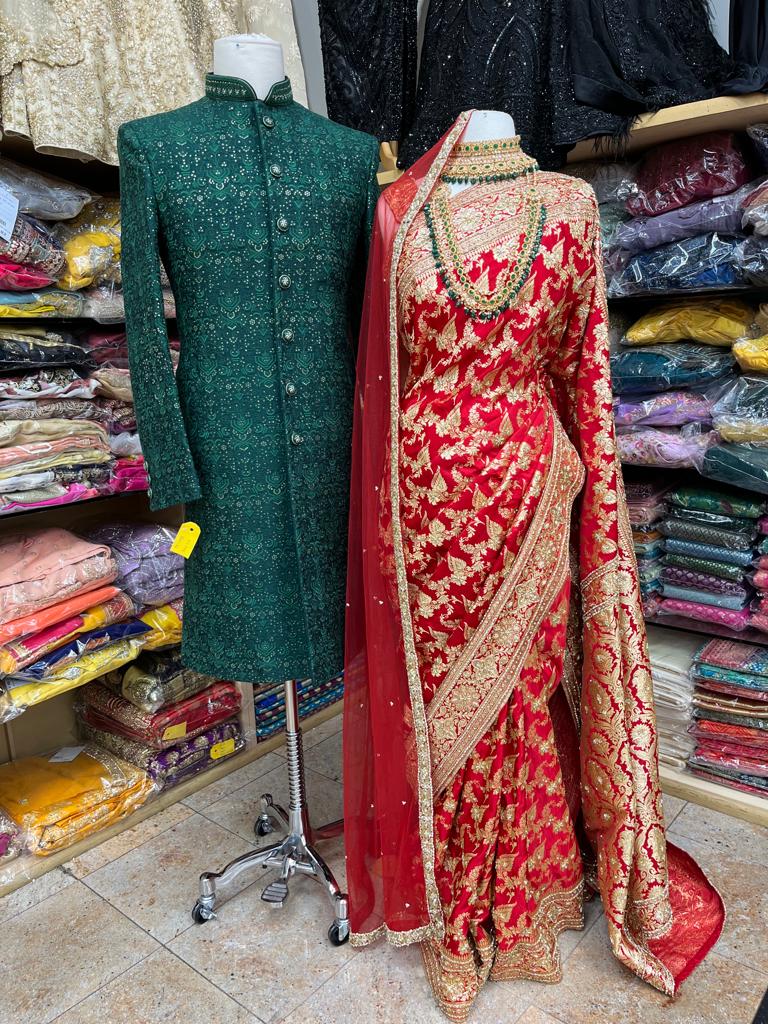 • A pure silk banarasi bridal saree with gold embroidery and a matching blouse piece and bridal dupatta.