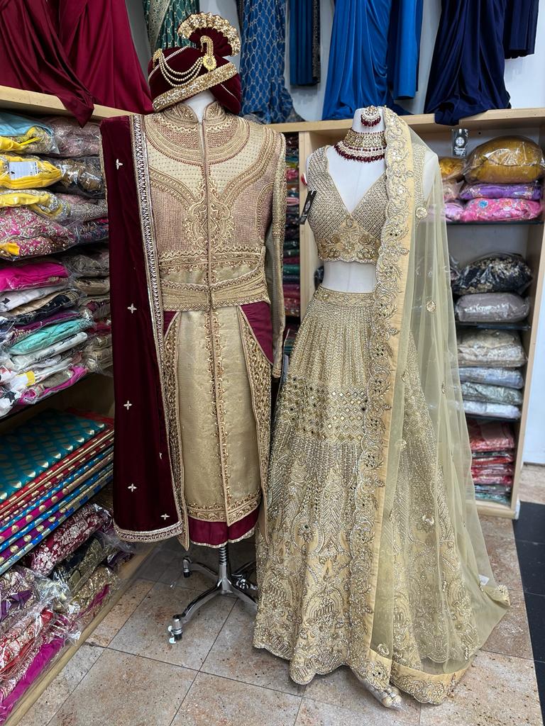 • Gold color lehenga intricate with fully sequence, studs motifs thread embroidery and crystal stone flared lehenga. Styled with a matching blouse and net dupatta.
