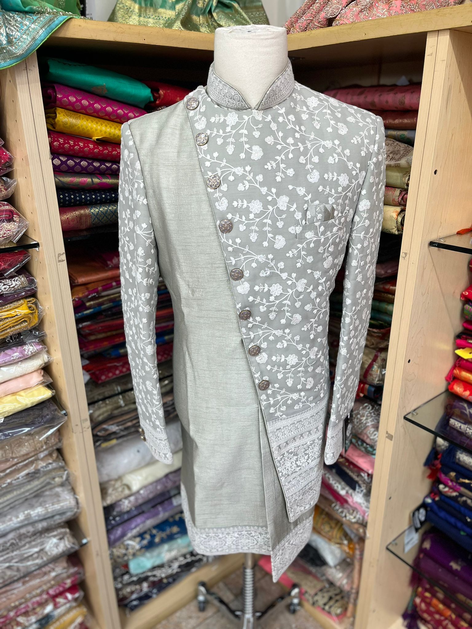 Beautiful Asymmetric Gray Sherwani with thread work and chain from the buttons.