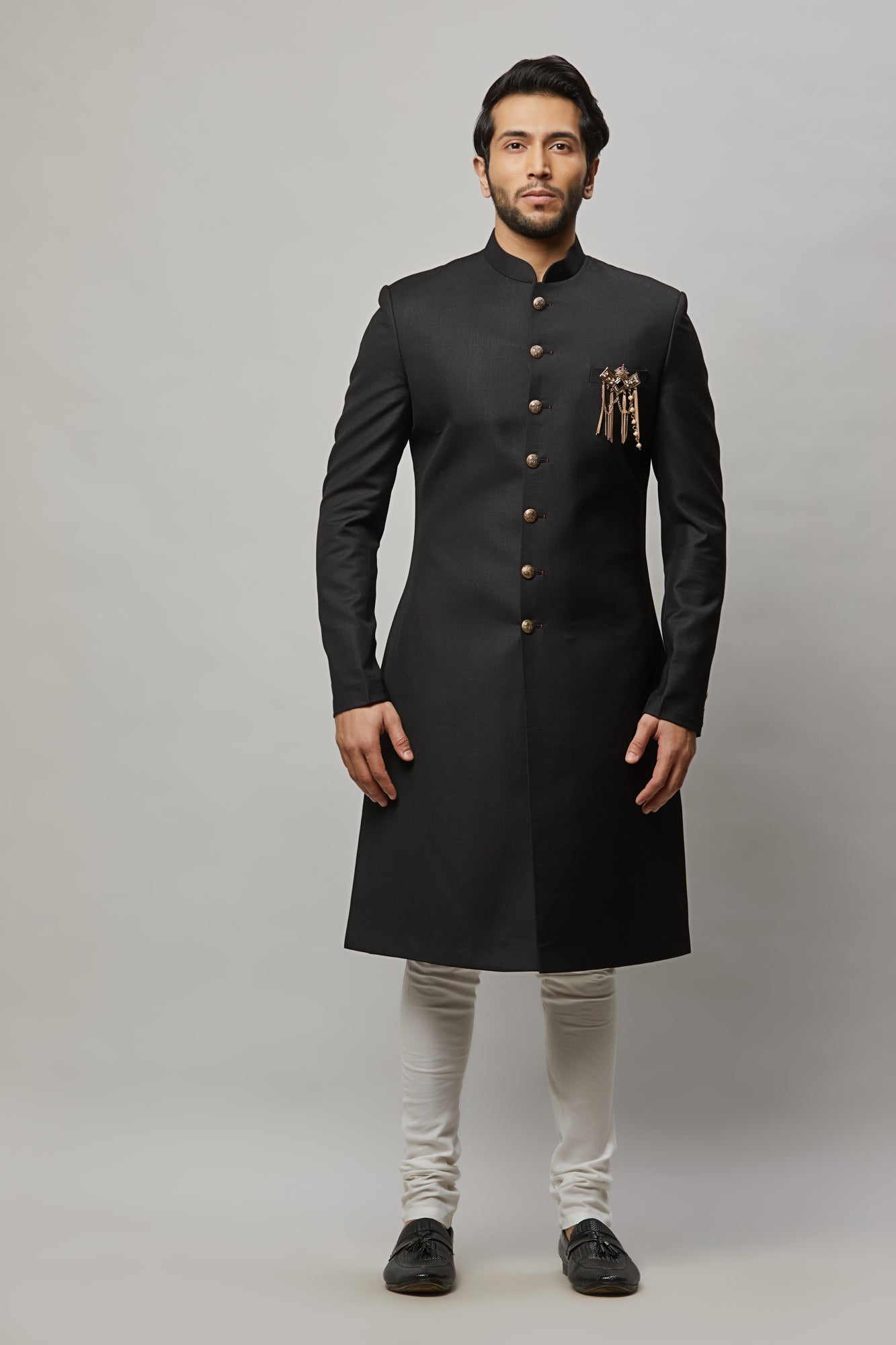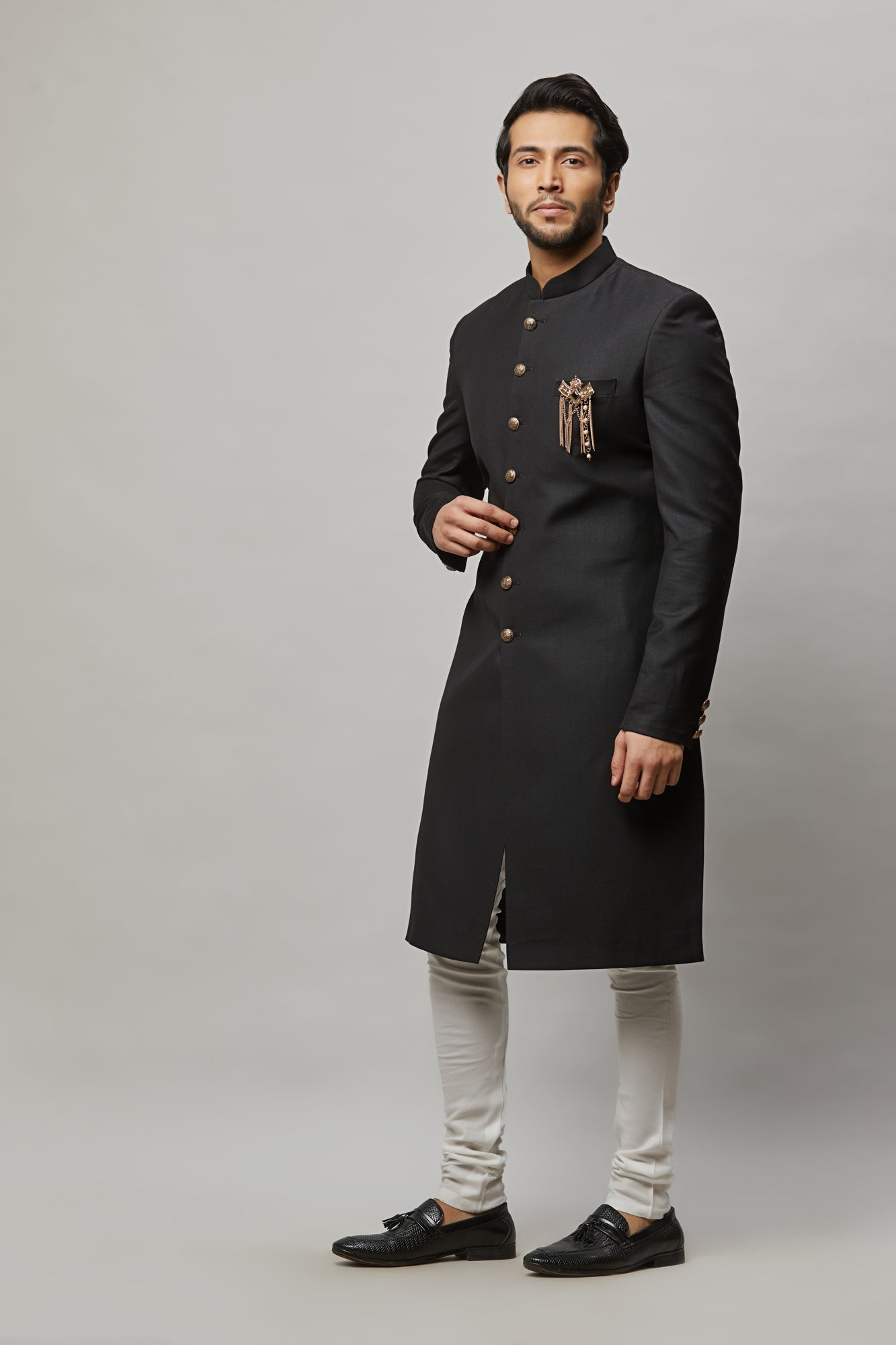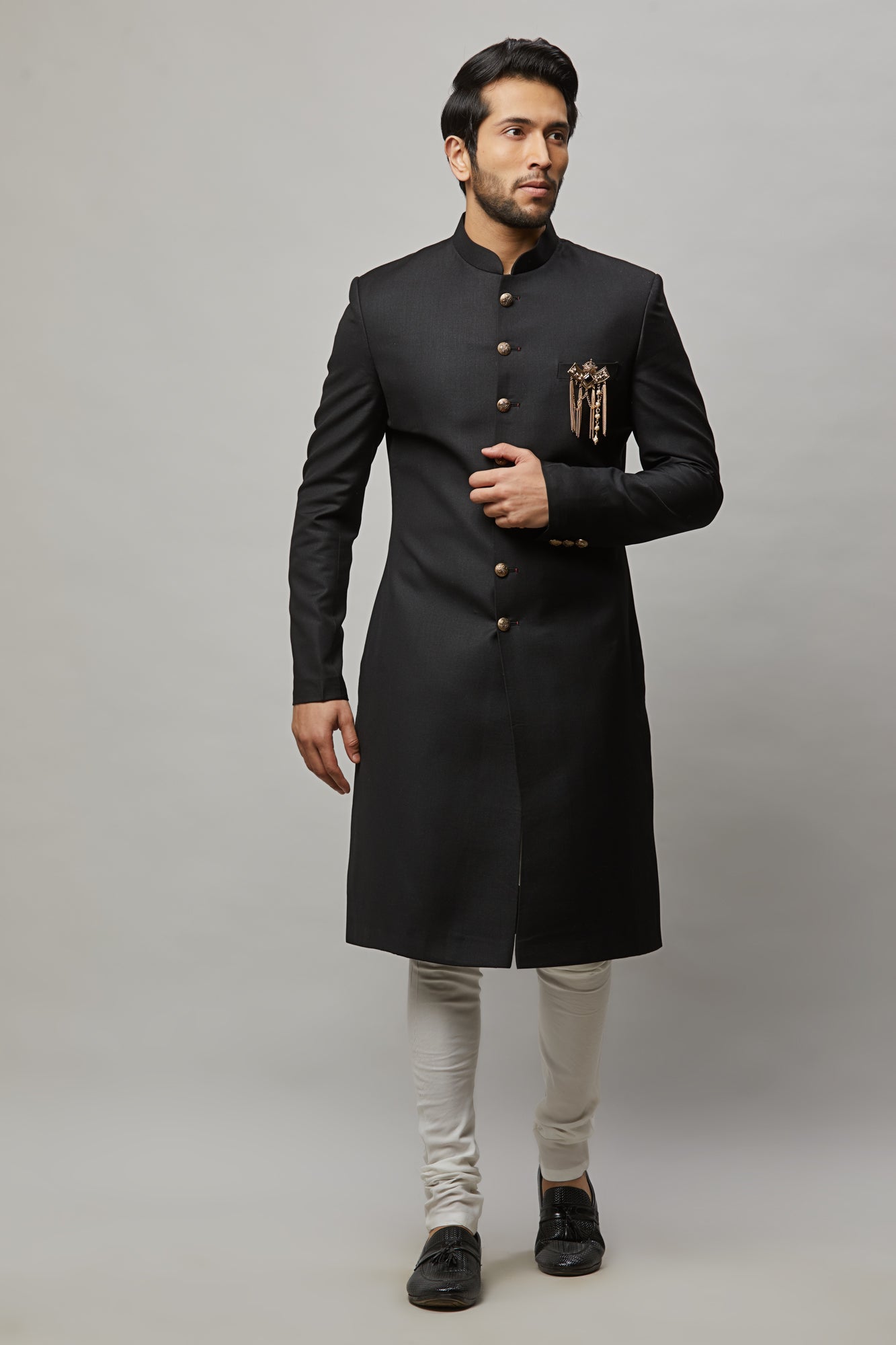 • Men's classic black sherwani with broach
