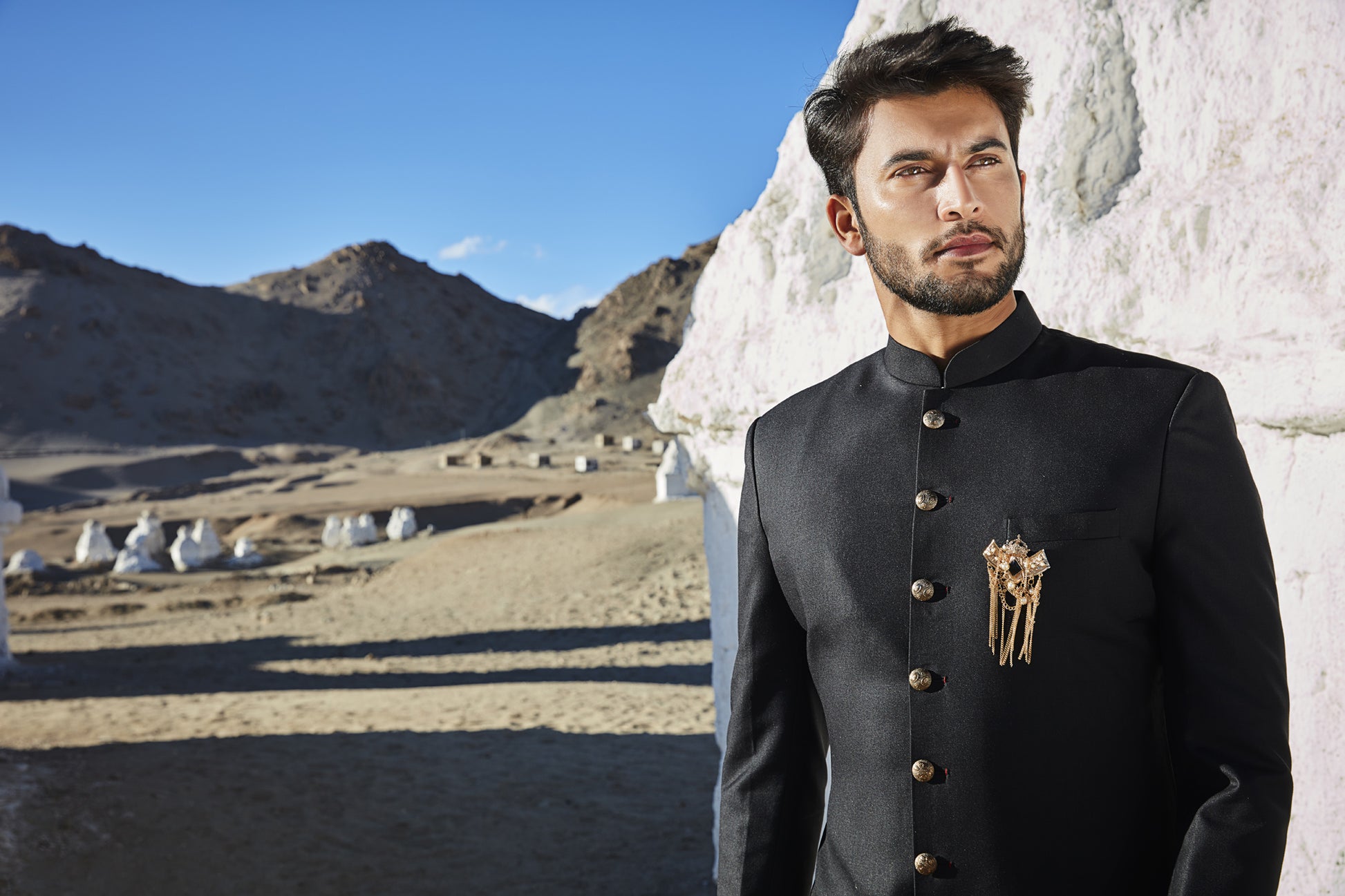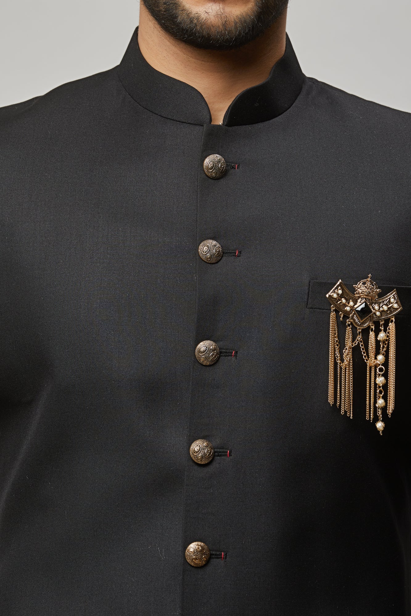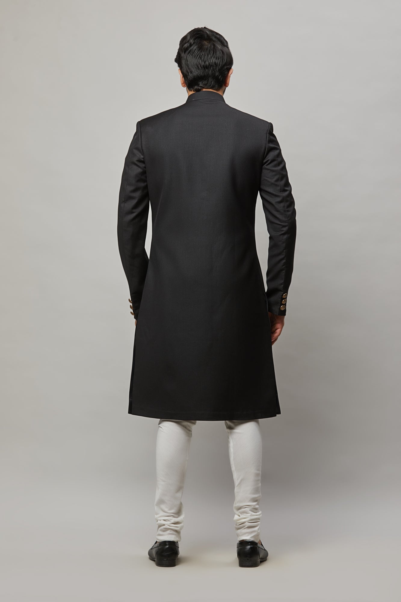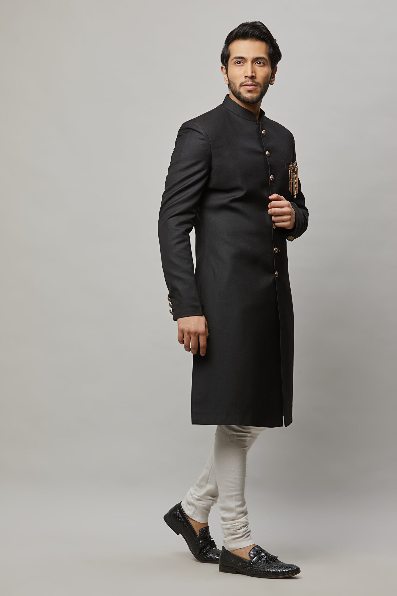 • Men's classic black sherwani with broach