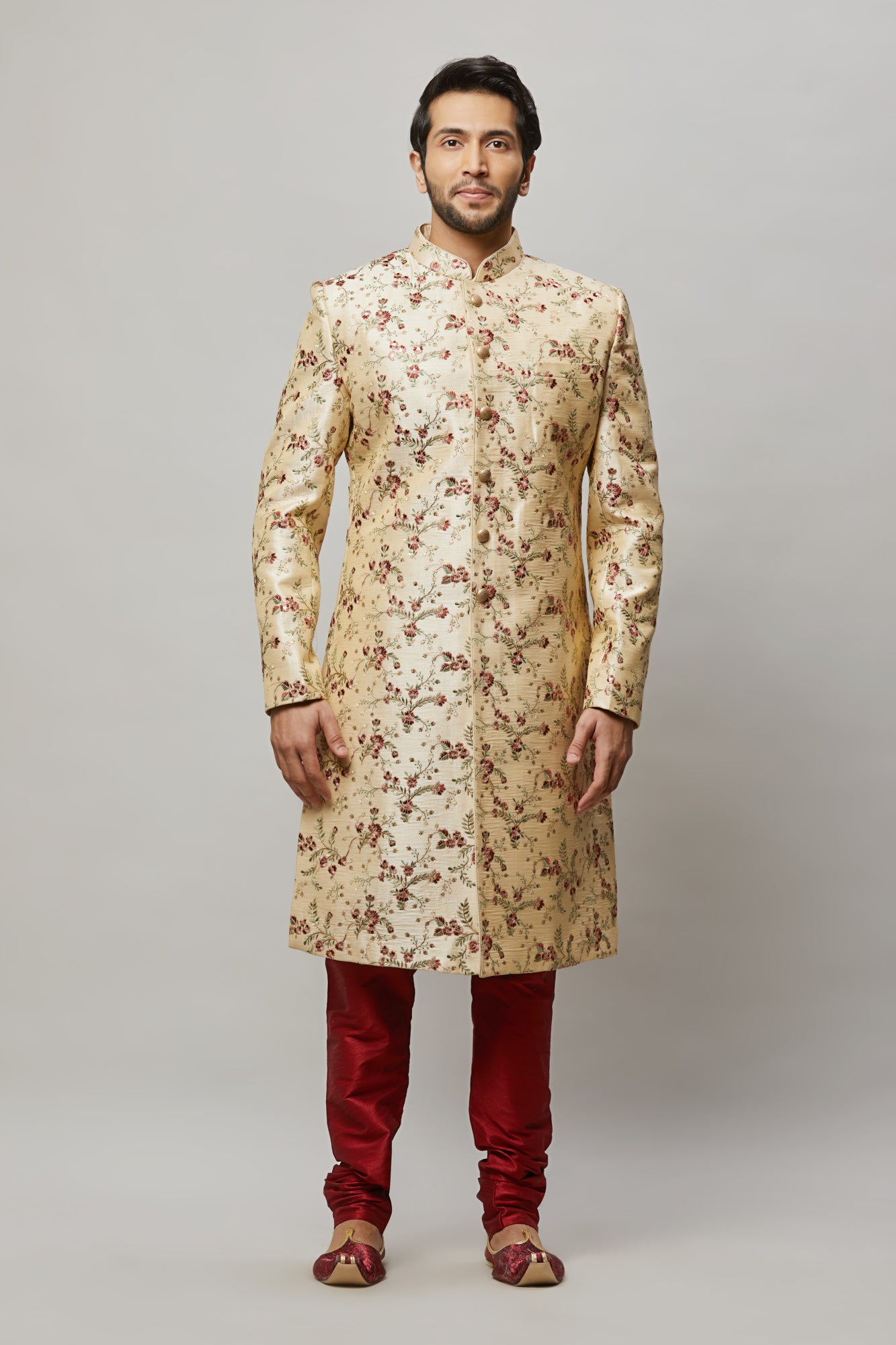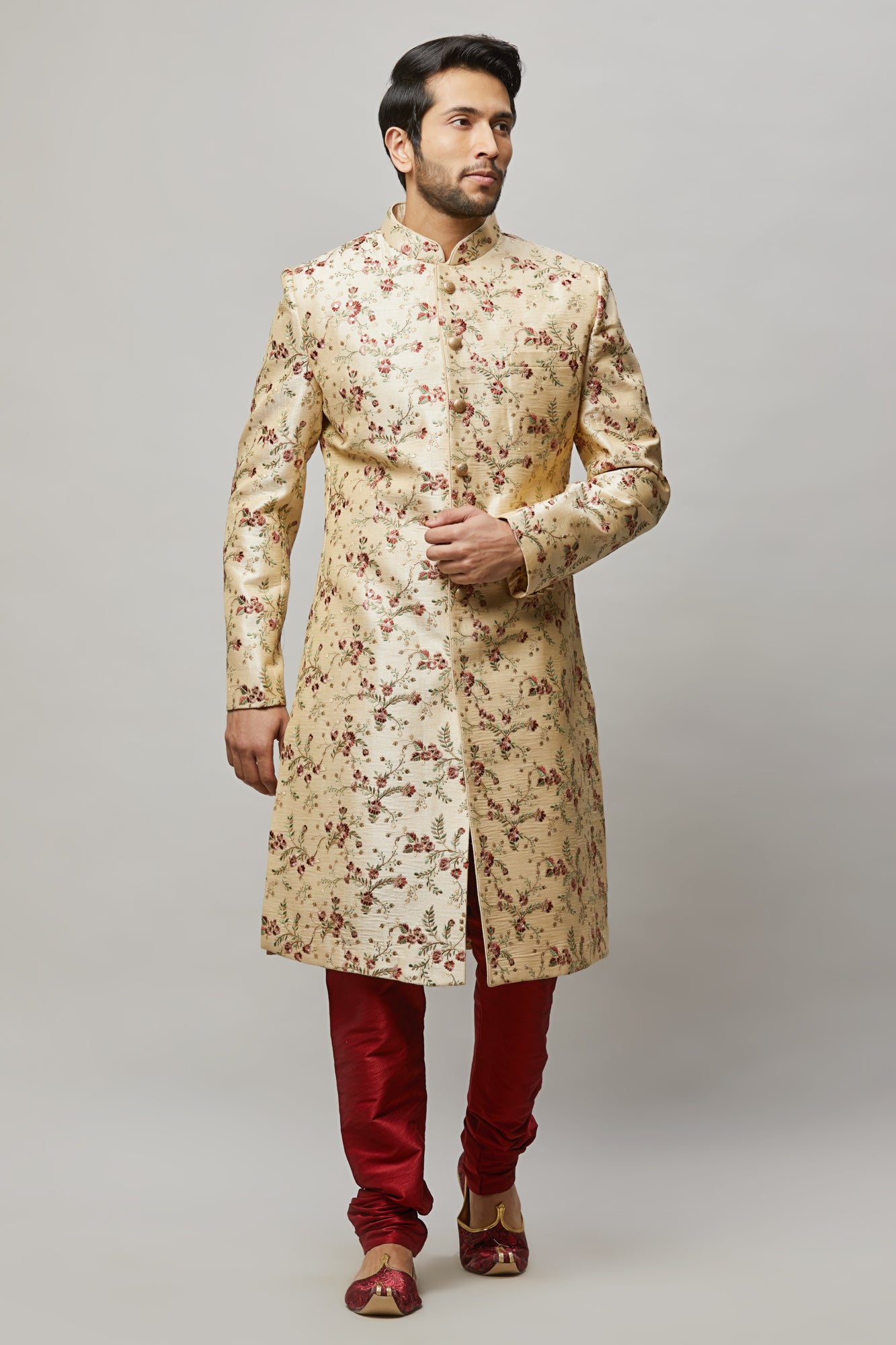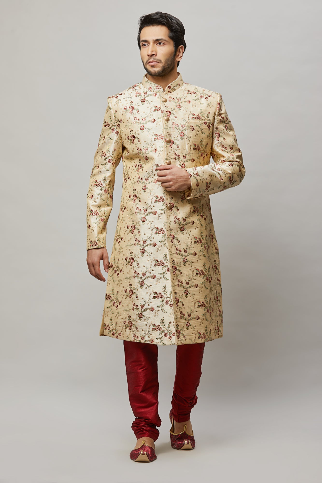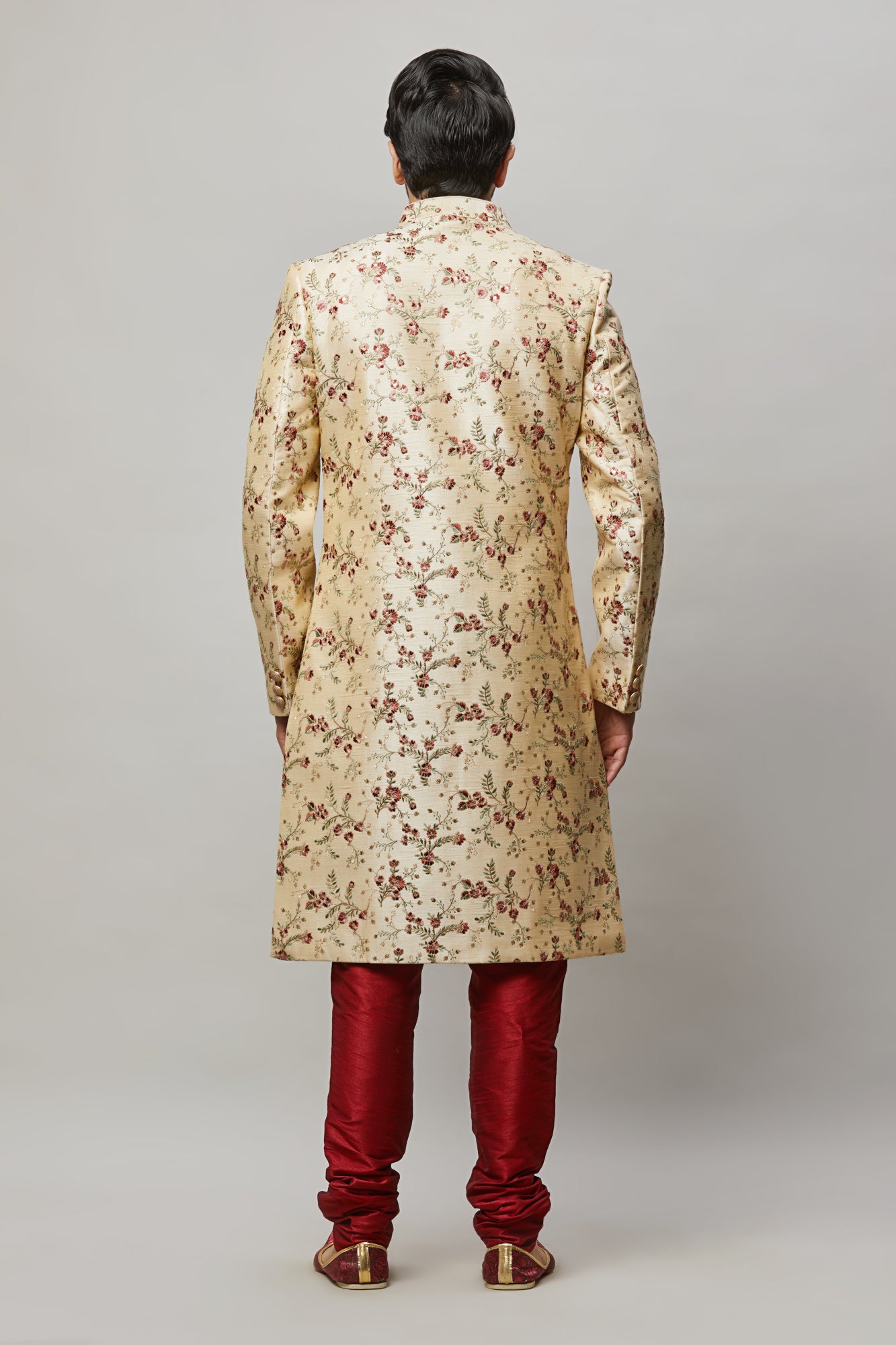• Men's floral embroidered sherwani with shades of Red, Blush & Sage in the flowers and petal