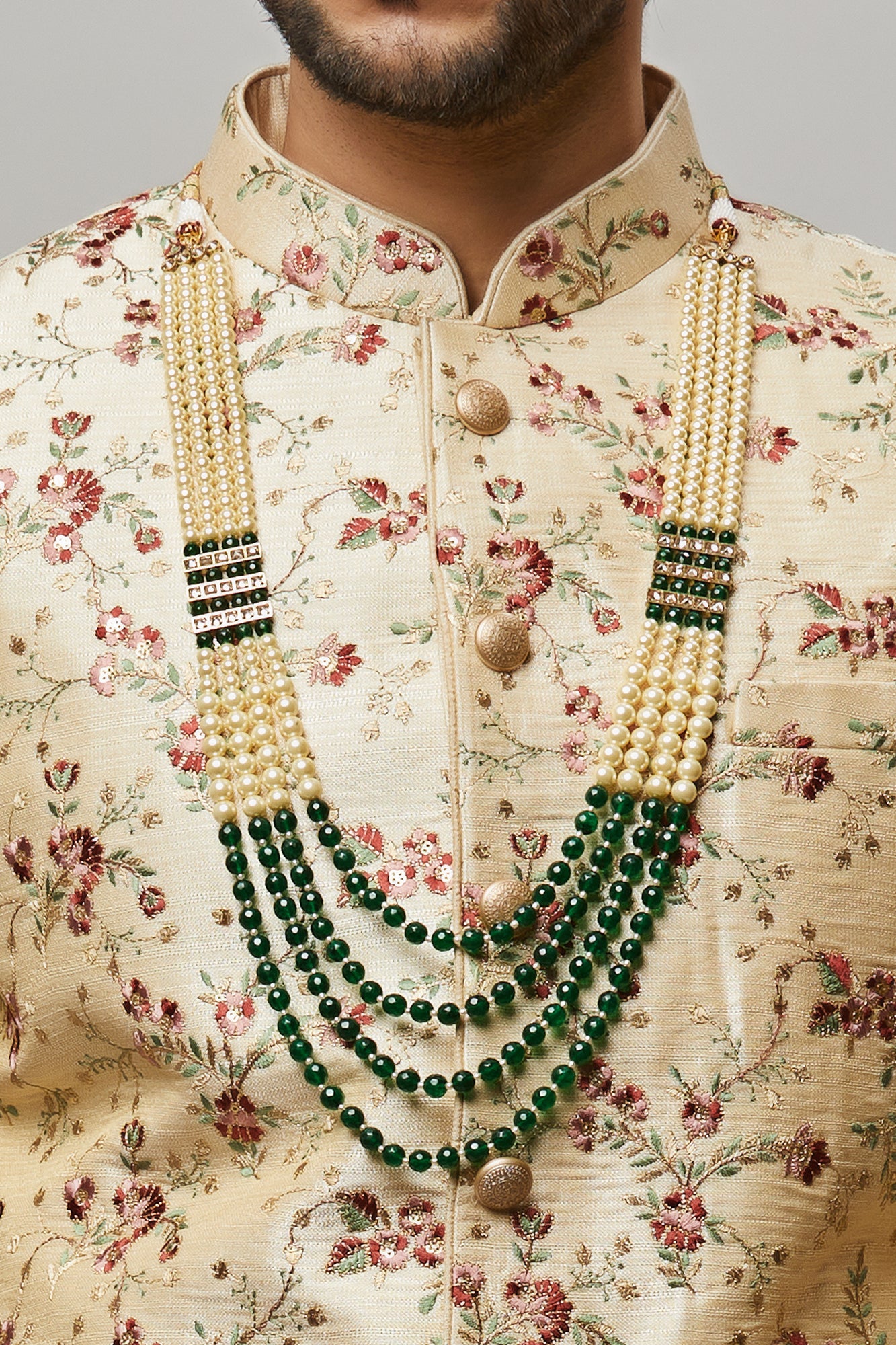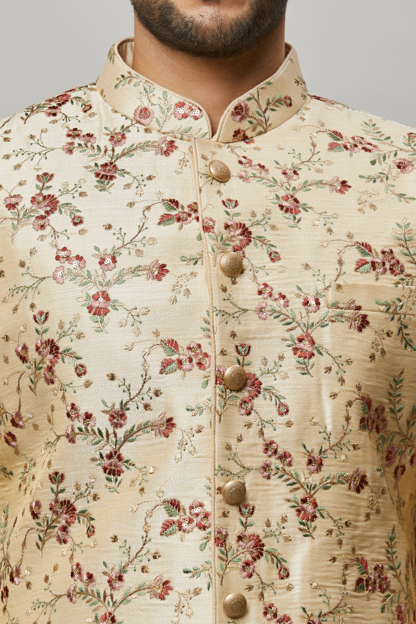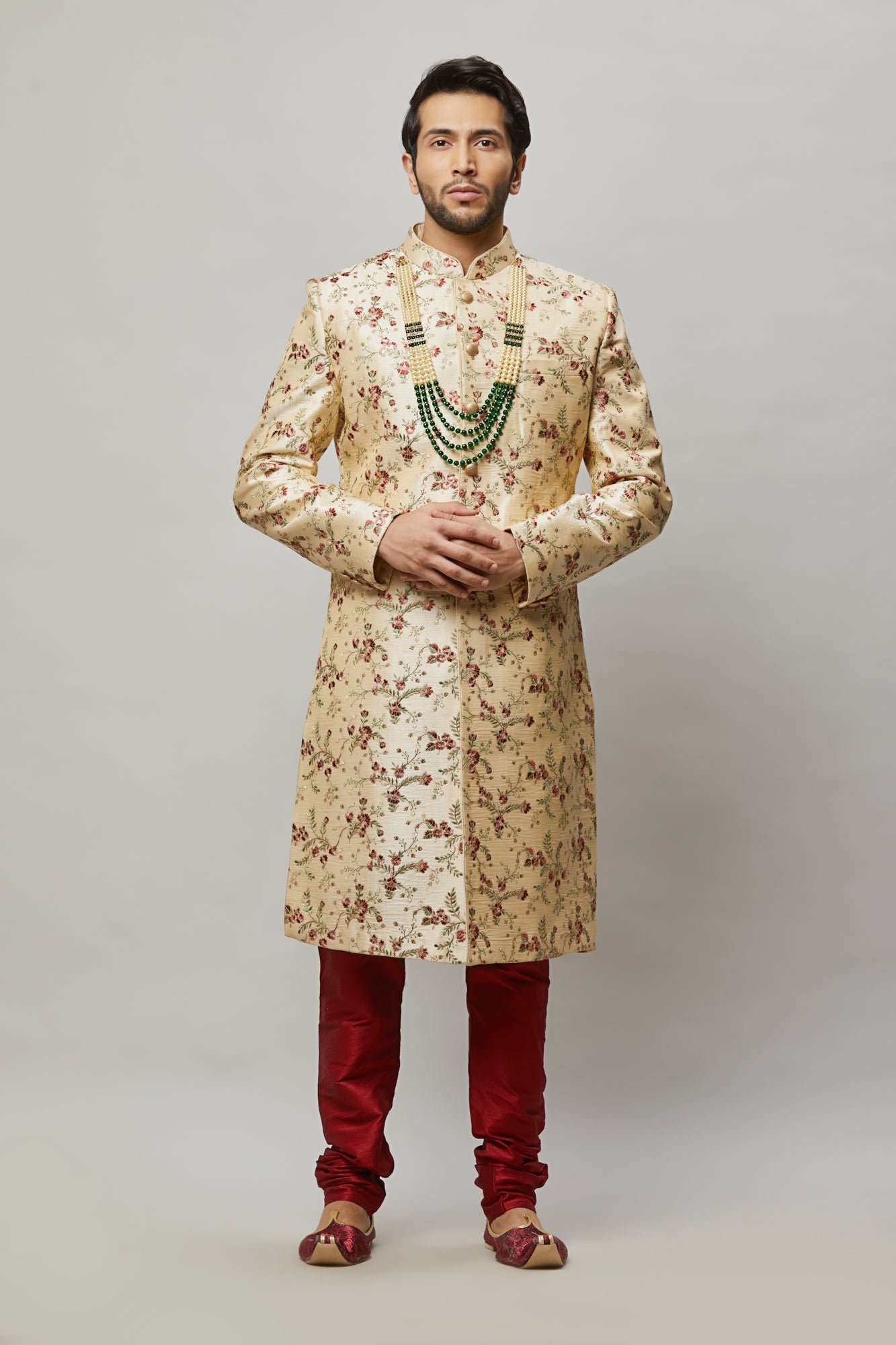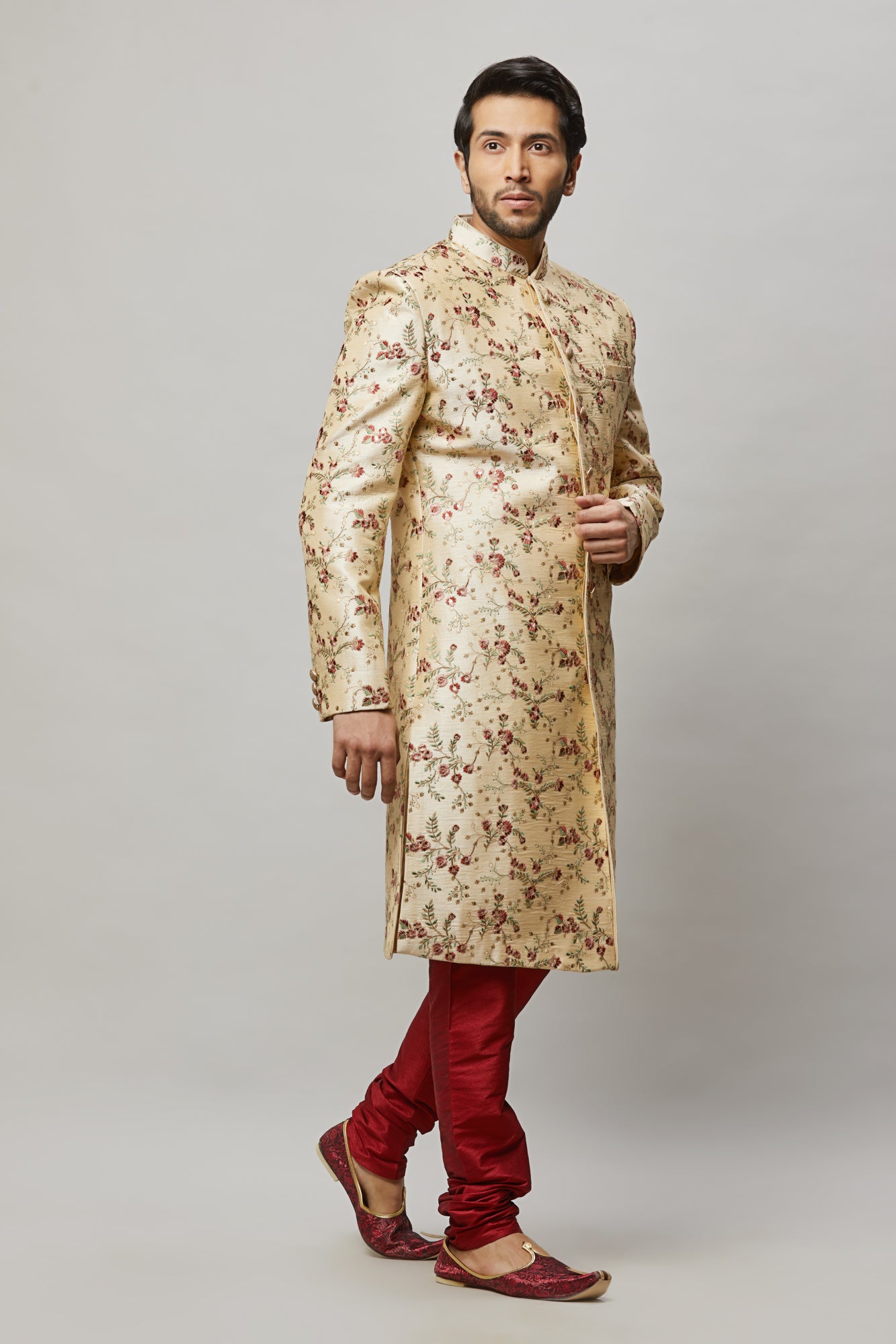 • Men's floral embroidered sherwani with shades of Red, Blush & Sage in the flowers and petal