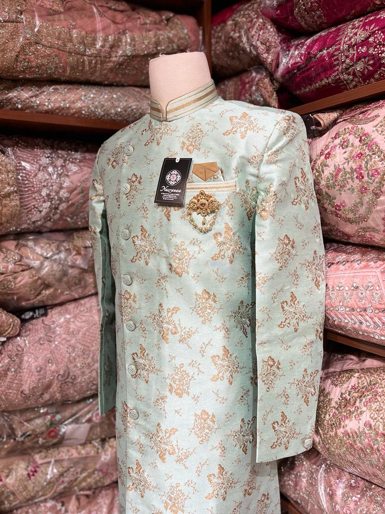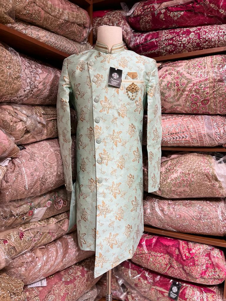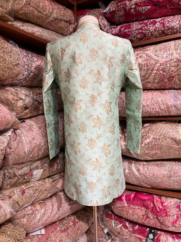 • Banarsi Brocade Asymmetric Indo Western with contrasting gold pants.