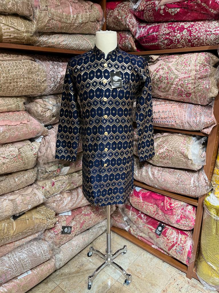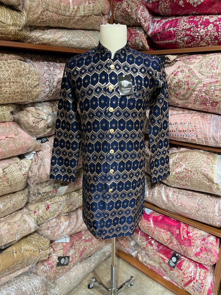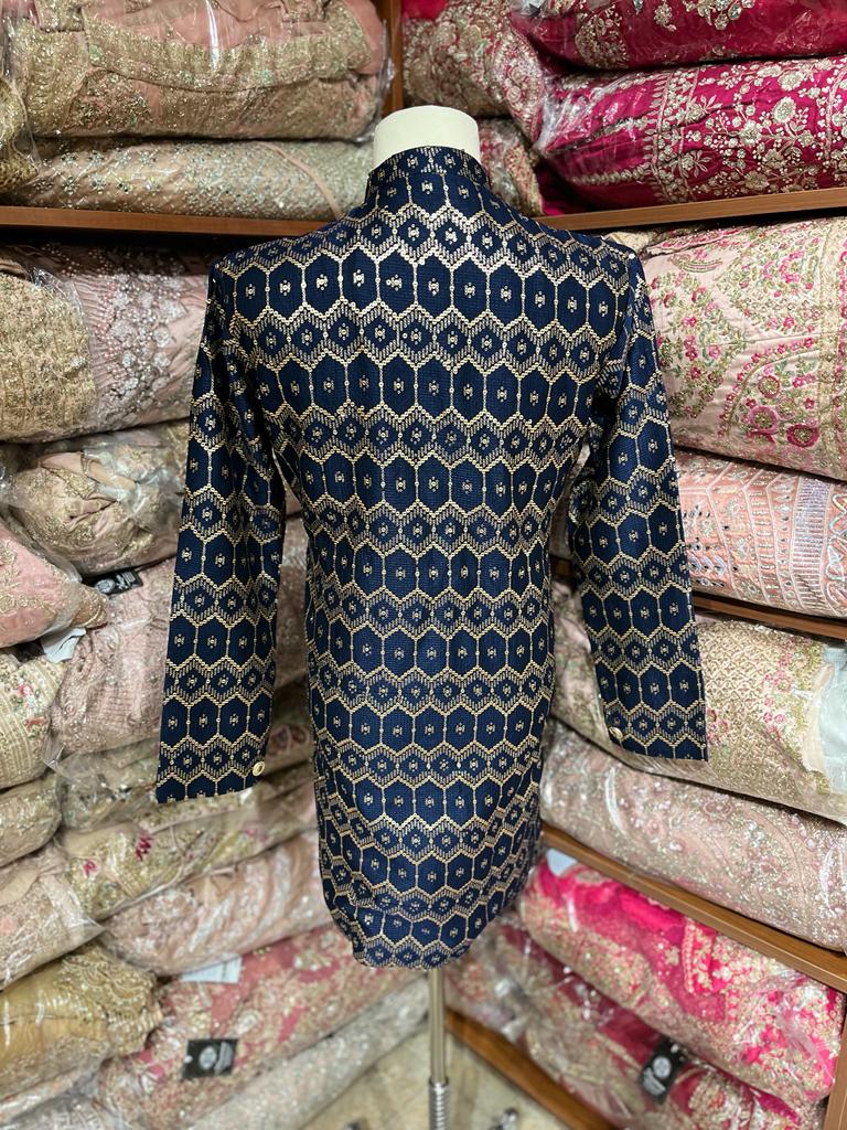 • Banarsi Brocade Asymmetric Indo Western with contrasting gold pants.