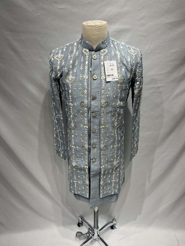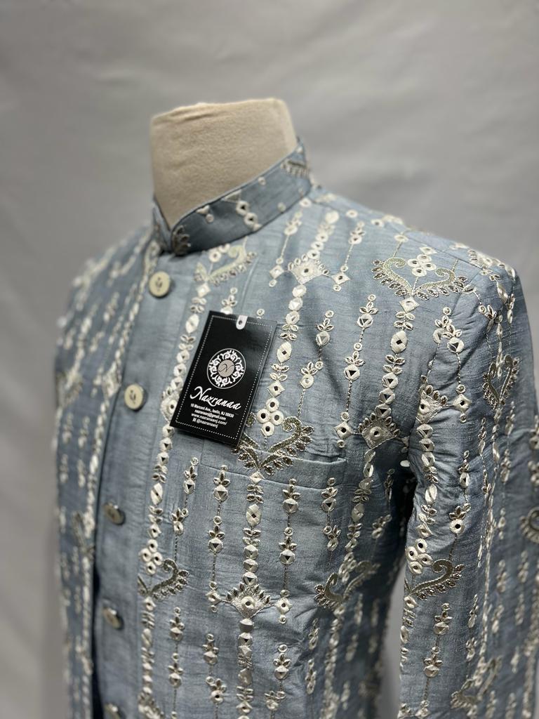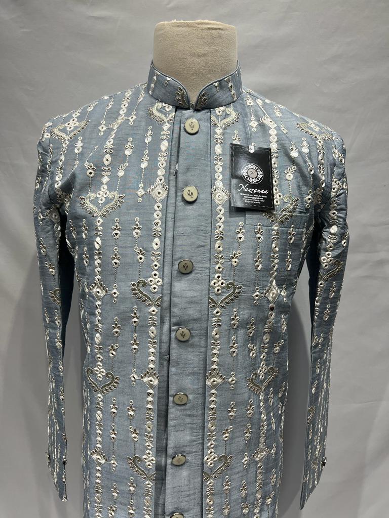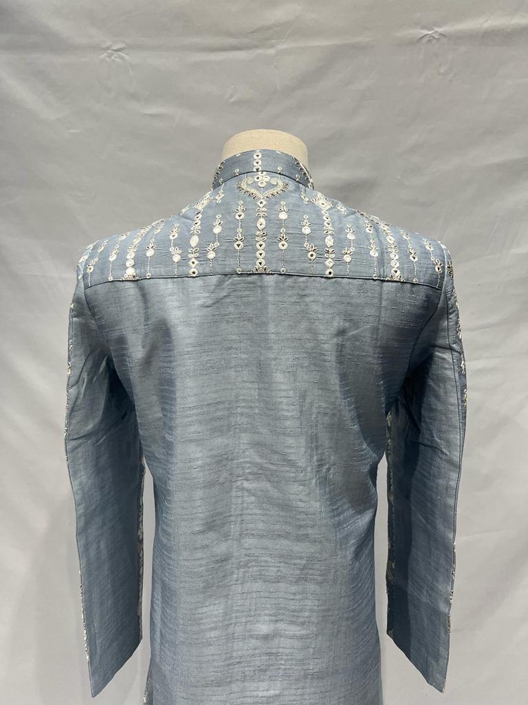 The Mens Indo-Western U2-S91 offers a striking design featuring mirror work with delicate thread embroidery. The combination of the two styles creates an eye-catching look that will make you stand out in the crowd. The intricate details of the thread work further enhance the overall style of the garment.