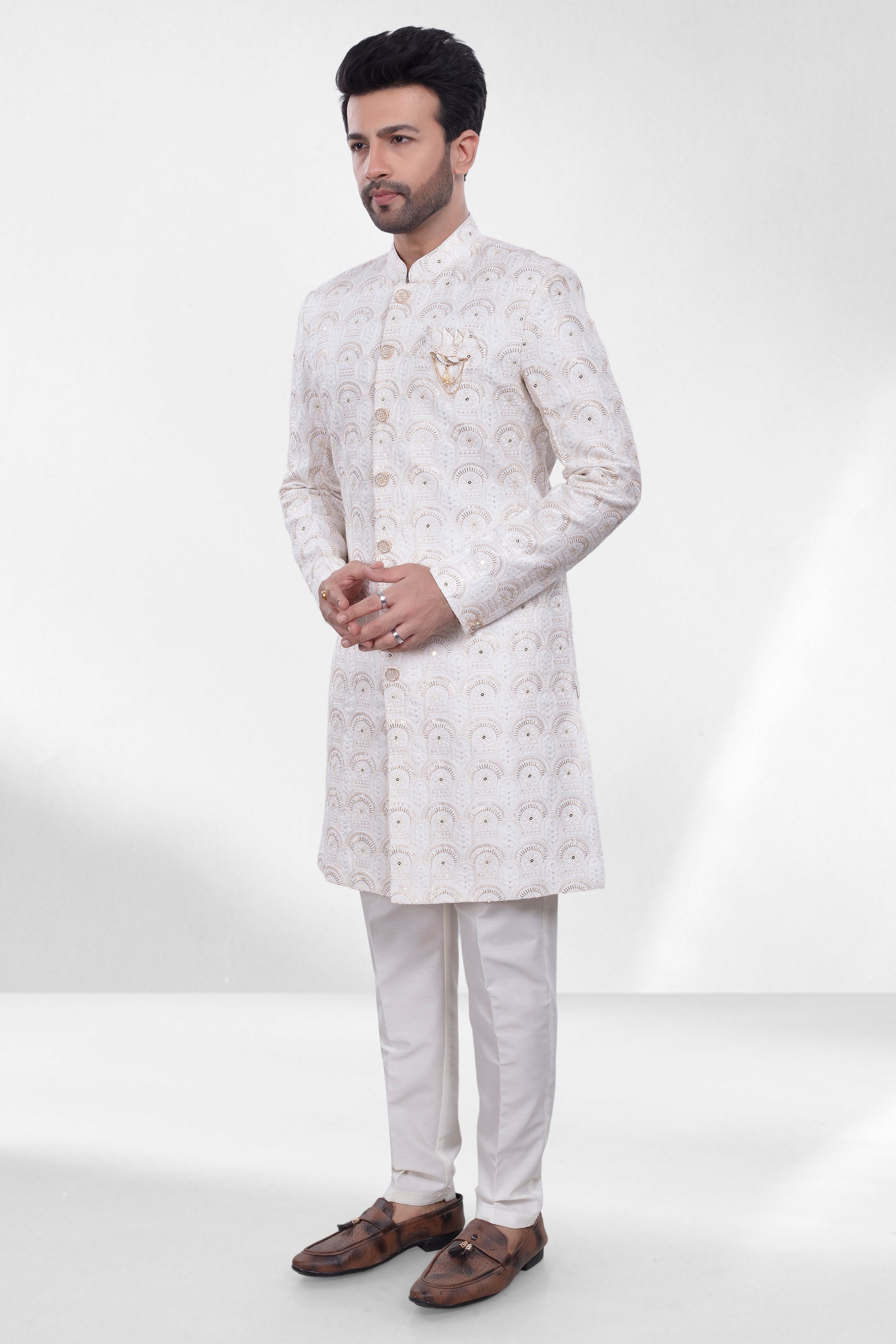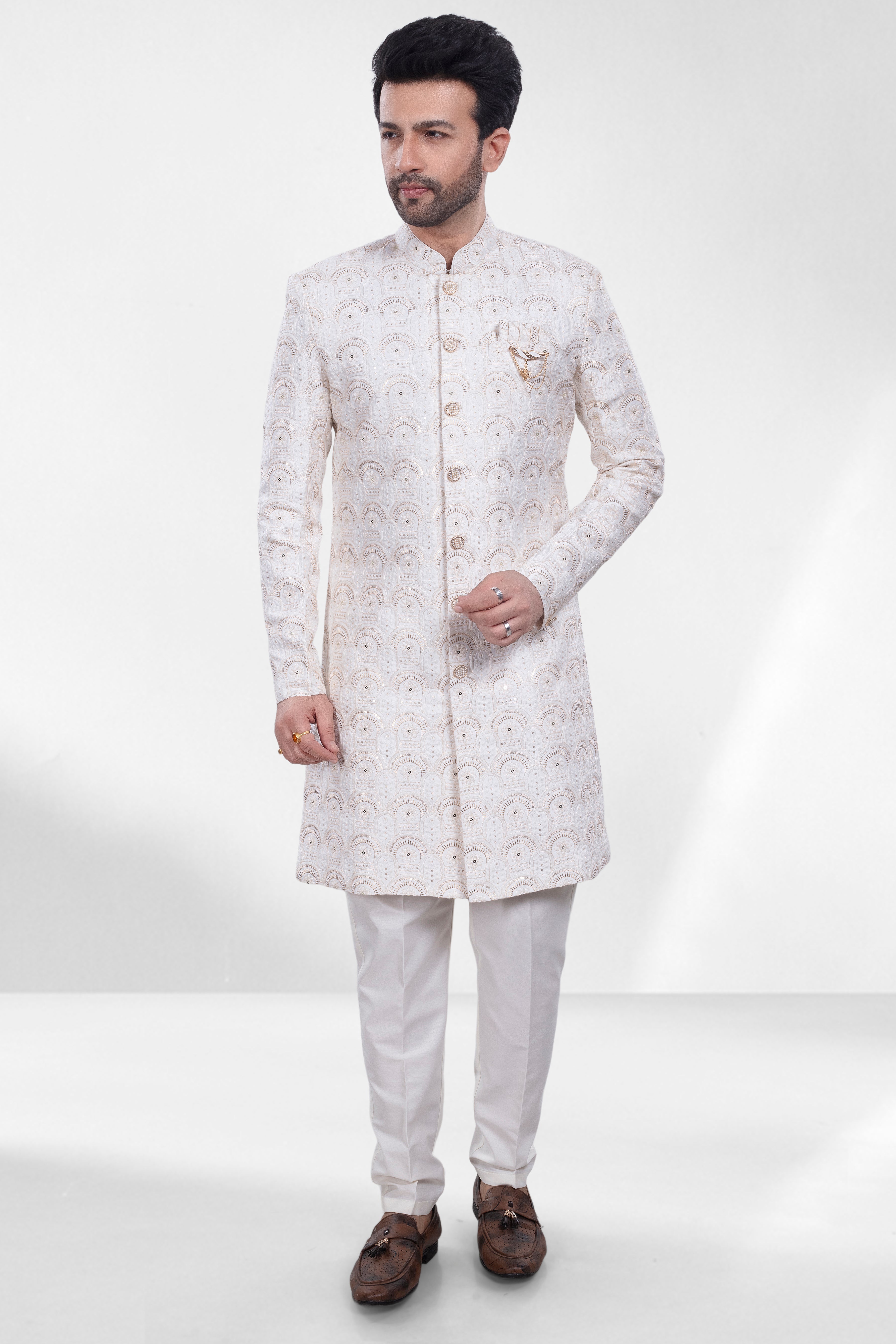 This ivory Indo-western features all-over thread and sequin embroidery, it's the perfect pick for a groom or wedding guest aiming for timeless sophistication.