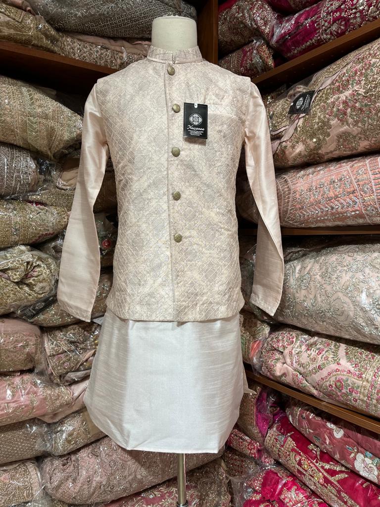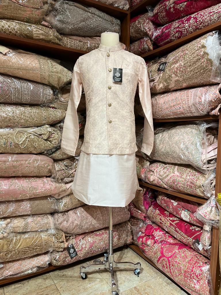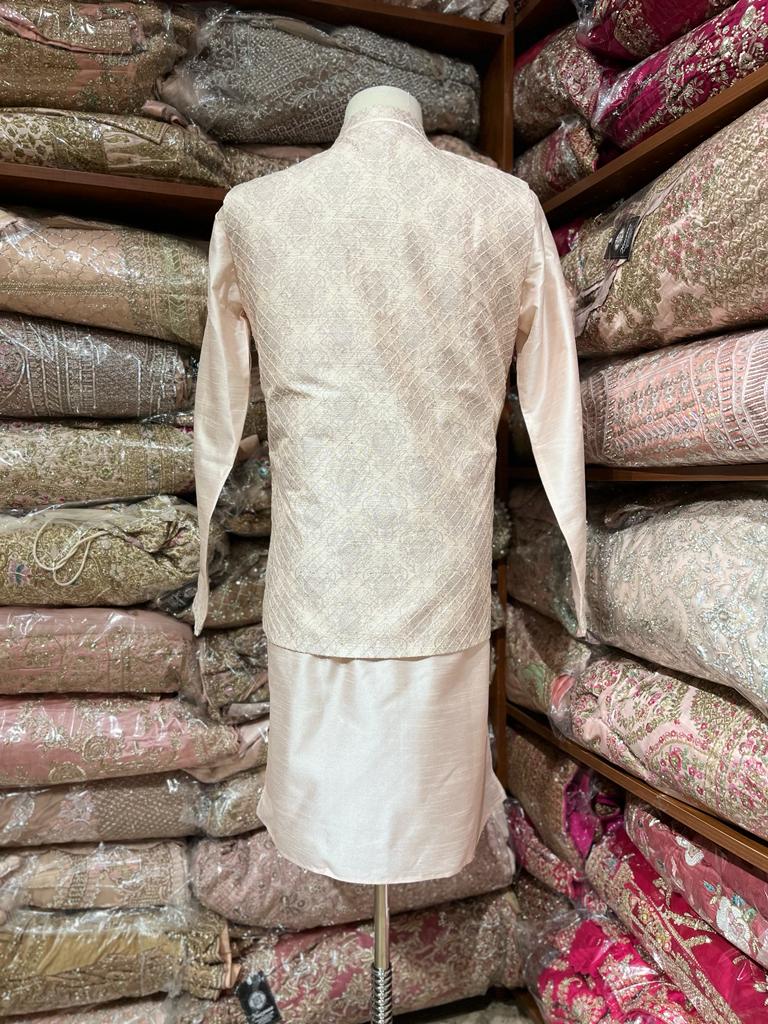 • Raw Silk Kurta with intertwined sequence and thread work on the vest plus contrasting gold pants.