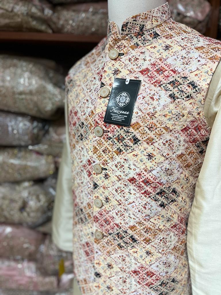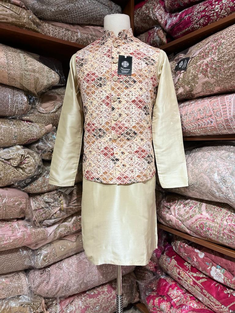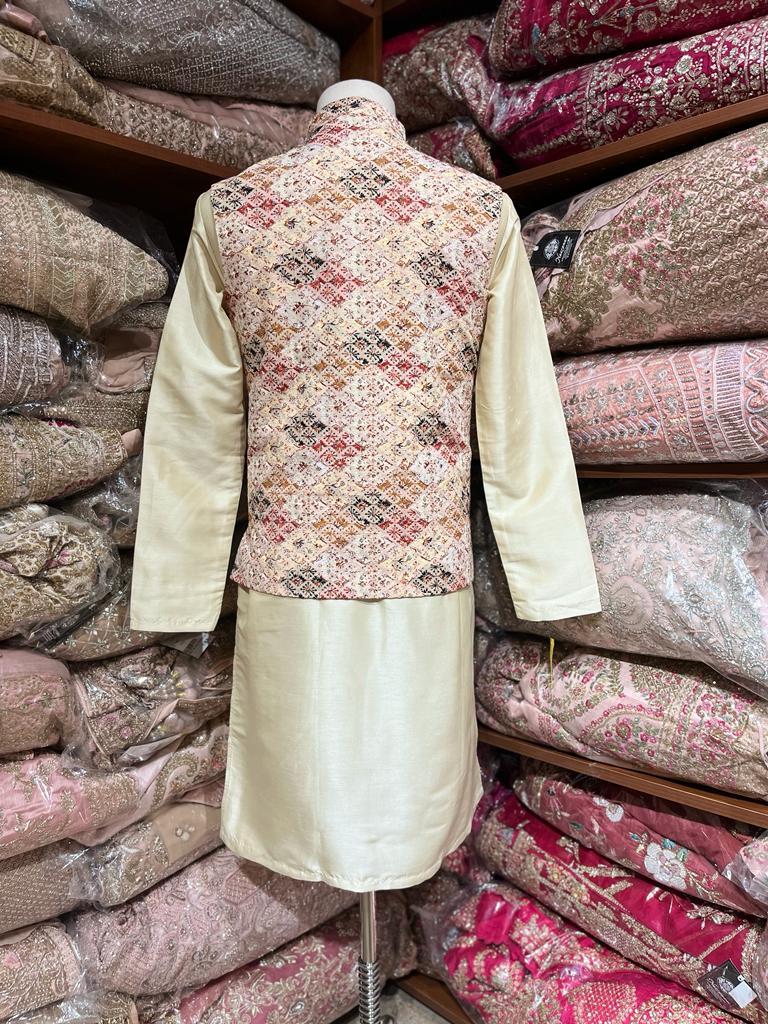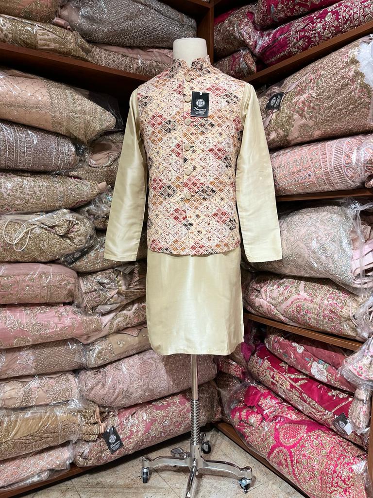 • Raw Silk Kurta with intertwined sequence and thread work on the vest plus contrasting gold pants.