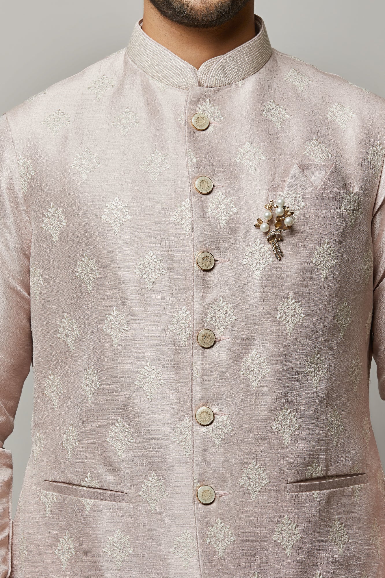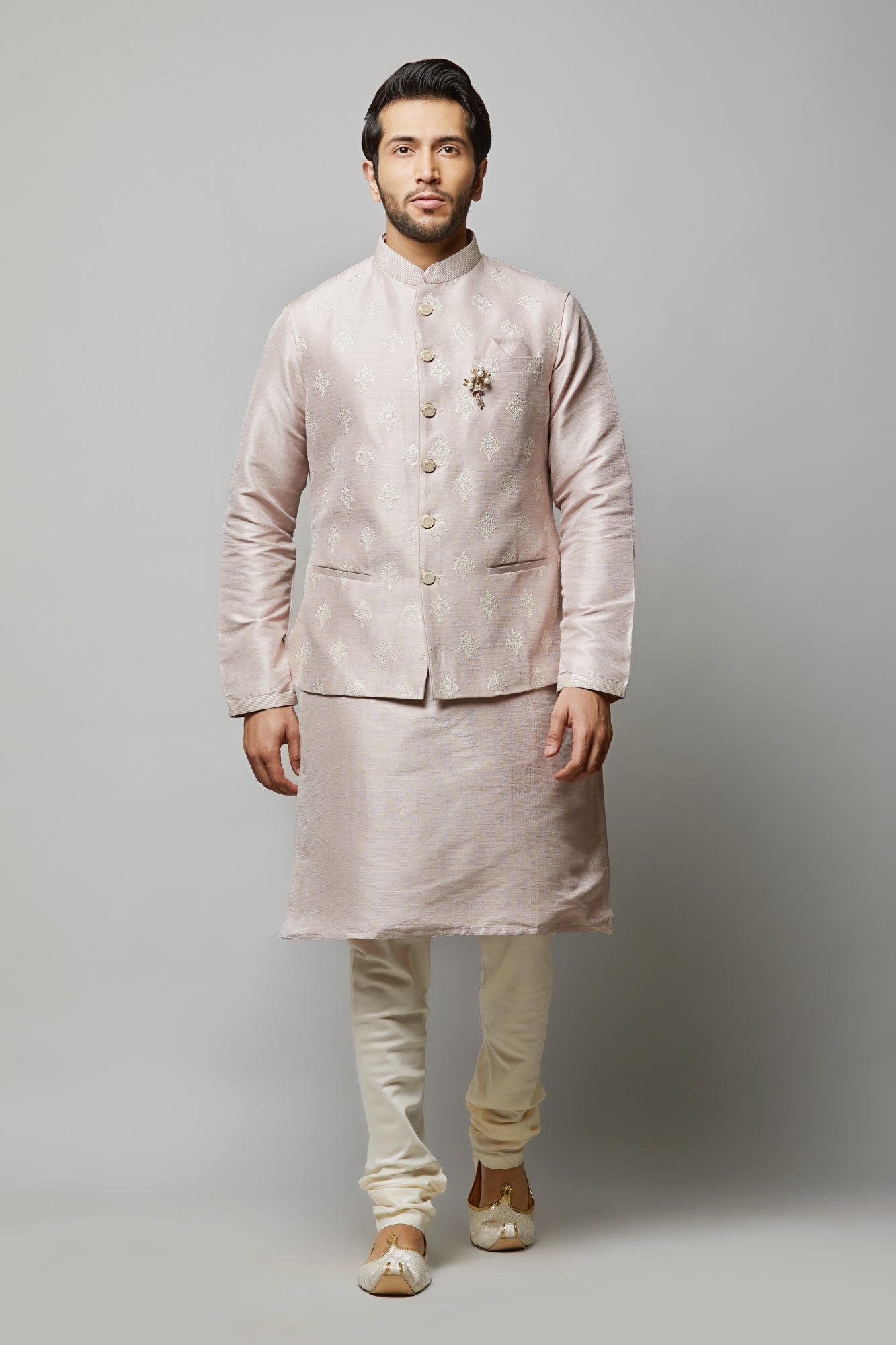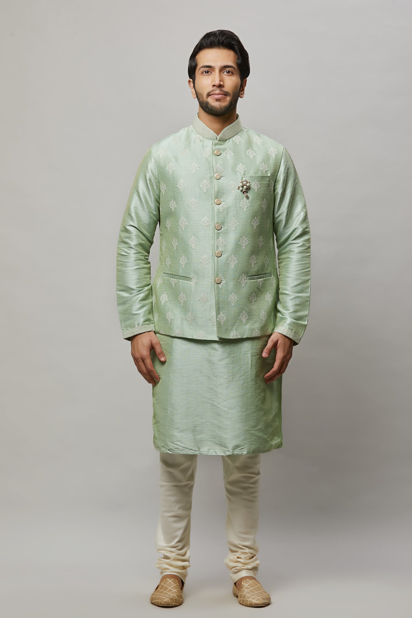 • Raw Silk Kurta with ivory thread embroidered vest plus ivory churidar.