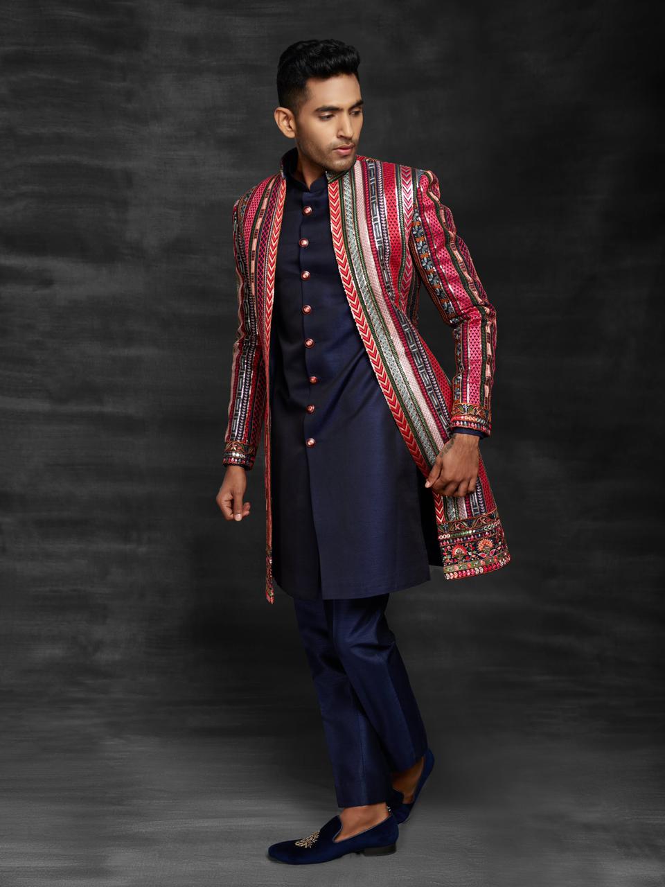 • This Multi-Color sherwani is an ideal wear for your sangeet. It's designed for maximum comfort. If you are the kind of groom who likes to dance at their sangeet, this sherwani is a solution to all your problems. This is a 2 layer sherwani, with the inside being a kurta and a multi-color jacket on the outside.